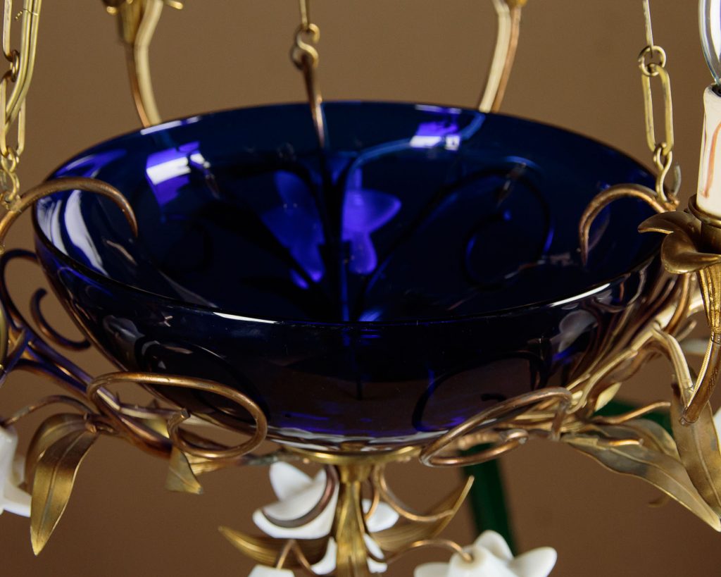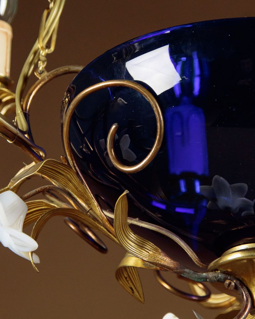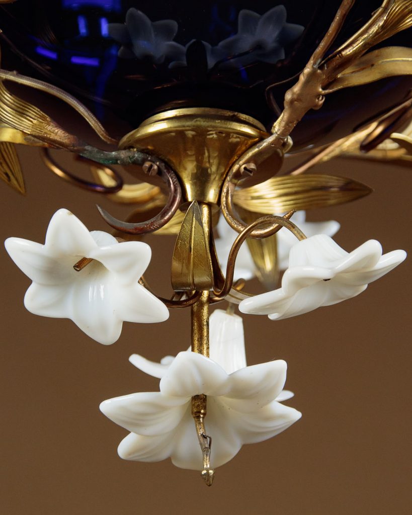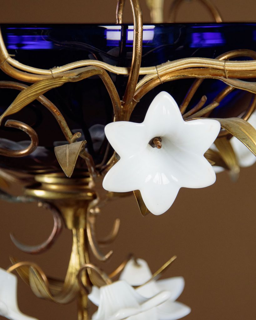 Unusual Art Nouveau chandelier hanging light c.1900. Six bulbs on a gilded brass frame of organic form with flower head shaped holders and applied leaves. Around a central cobalt blue glass bowl and with large white glass flowers heads to the underside. Hung from the original brass chair and ceiling hook. Rewired and ready to hang. Chains could be shortened if preferred.