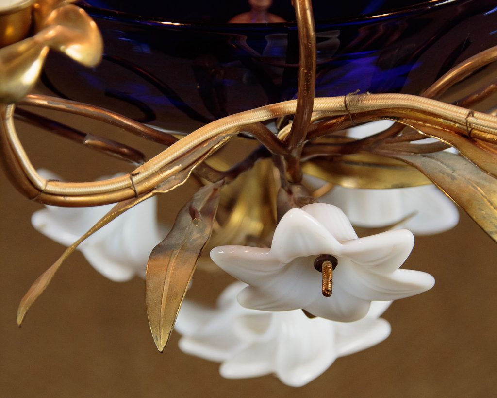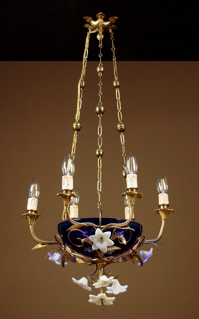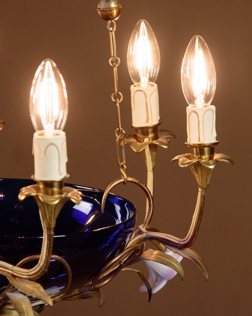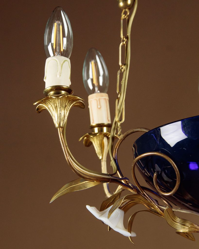 Unusual Art Nouveau chandelier hanging light c.1900. Six bulbs on a gilded brass frame of organic form with flower head shaped holders and applied leaves. Around a central cobalt blue glass bowl and with large white glass flowers heads to the underside. Hung from the original brass chair and ceiling hook. Rewired and ready to hang. Chains could be shortened if preferred.