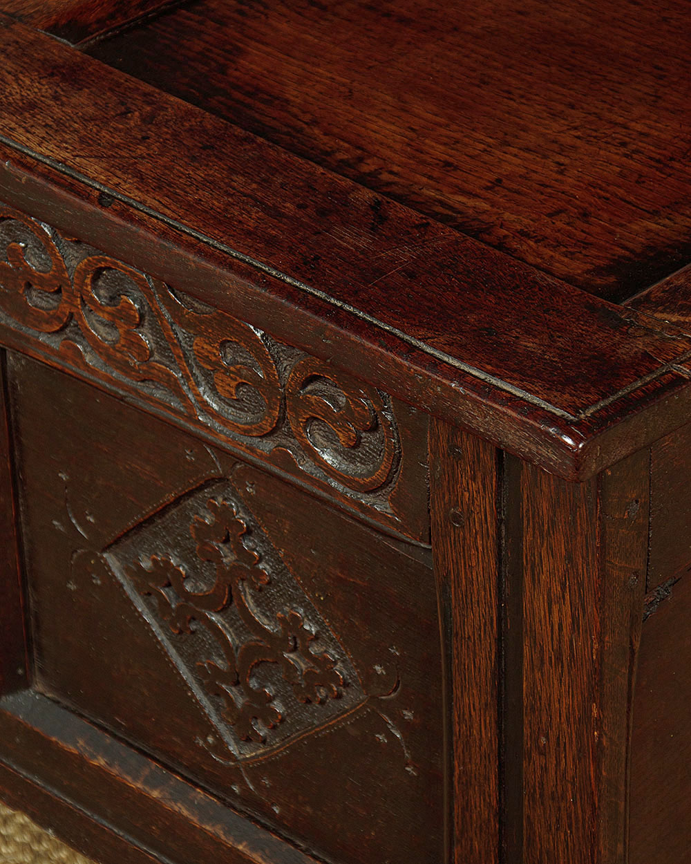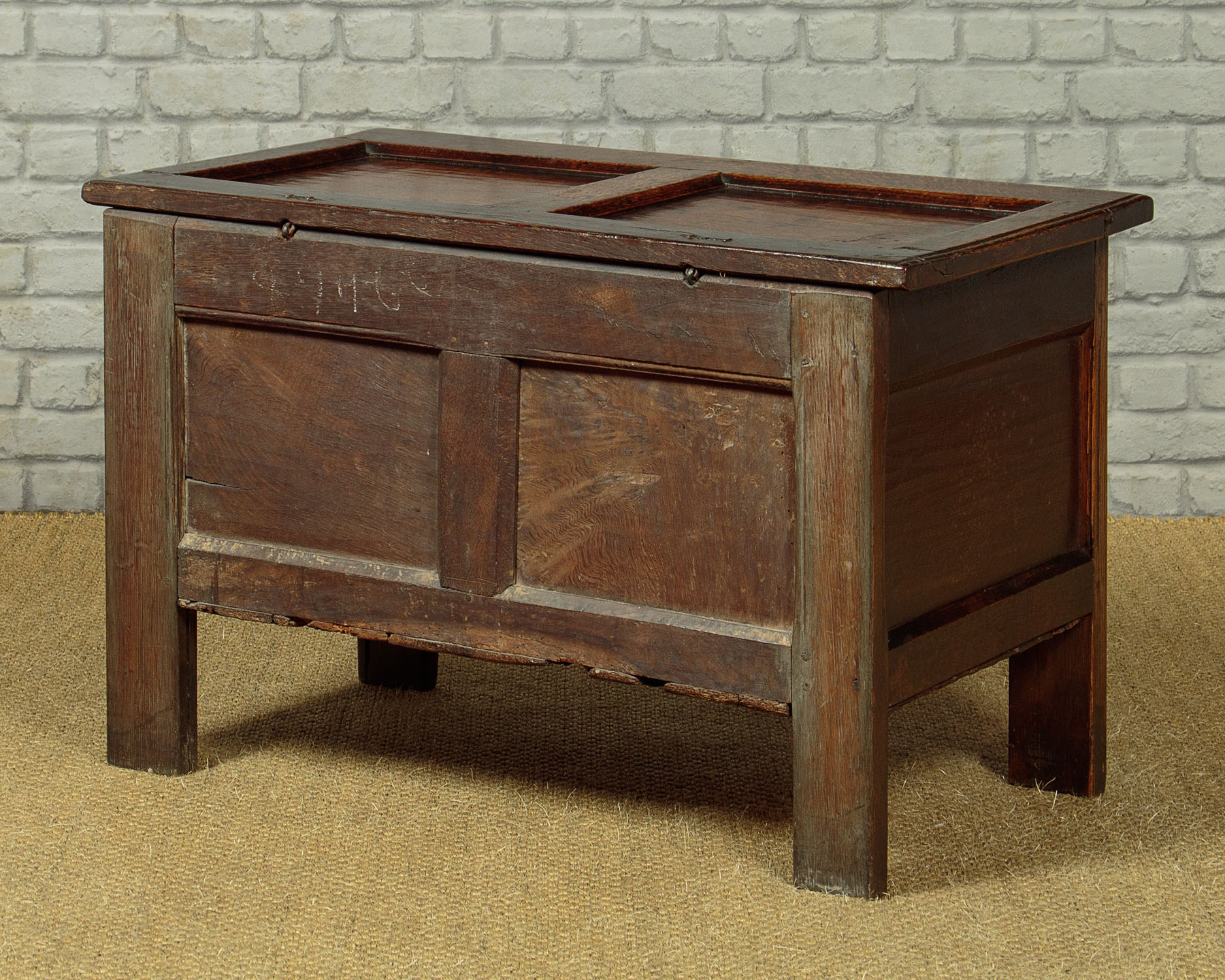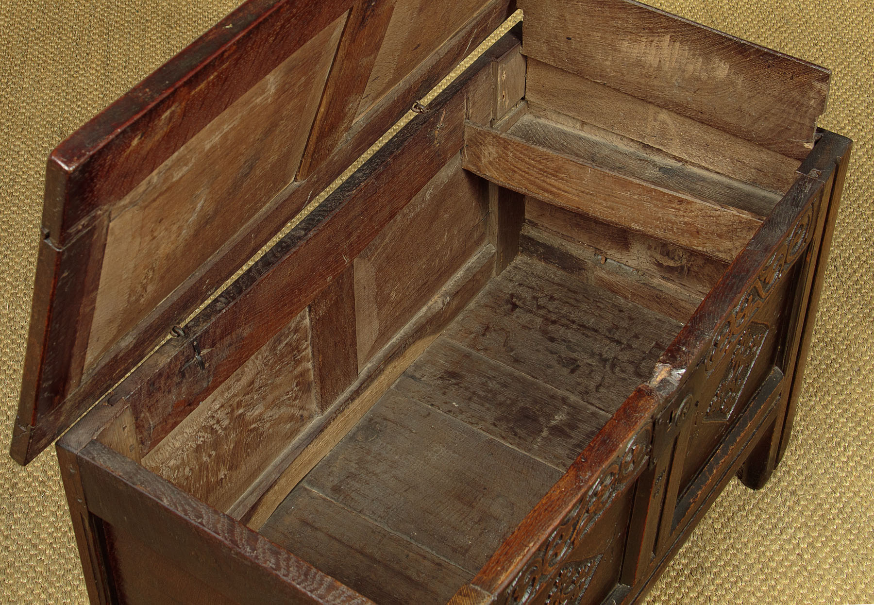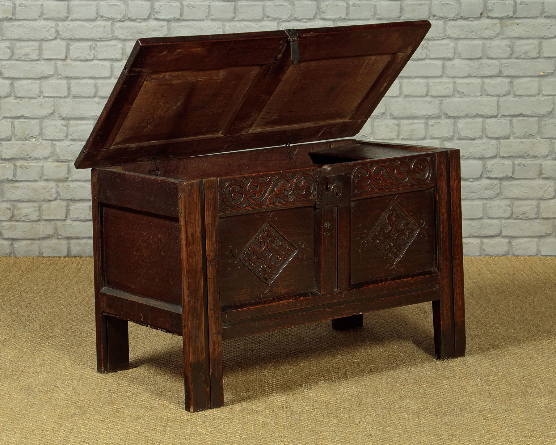 Unusually small early 18th.c. oak coffer c.1720. Just 33" wide. panelled lid opening on the original iron hoop hinges to reveal storage space inside plus a small compartment to the right hand side, the lid of which forms a stay for the lid of the chest. Particularly attractive carved detail to the front panels featuring a raised cross within a diamond lozenge with chip carved border and punched detail. Raised carving of scrolling foliage to the top rail. Moulded and chamfered centre mullion (stamped with the initials TP) and bottom rail. Oak panelled sides and back, oak floor boards. Some previous restorations with a later lock plate and replacement stiles. Excellent condition with particularly good colour to the top and front. Cleaned and waxed in our workshops.