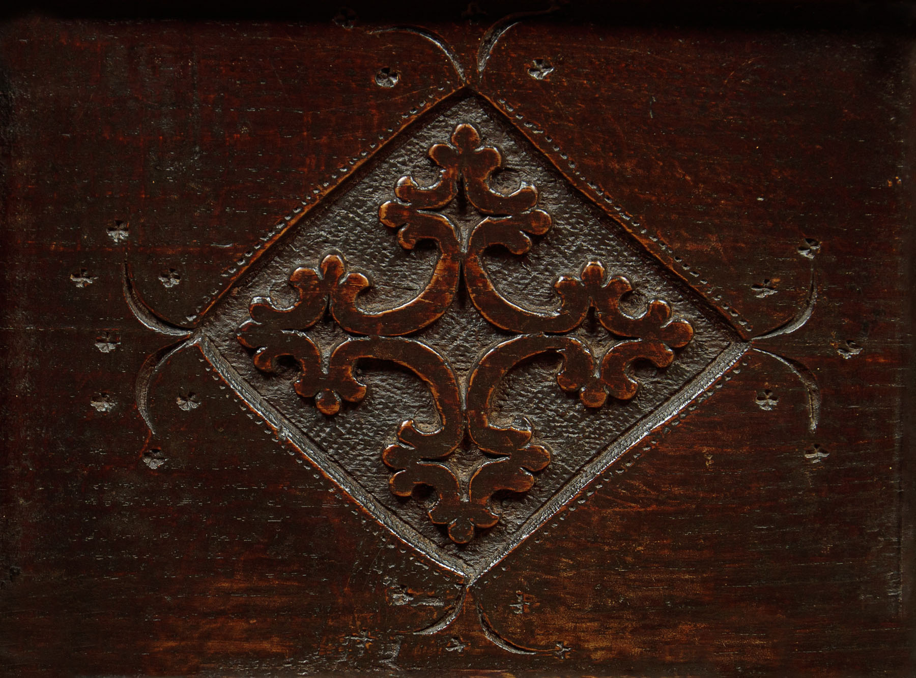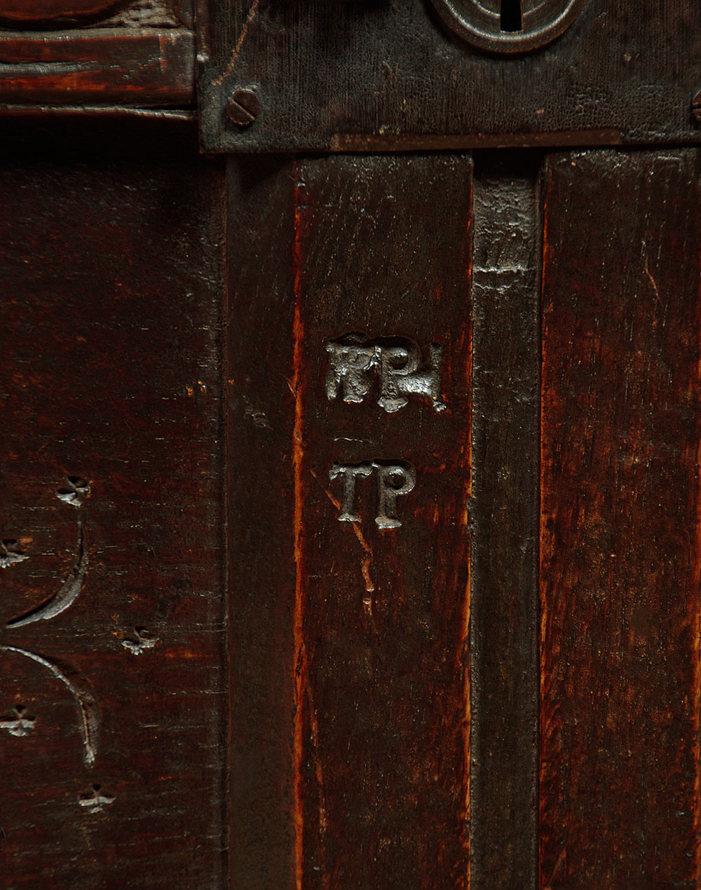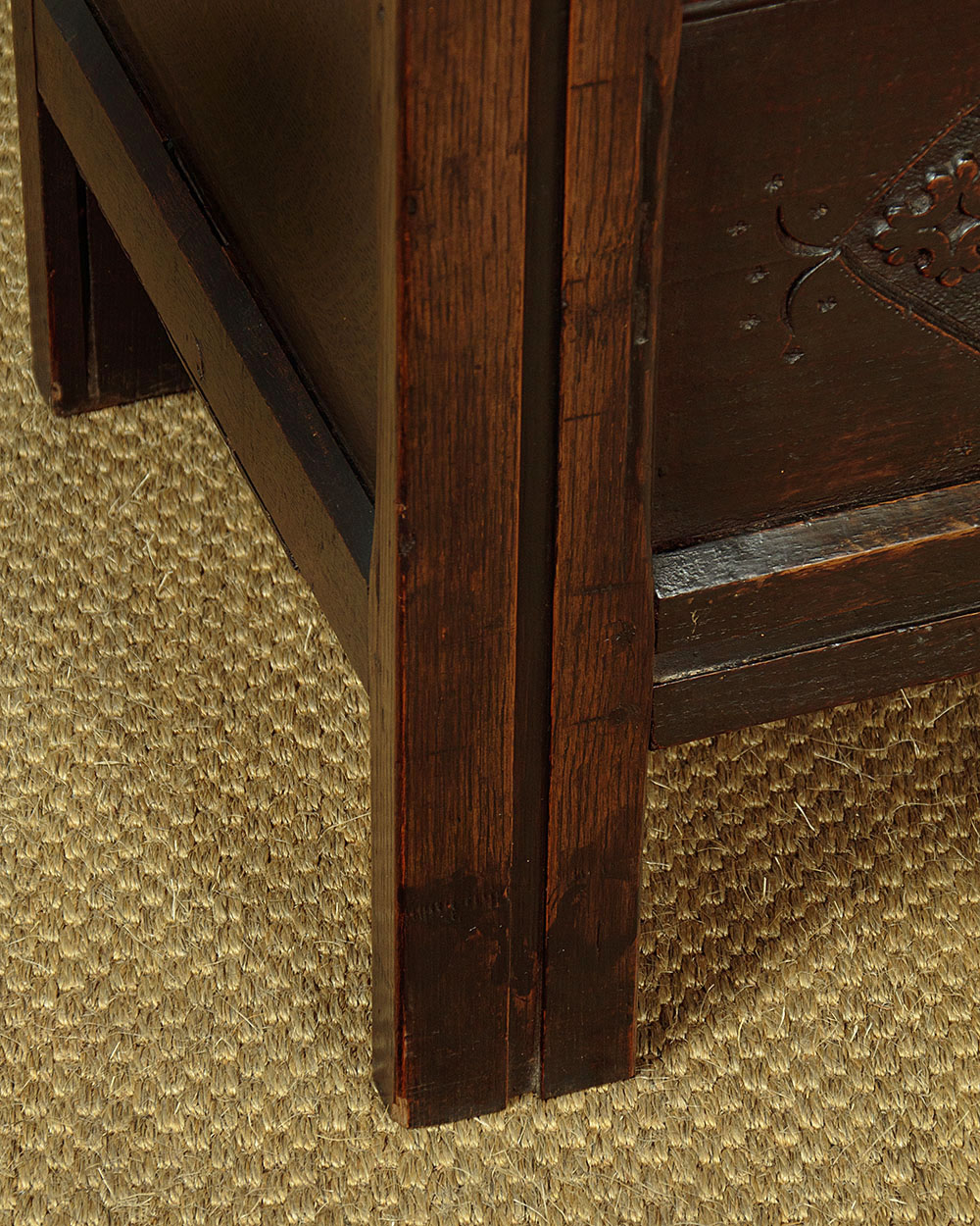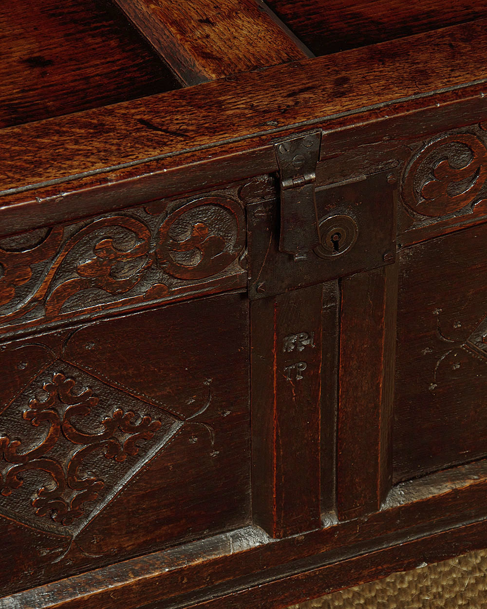 Unusually small early 18th.c. oak coffer c.1720. Just 33" wide. panelled lid opening on the original iron hoop hinges to reveal storage space inside plus a small compartment to the right hand side, the lid of which forms a stay for the lid of the chest. Particularly attractive carved detail to the front panels featuring a raised cross within a diamond lozenge with chip carved border and punched detail. Raised carving of scrolling foliage to the top rail. Moulded and chamfered centre mullion (stamped with the initials TP) and bottom rail. Oak panelled sides and back, oak floor boards. Some previous restorations with a later lock plate and replacement stiles. Excellent condition with particularly good colour to the top and front. Cleaned and waxed in our workshops.