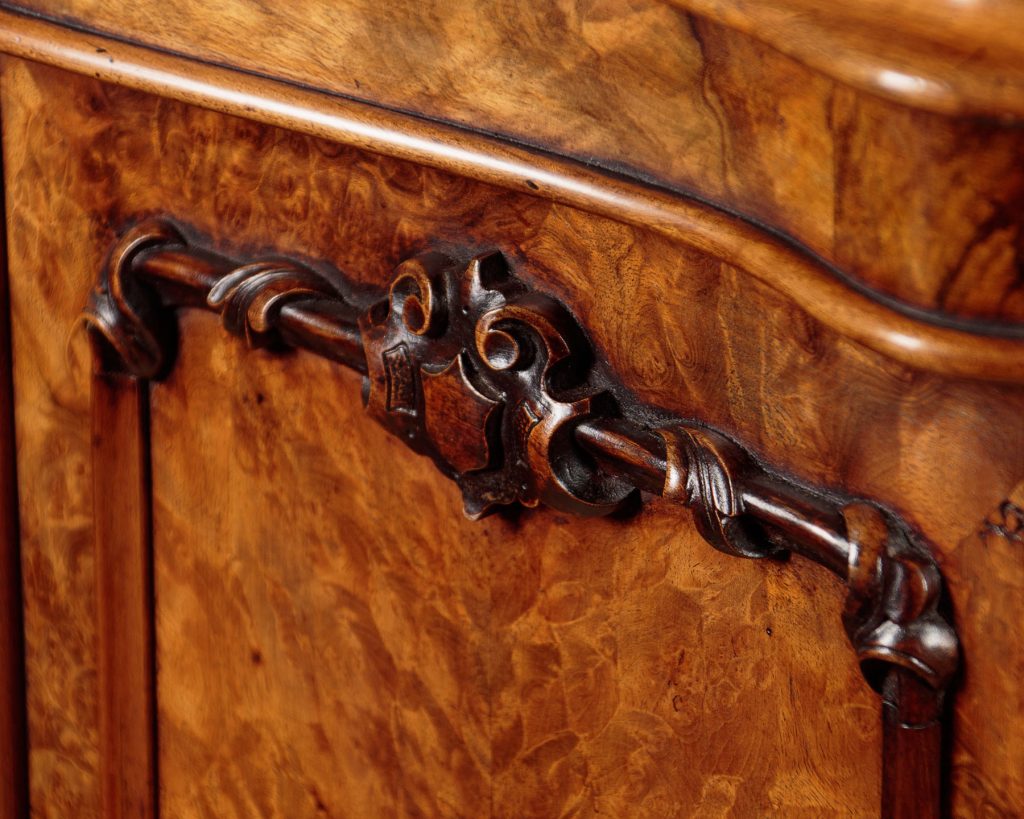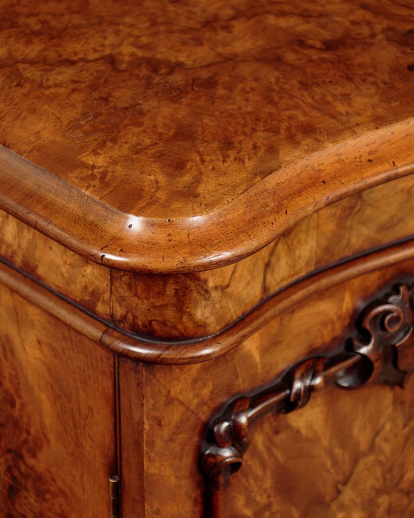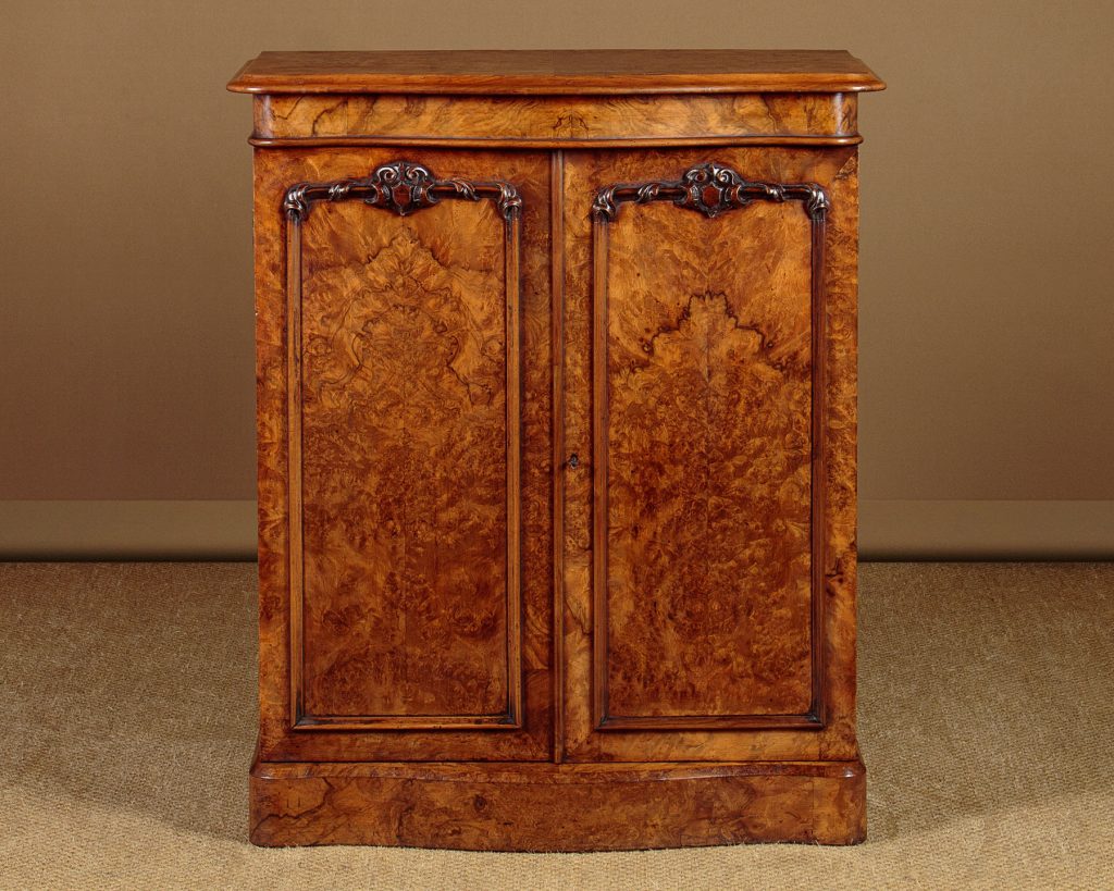 Unusually narrow mid 19th.c. burr walnut chiffonier or side cabinet c.1860. Just 30" wide, fitted inside with a single shelf (internal depth 11"). Beautifully figured burr walnut veneers across the top, front and sides. Serpentine shaped and thumb moulded edge to the top. Two doors with raised mouldings and crisply carved detail above the panels. Raised on a chamfered plinth, also serpentine fronted and veneered to match. Excellent colour and condition, cleaned and waxed in our workshops. Key supplied.