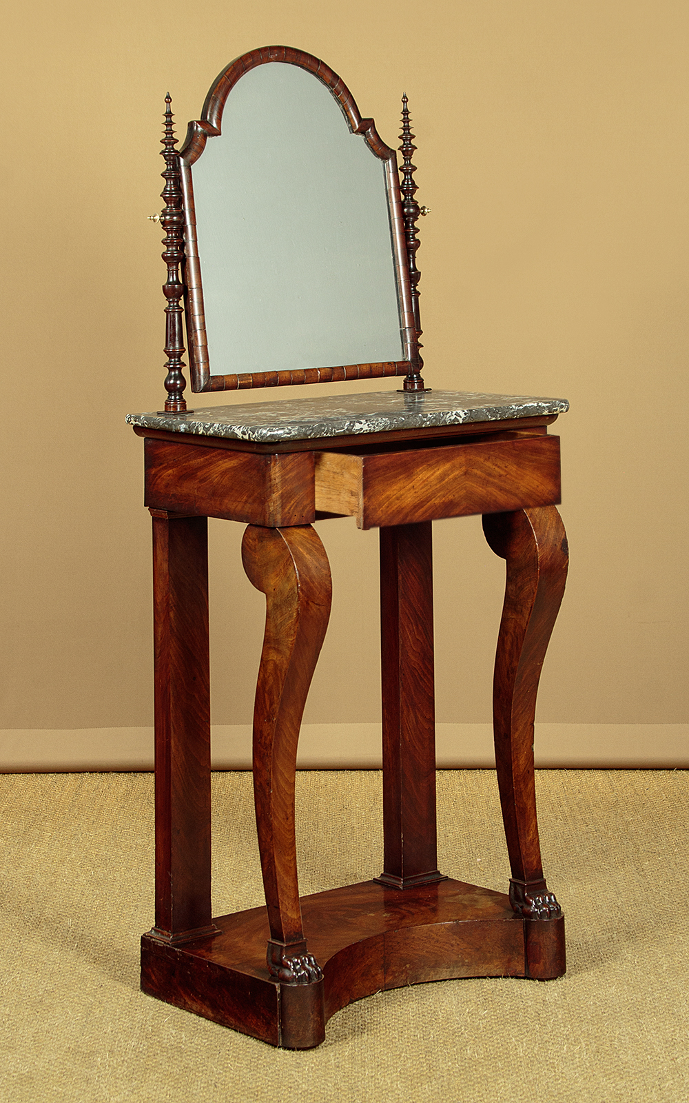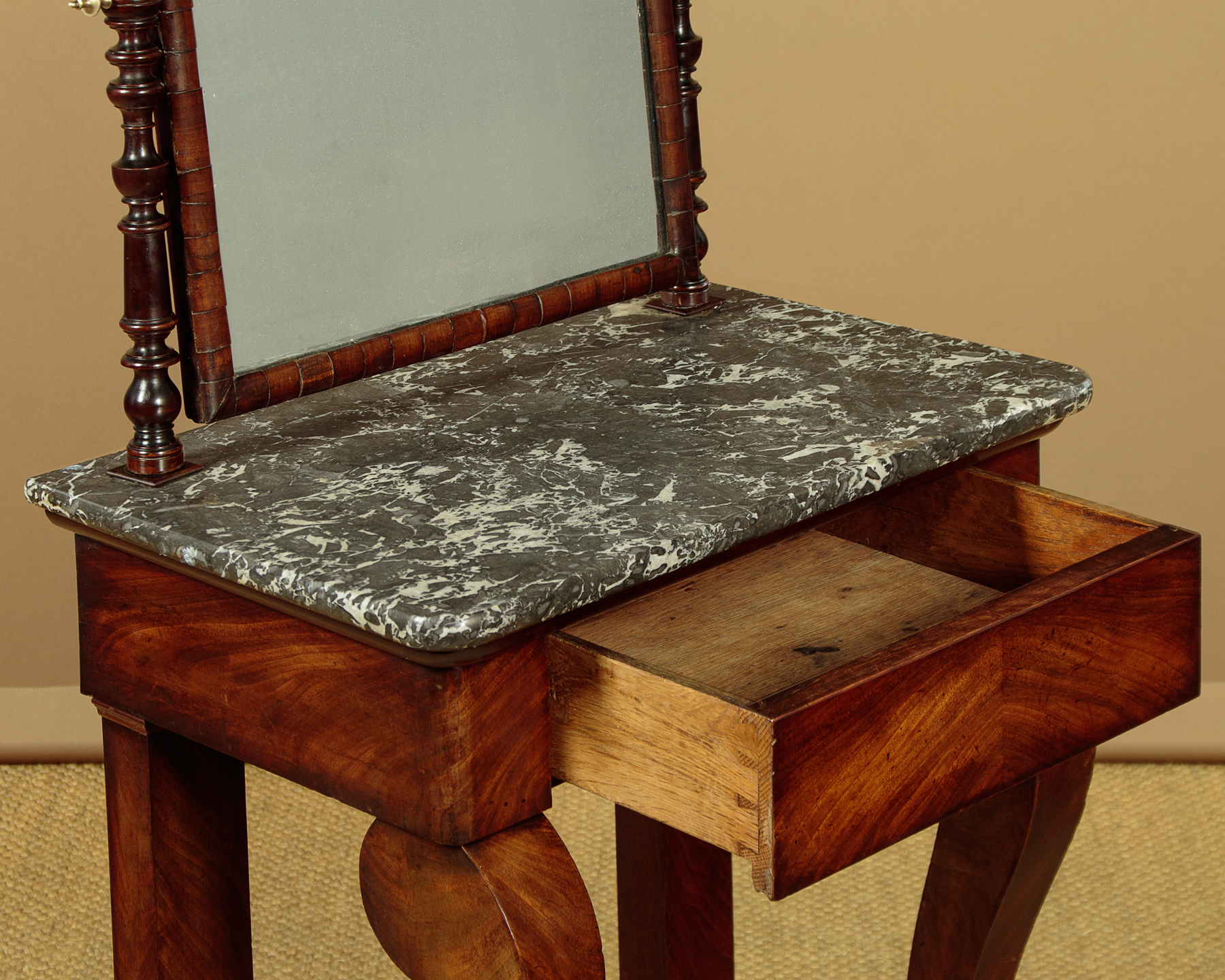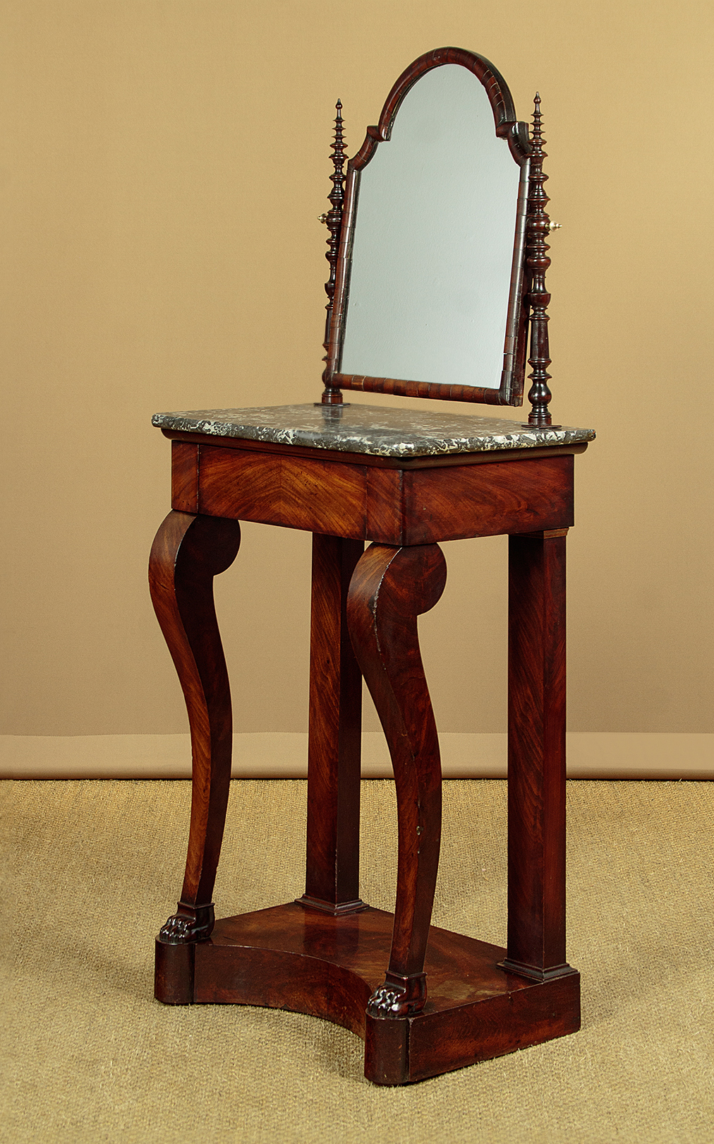 Unusual little early 19th.c. French mahogany dressing table c.1830. Useful slim dimensions, just 22½" wide. Original 14½" x 19" mirror plate within an ogee shaped frame in crossbanded mahogany. Angle adjustable on fine bobbin turned columns with pointed finials and threaded brass fittings. Well figured grey marble table top over a single drawer. Flame mahogany veneered base with tapering cabriole front legs with carved claw feet. Raised on a plinth veneered to match and with a concave front edge. Some wear and repair to the veneers and the mirror is a little clouded (could be replaced if preferred). Generally very good condition, cleaned and waxed in our workshops.