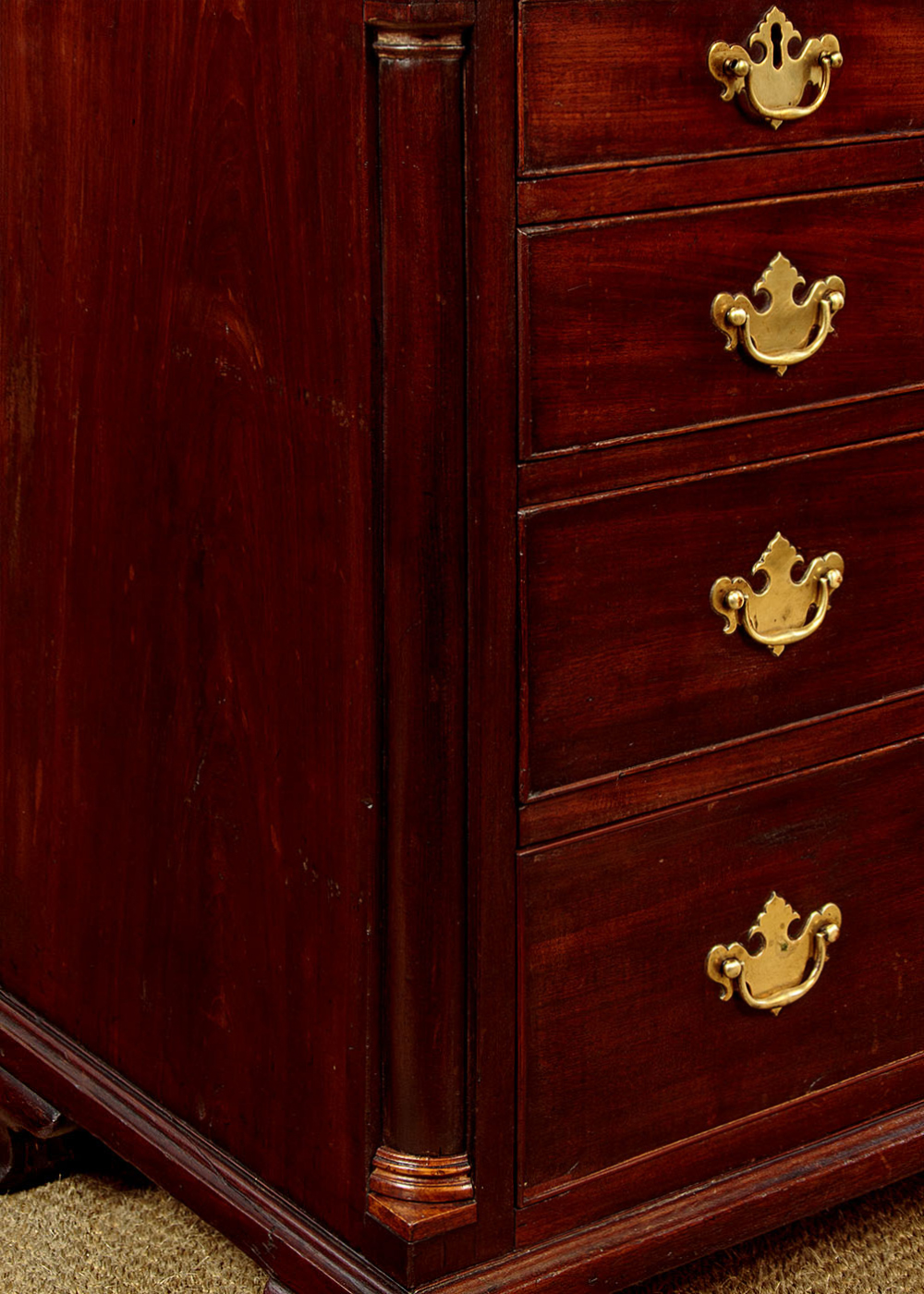 Small George III mahogany bachelor's chest of drawers c.1780. Just 32" wide. Single piece solid mahogany top with a moulded edge. Over two short drawers and three long drawers of graduated height. Solid mahogany drawer fronts with cockbeaded edges and the original brass handles (one replacement grip and pommels) and lockplates. Flanked with turned quarter columns with contrasting wooden capitals and bases. Ogee moulding around the base and raised on short shaped bracket feet. Solid mahogany sides and oak drawer linings. Excellent colour and condition, restored cleaned and waxed in our workshops.