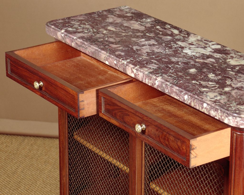 Smart little mahogany and marble top bookcase c.1930. 1¼" thick well figured marble top with a moulded edge over two small drawers and a two doors with brass wire work grills, fitted with two adjustable shelves inside (internal depth 10"). Gilded brass knobs, moulded drawer fronts, corners and side panels. Raised on short turned and fluted legs front and rear. Excellent condition, cleaned and waxed in our workshops. Key supplied.