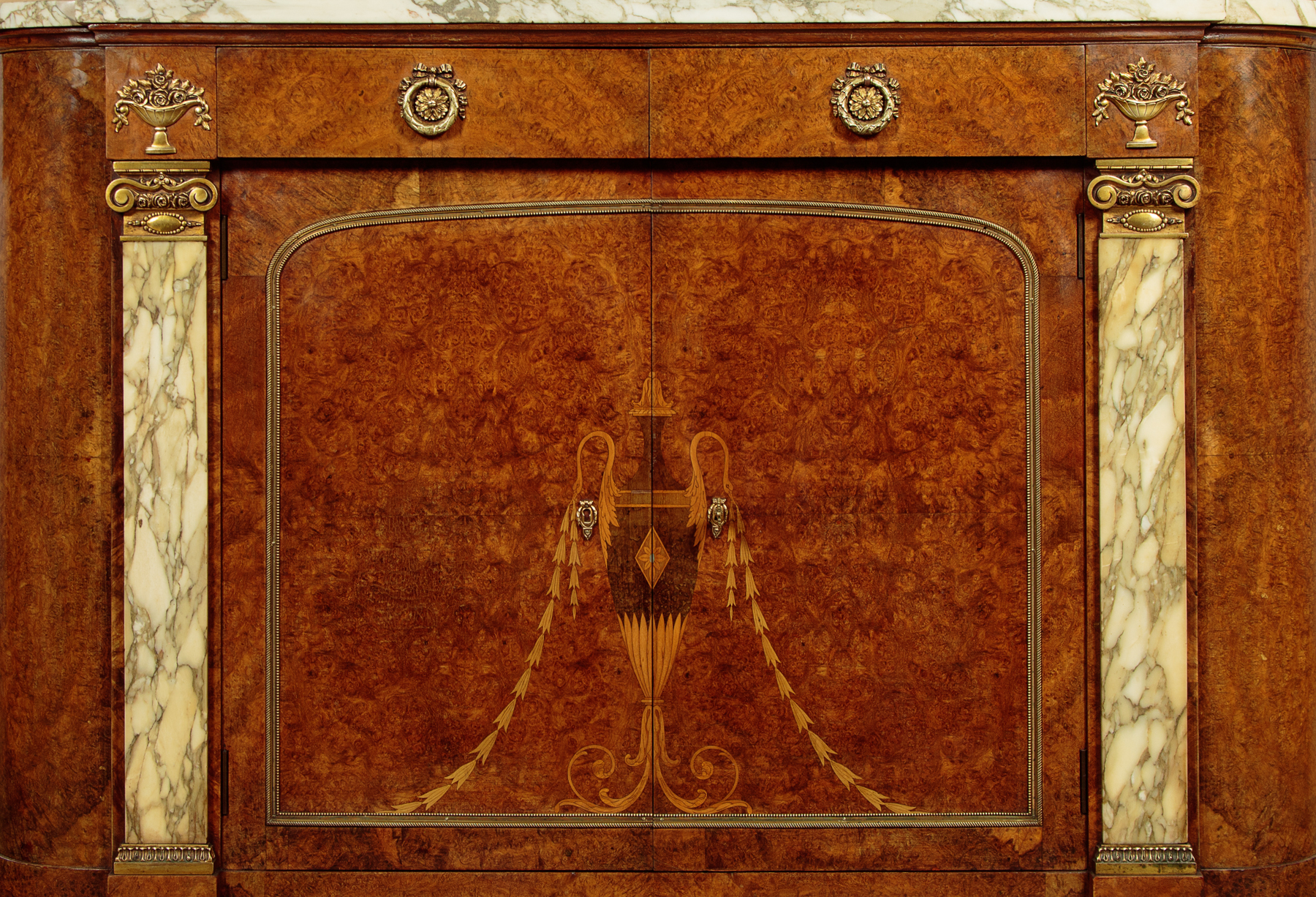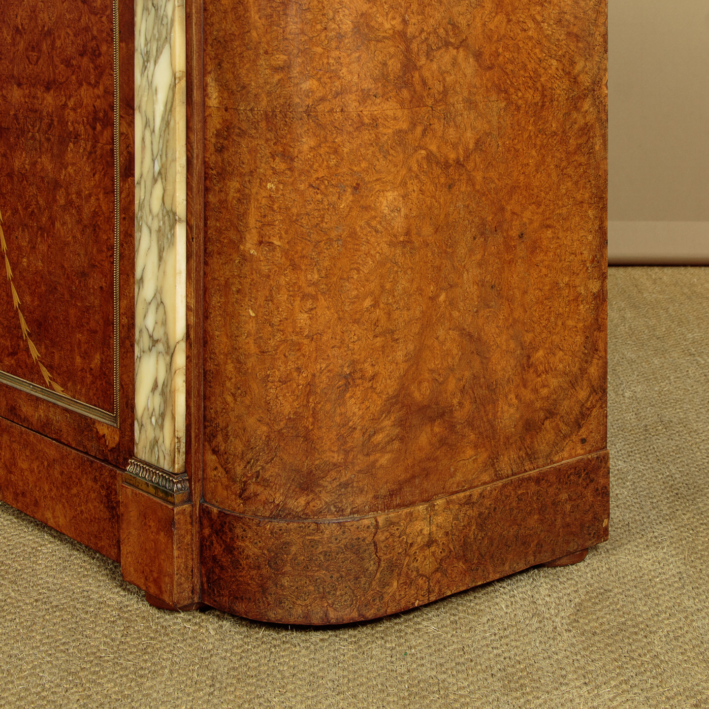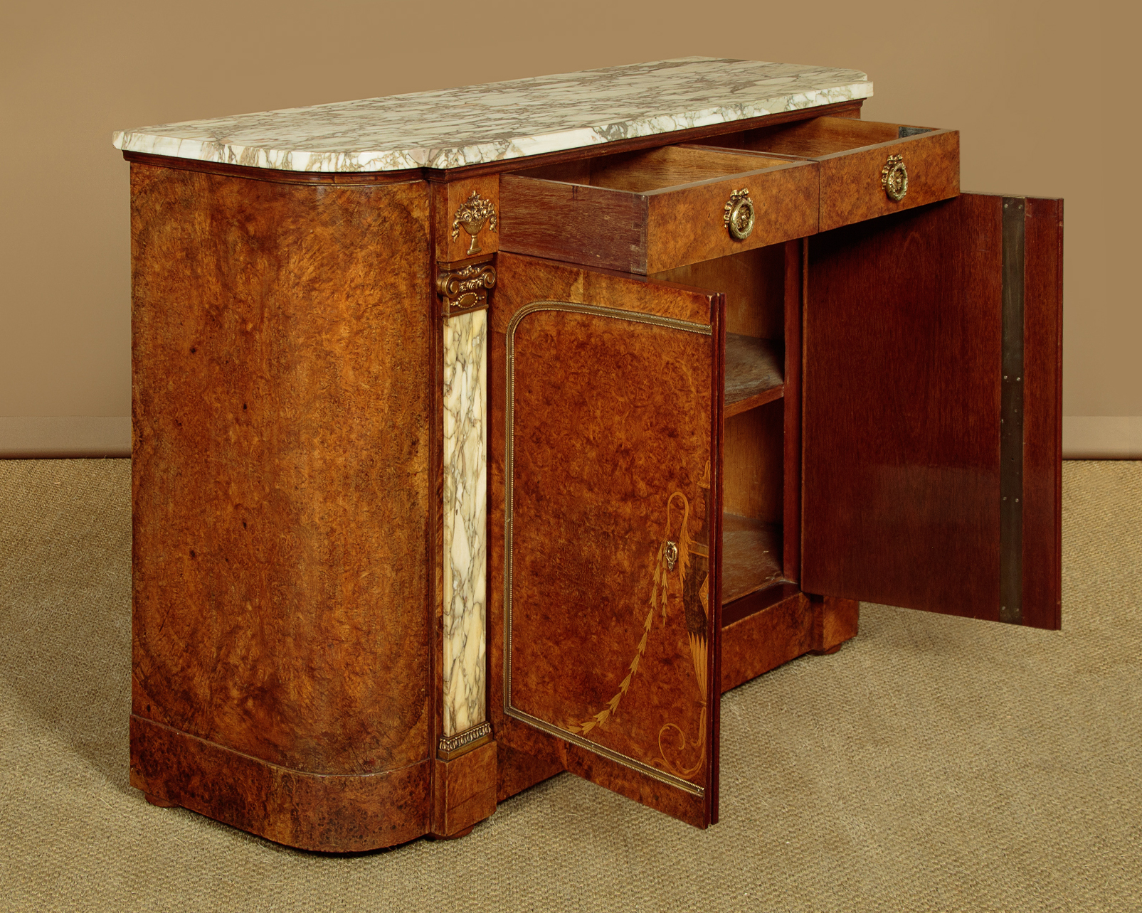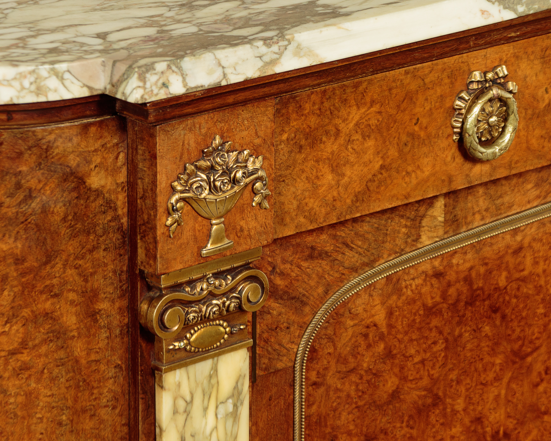 Very smart marble top sideboard by the Paris maker Guerin c.1920. White marble top with pronounced grey figuring, breakfronted and with rounded ends. Over two drawers and a two door cupboard fitted with a single shelf inside (internal depth 13"). Highly figured burr elm veneers laid in striking symmetrical pattern across the front and sides. With unusual neo-Classical decoration to the front featuring marble column pilasters with gilded mounts top and bottom flanking a marquetry inlaid vase detail to the doors. Original gilded handles, floral mounts and mouldings. maker's label for Guerin Freres inside the right hand drawer. Excellent colour and condition, cleaned and waxed in our workshops. Key supplied.