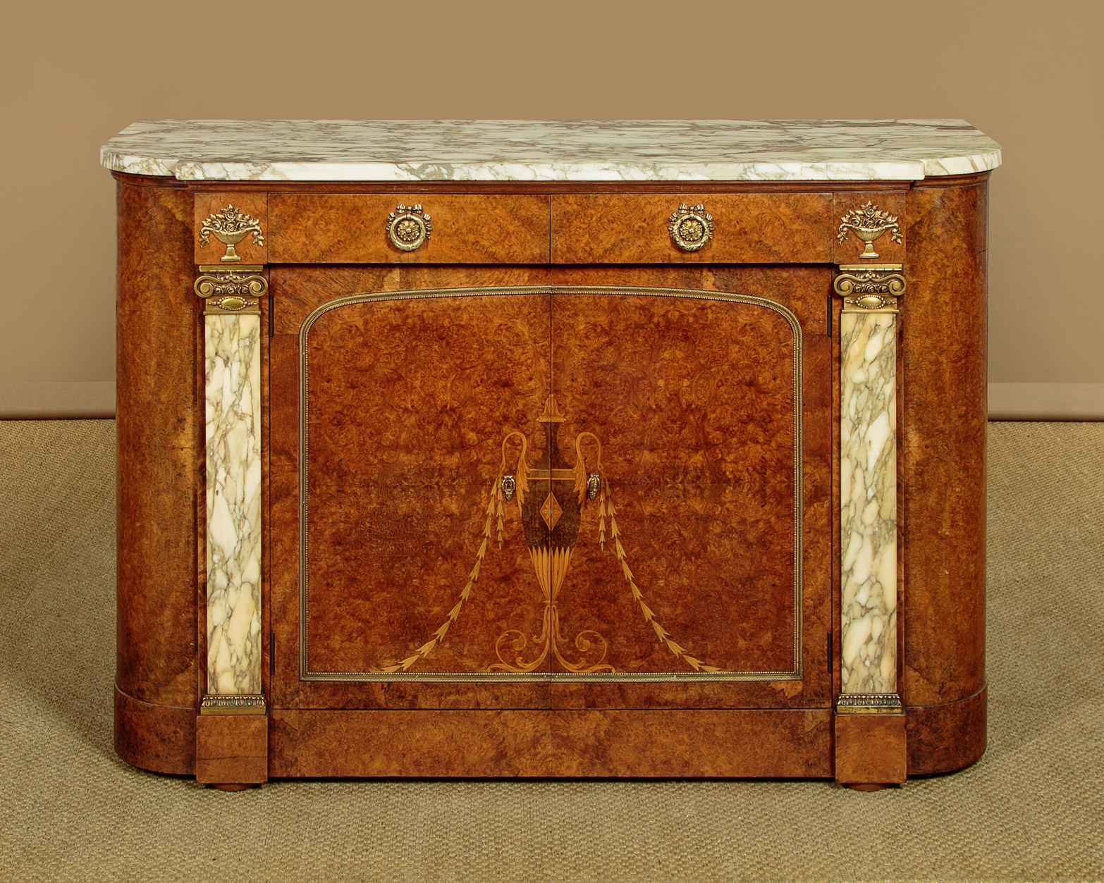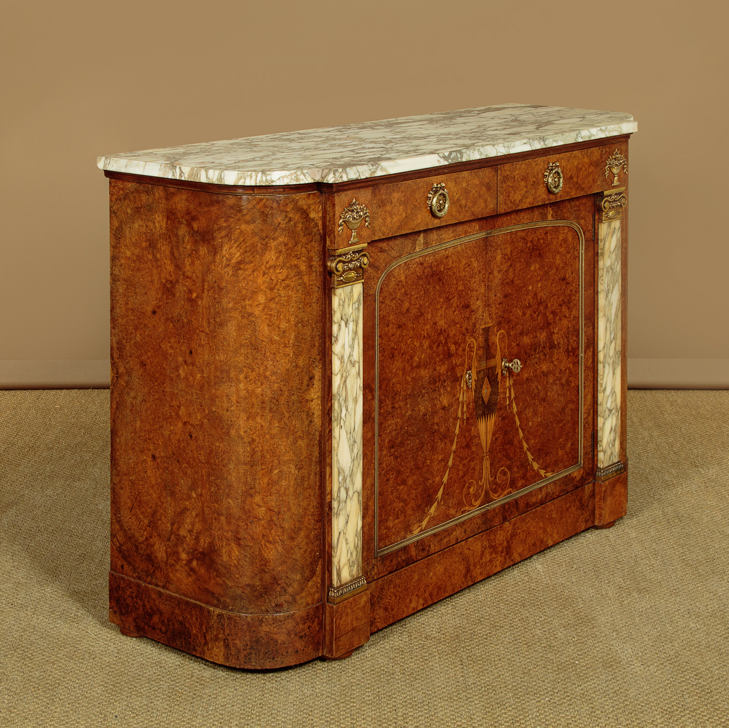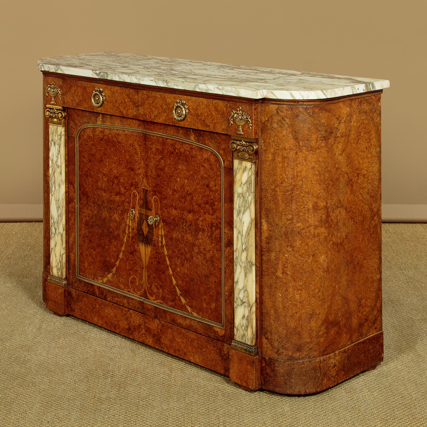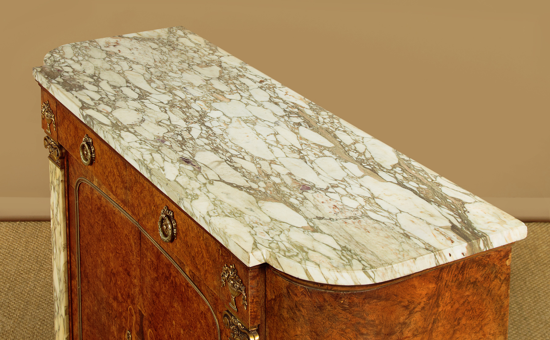 Very smart marble top sideboard by the Paris maker Guerin c.1920. White marble top with pronounced grey figuring, breakfronted and with rounded ends. Over two drawers and a two door cupboard fitted with a single shelf inside (internal depth 13"). Highly figured burr elm veneers laid in striking symmetrical pattern across the front and sides. With unusual neo-Classical decoration to the front featuring marble column pilasters with gilded mounts top and bottom flanking a marquetry inlaid vase detail to the doors. Original gilded handles, floral mounts and mouldings. maker's label for Guerin Freres inside the right hand drawer. Excellent colour and condition, cleaned and waxed in our workshops. Key supplied.