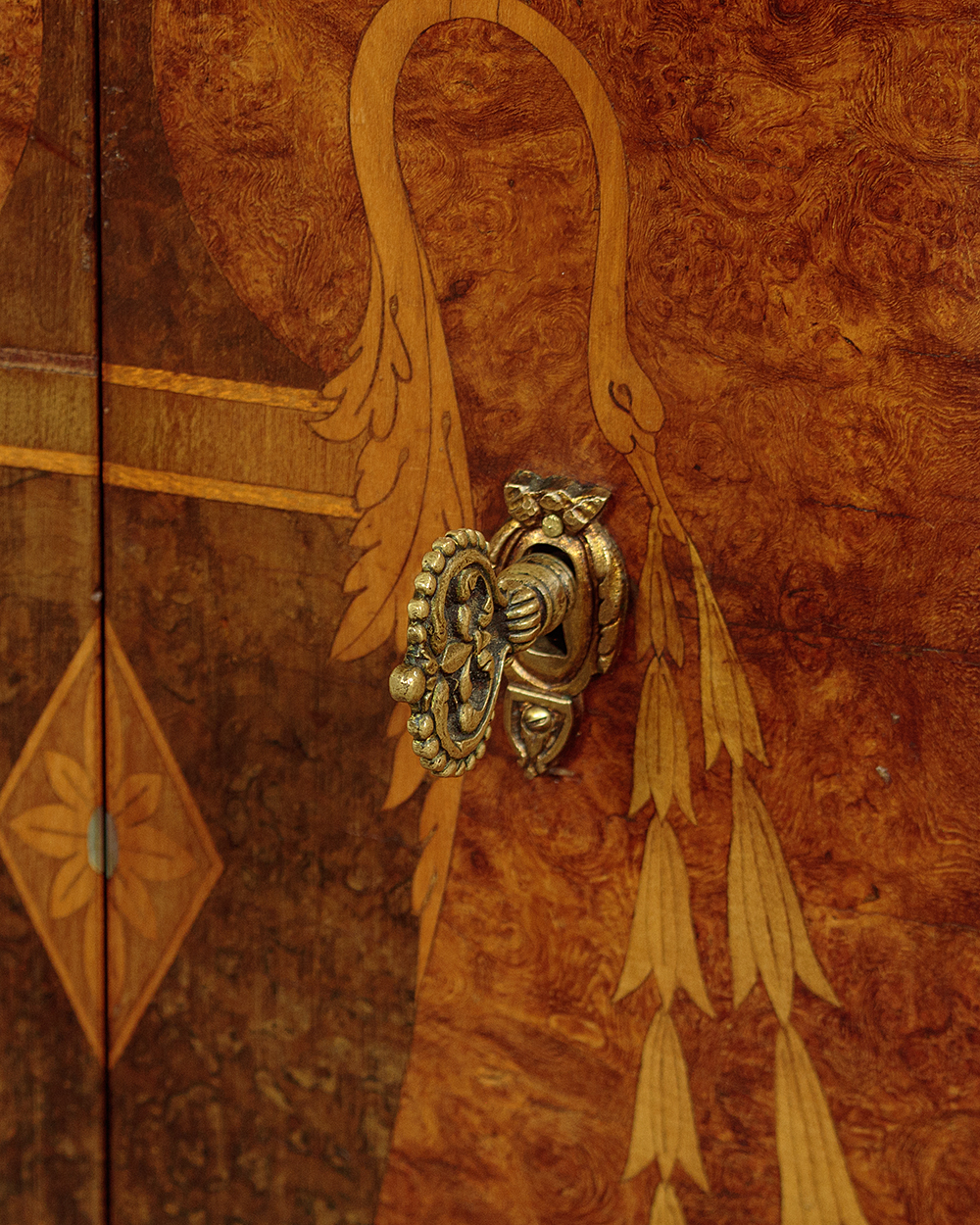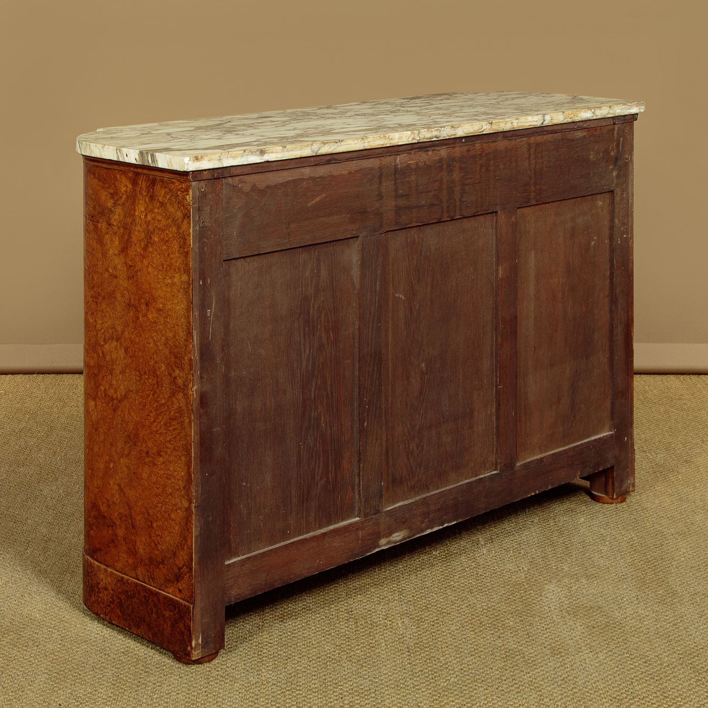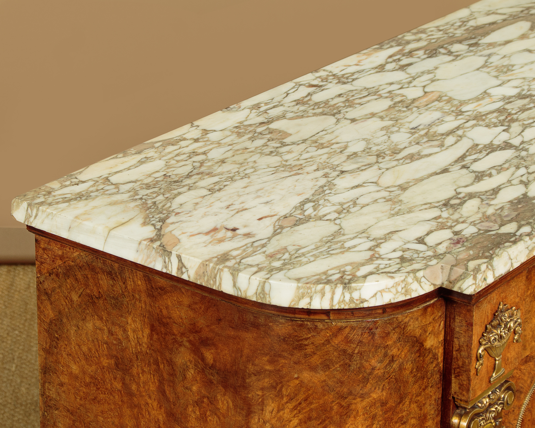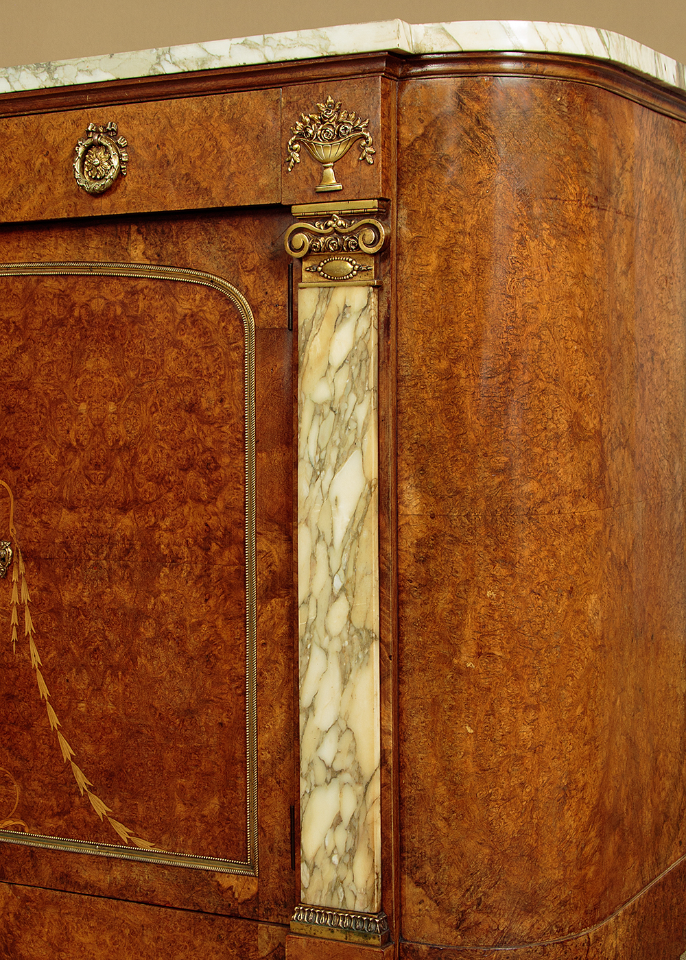 Very smart marble top sideboard by the Paris maker Guerin c.1920. White marble top with pronounced grey figuring, breakfronted and with rounded ends. Over two drawers and a two door cupboard fitted with a single shelf inside (internal depth 13"). Highly figured burr elm veneers laid in striking symmetrical pattern across the front and sides. With unusual neo-Classical decoration to the front featuring marble column pilasters with gilded mounts top and bottom flanking a marquetry inlaid vase detail to the doors. Original gilded handles, floral mounts and mouldings. maker's label for Guerin Freres inside the right hand drawer. Excellent colour and condition, cleaned and waxed in our workshops. Key supplied.