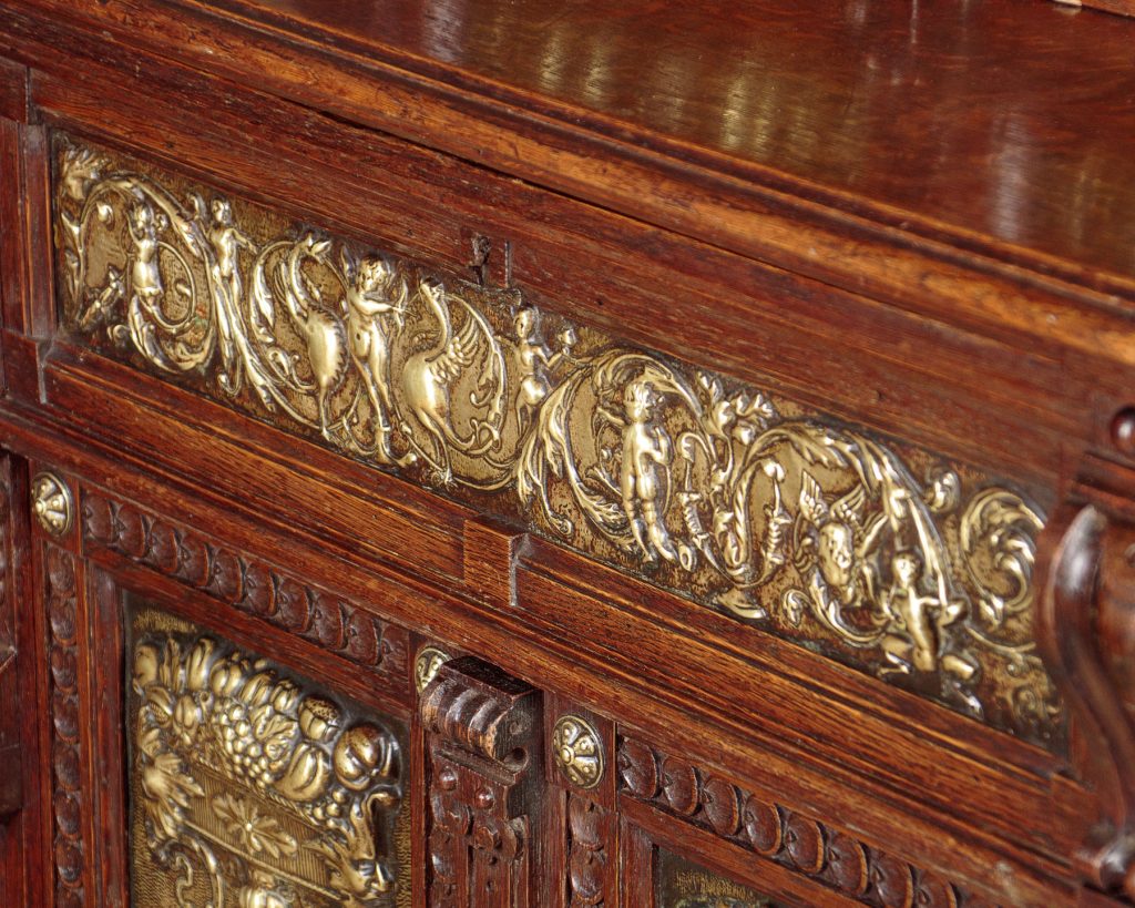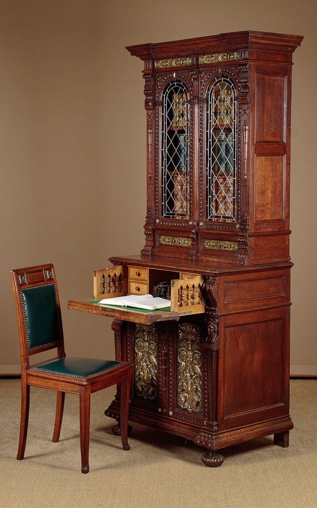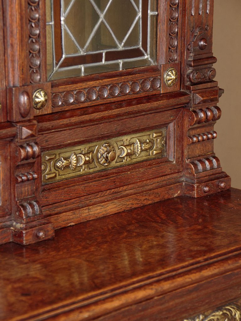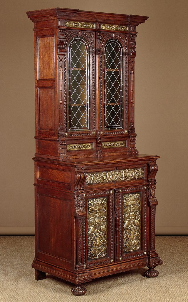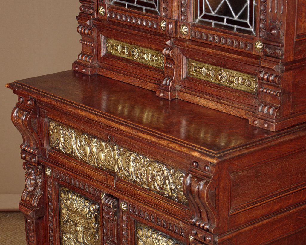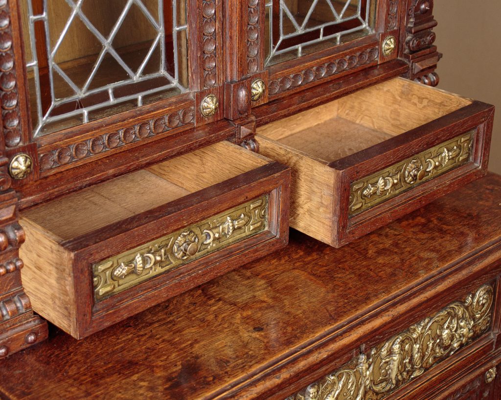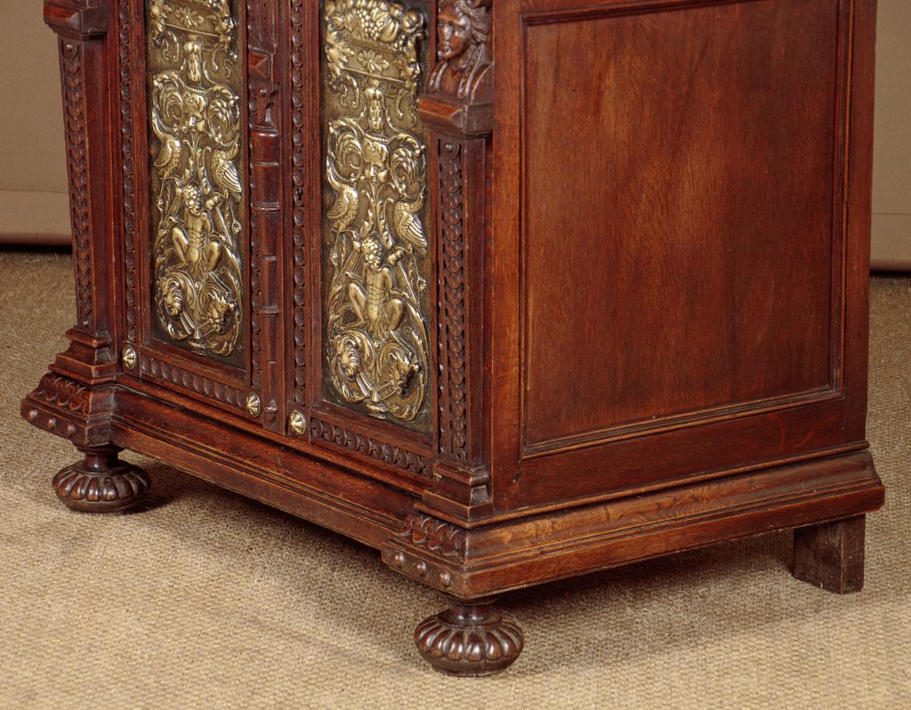 Fabulous late 19th.c. Renaissance revival oak secretaire bookcase with brass panels c.1880. Useful small size, just 35½" wide at the cornice. Glazed bookcase top with leaded glass panels, fitted inside with two adjustable shelves (internal depth 9"), over two small drawers. Base with a secretaire drawer opening to form a writing desk, over a two door cupboard fitted with a single shelf. A remarkable piece of furniture with extensive carved detail and extraordinary Classical inspired repoussé brass panels to the drawer and door fronts featuring cavorting putti, birds and grotesques amongst scrolling acanthus. Unusual turned spindles to the sides of the secretaire drawer and four small stationery drawers. Oak panelled sides and rear. Oak drawer linings. Cracks to a couple of the pieces of glass in the top doors. Otherwise excellent colour and condition, cleaned and waxed in our workshops. Key supplied for all three locks.