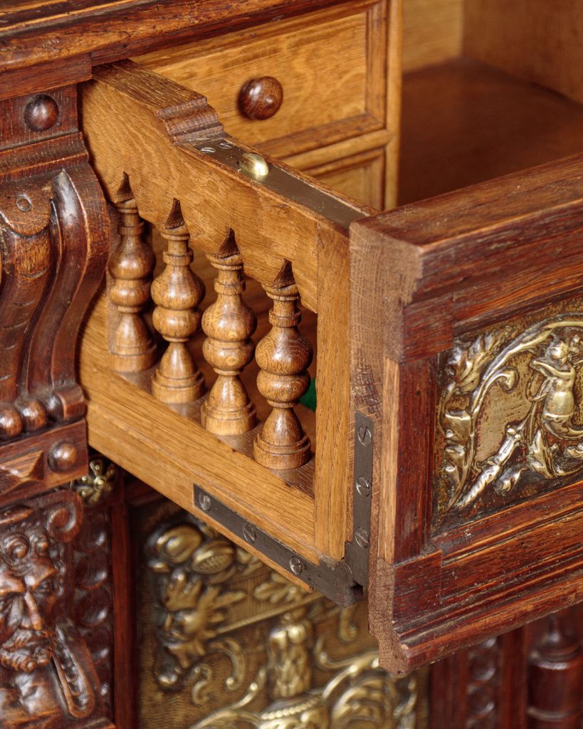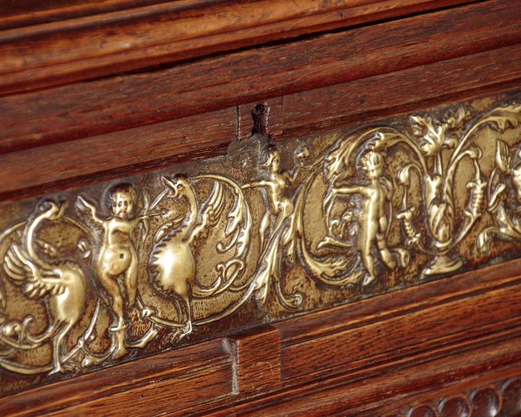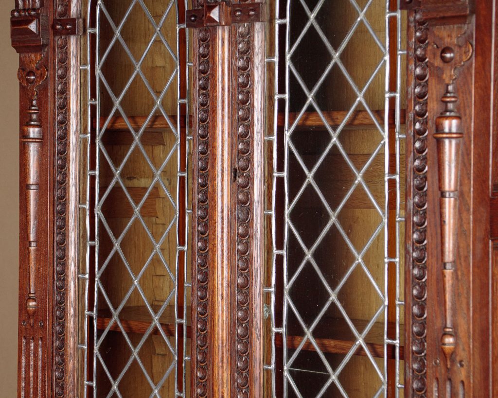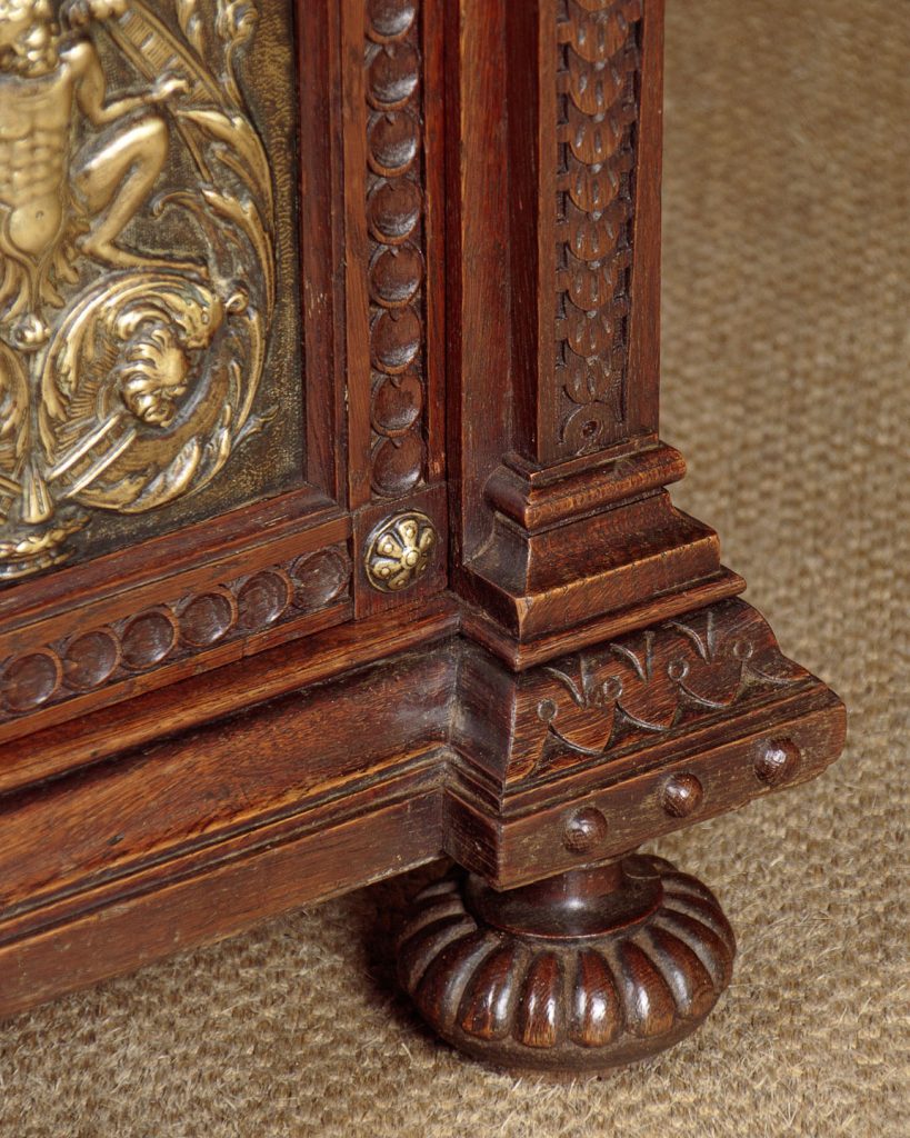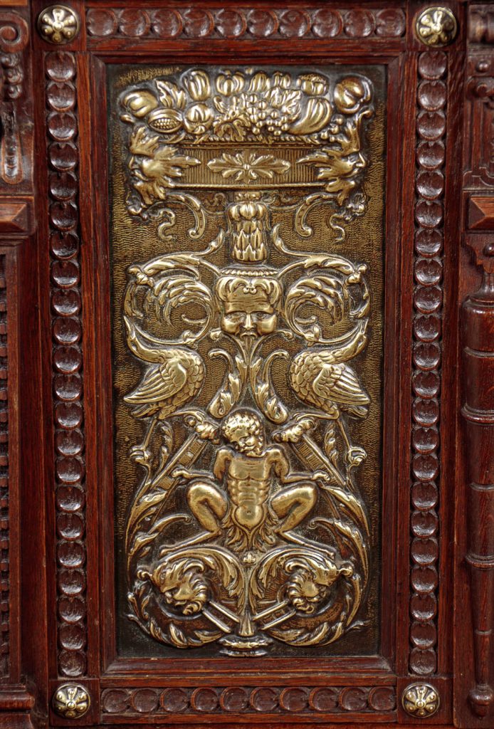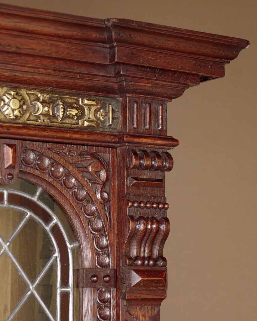 Fabulous late 19th.c. Renaissance revival oak secretaire bookcase with brass panels c.1880. Useful small size, just 35½" wide at the cornice. Glazed bookcase top with leaded glass panels, fitted inside with two adjustable shelves (internal depth 9"), over two small drawers. Base with a secretaire drawer opening to form a writing desk, over a two door cupboard fitted with a single shelf. A remarkable piece of furniture with extensive carved detail and extraordinary Classical inspired repoussé brass panels to the drawer and door fronts featuring cavorting putti, birds and grotesques amongst scrolling acanthus. Unusual turned spindles to the sides of the secretaire drawer and four small stationery drawers. Oak panelled sides and rear. Oak drawer linings. Cracks to a couple of the pieces of glass in the top doors. Otherwise excellent colour and condition, cleaned and waxed in our workshops. Key supplied for all three locks.