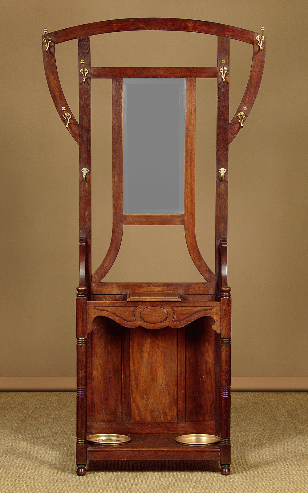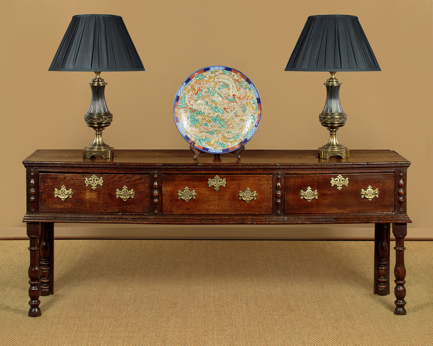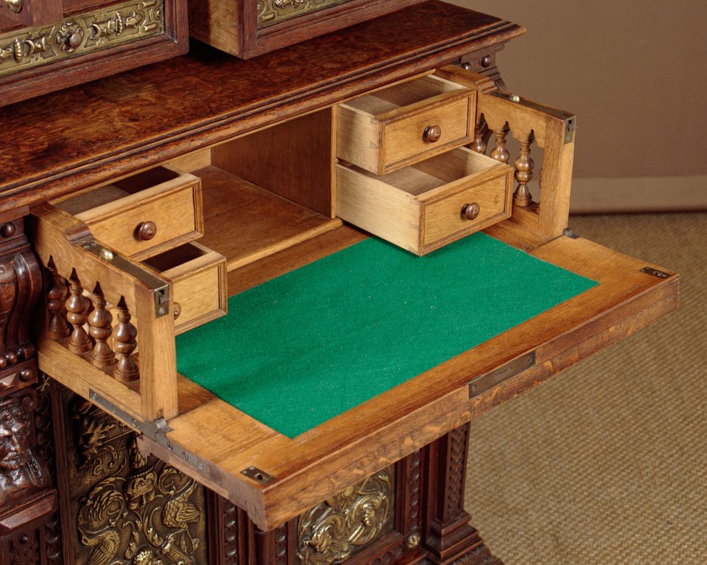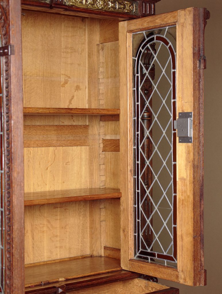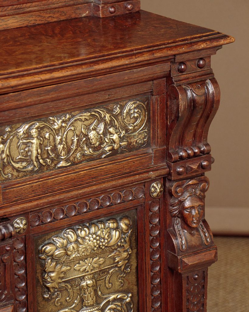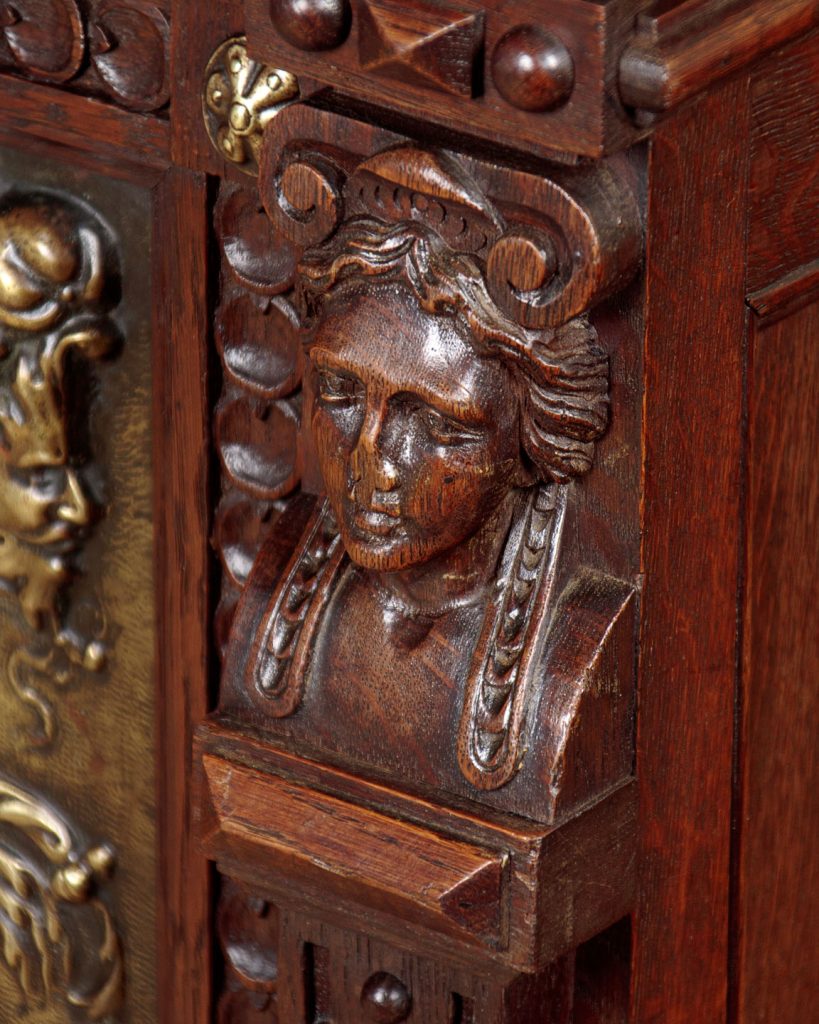 Fabulous late 19th.c. Renaissance revival oak secretaire bookcase with brass panels c.1880. Useful small size, just 35½" wide at the cornice. Glazed bookcase top with leaded glass panels, fitted inside with two adjustable shelves (internal depth 9"), over two small drawers. Base with a secretaire drawer opening to form a writing desk, over a two door cupboard fitted with a single shelf. A remarkable piece of furniture with extensive carved detail and extraordinary Classical inspired repoussé brass panels to the drawer and door fronts featuring cavorting putti, birds and grotesques amongst scrolling acanthus. Unusual turned spindles to the sides of the secretaire drawer and four small stationery drawers. Oak panelled sides and rear. Oak drawer linings. Cracks to a couple of the pieces of glass in the top doors. Otherwise excellent colour and condition, cleaned and waxed in our workshops. Key supplied for all three locks.