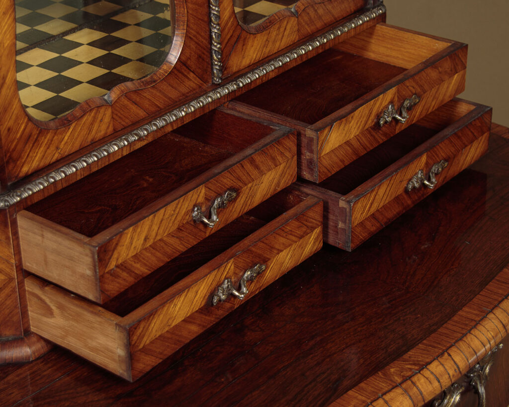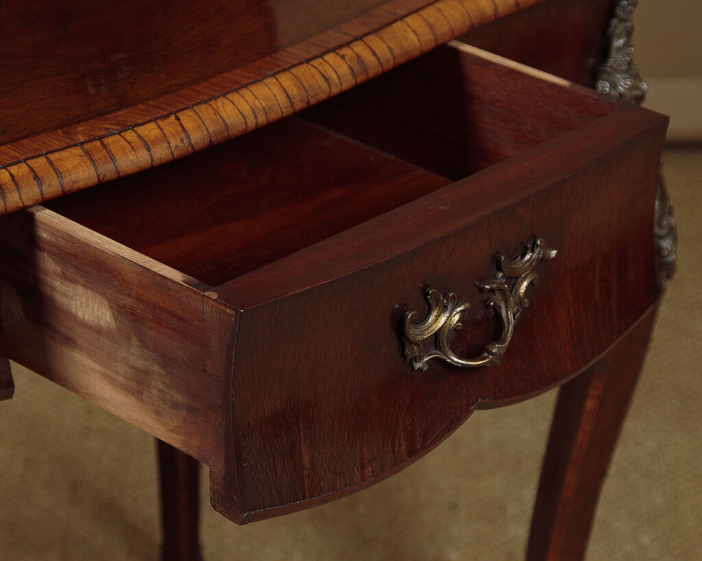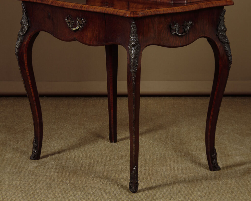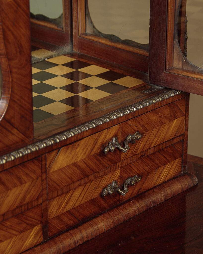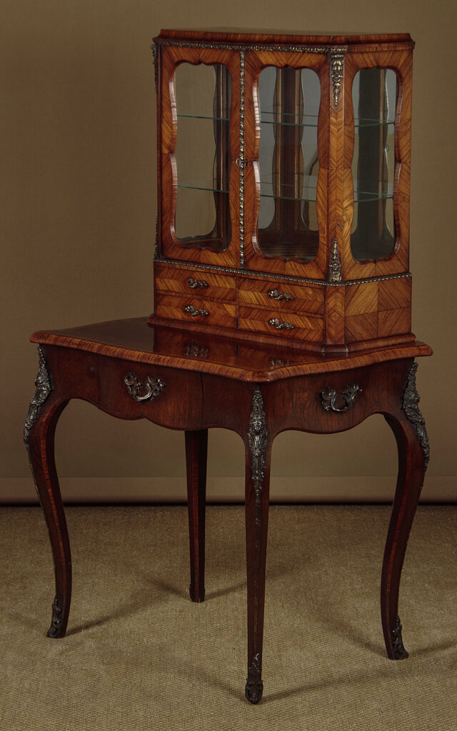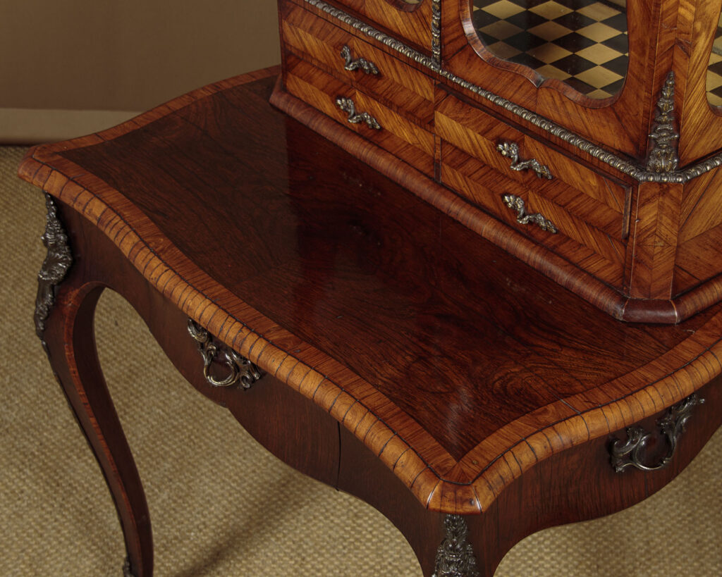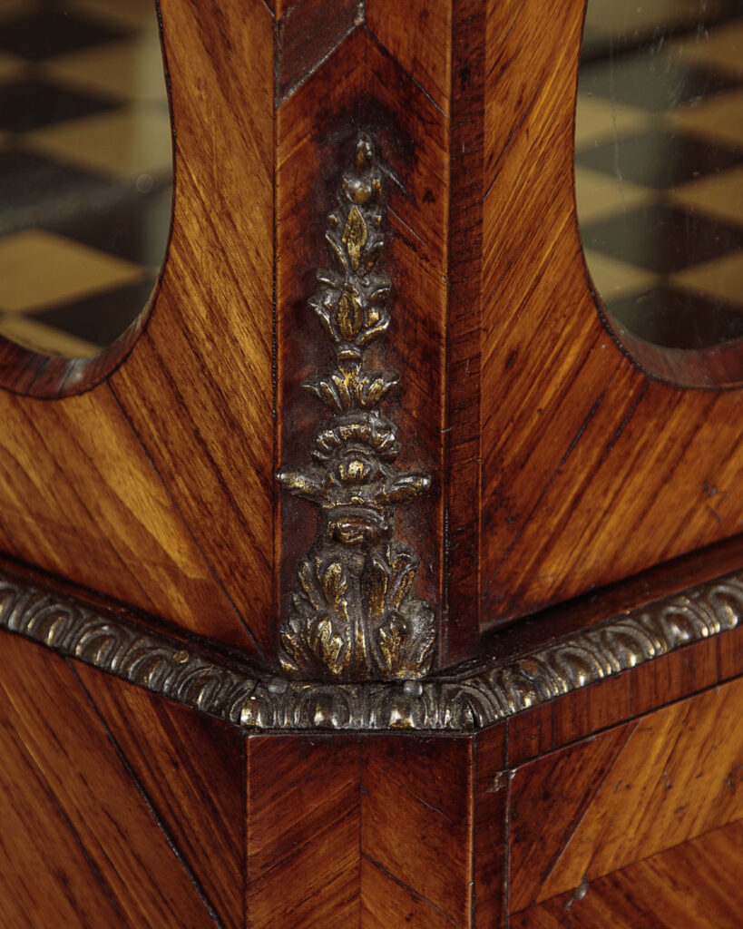 Beautiful little late 19th.c. display cabinet on stand c.1880. Small bijouterie display with glazed doors and sides, fitted inside with two glass shelves (depth 7") and a lovely chequerboard parquetry floor, over four small drawers. On a side table stand with serpentine moulded edges, a shaped apron to the front and sides with a single drawer in the front and slim cabriole legs. Contrasting tulip and rosewood veneers across the piece with extensive and original ormolu mouldings and mounts and handles. Note the unusual feature of handles at the sides of the base and the Classical female heads to the mounts on the top of the legs front and rear. Much of the gilding is lost from the lower handles and mounts and there is small missing portion of one of the handles on the small drawers. Otherwise excellent colour and condition, restored cleaned and polished in our workshops. Key supplied.