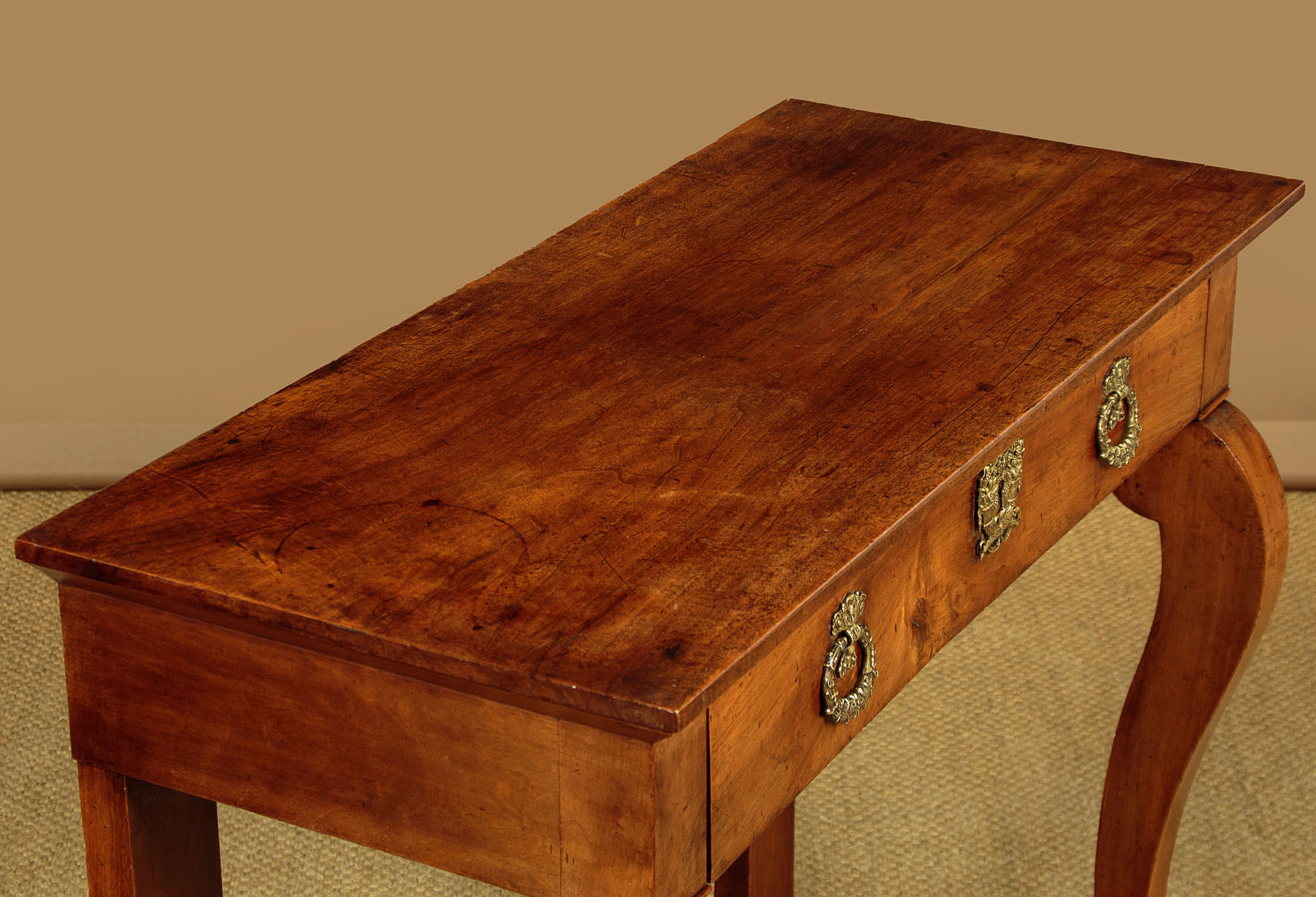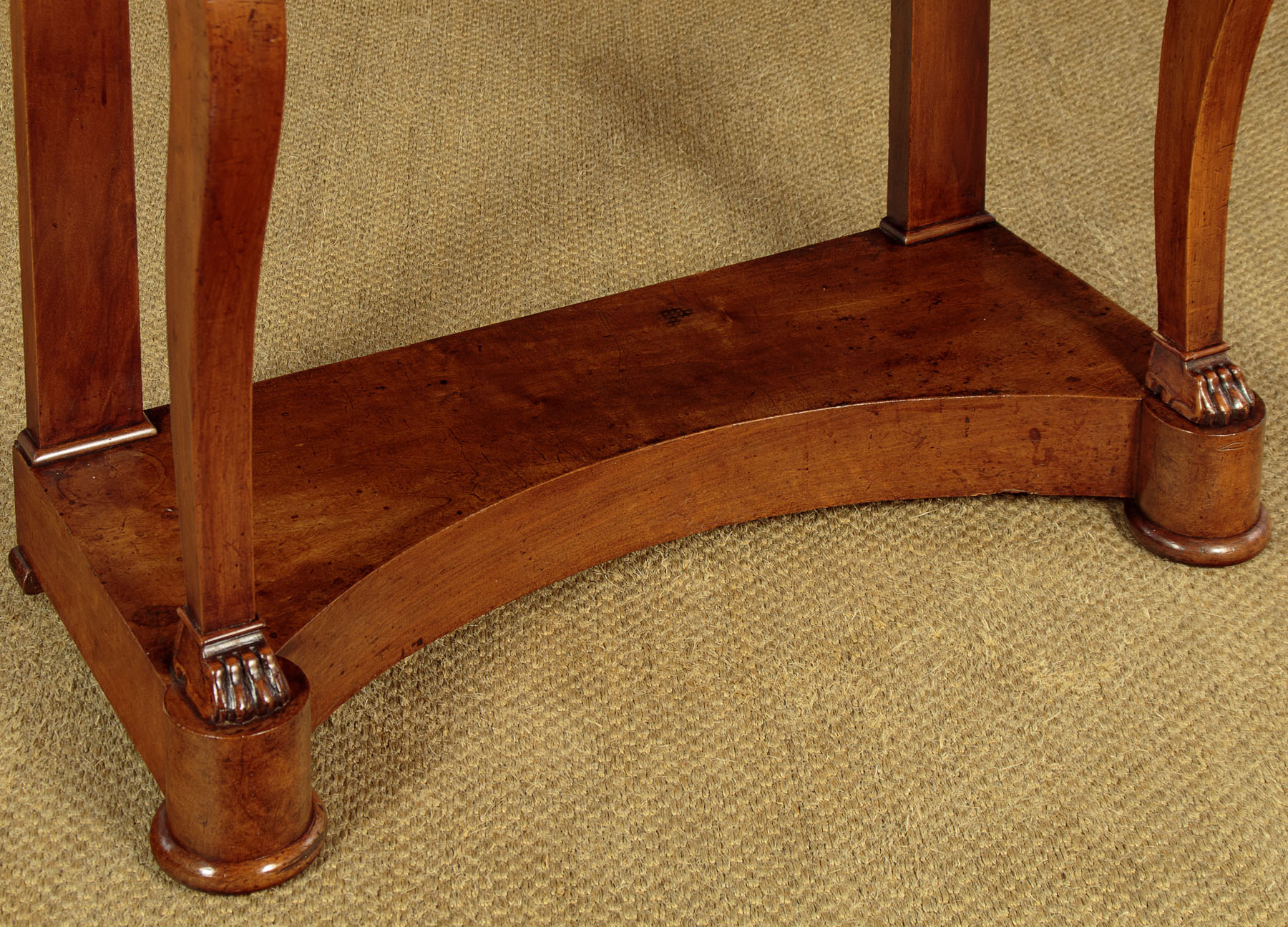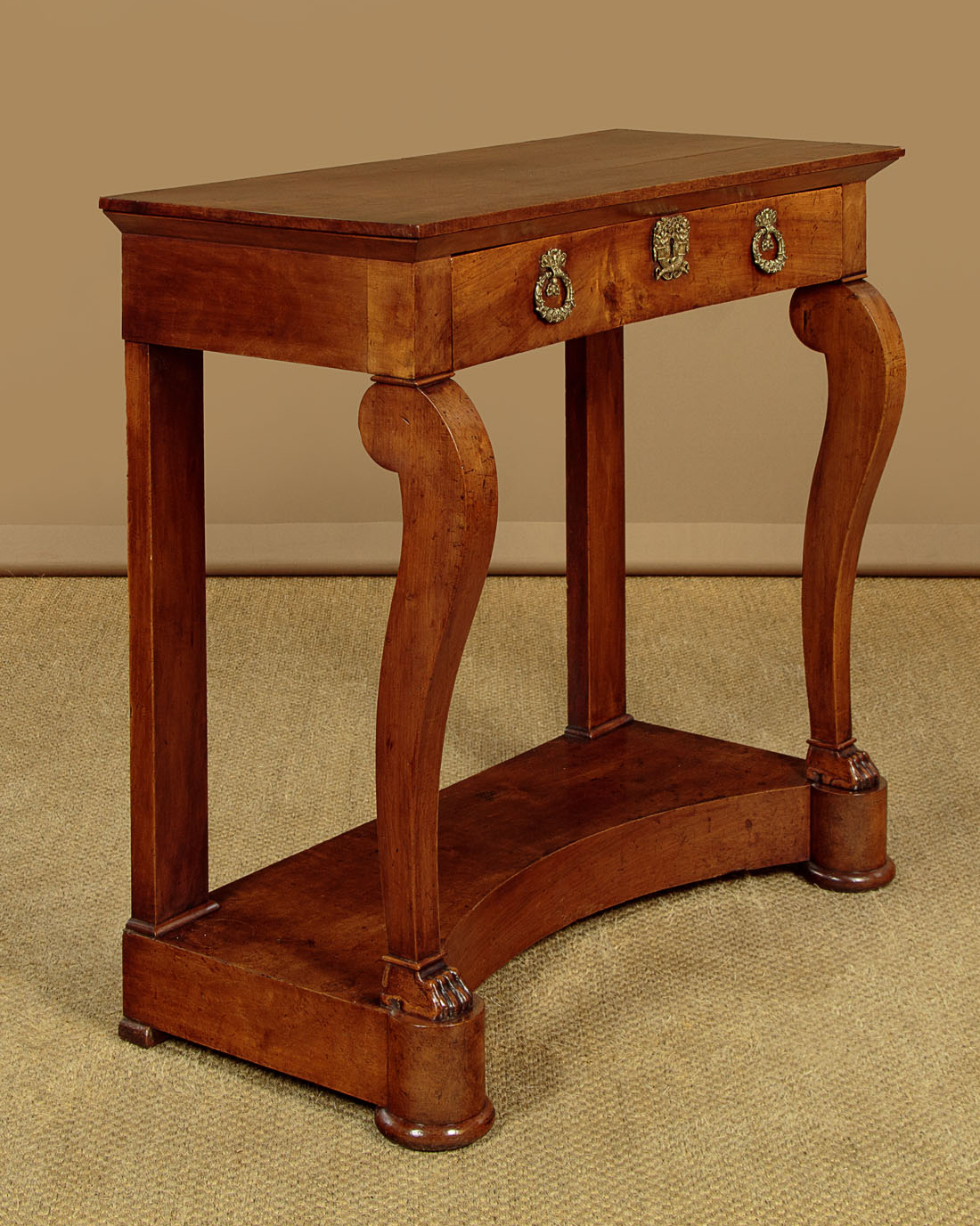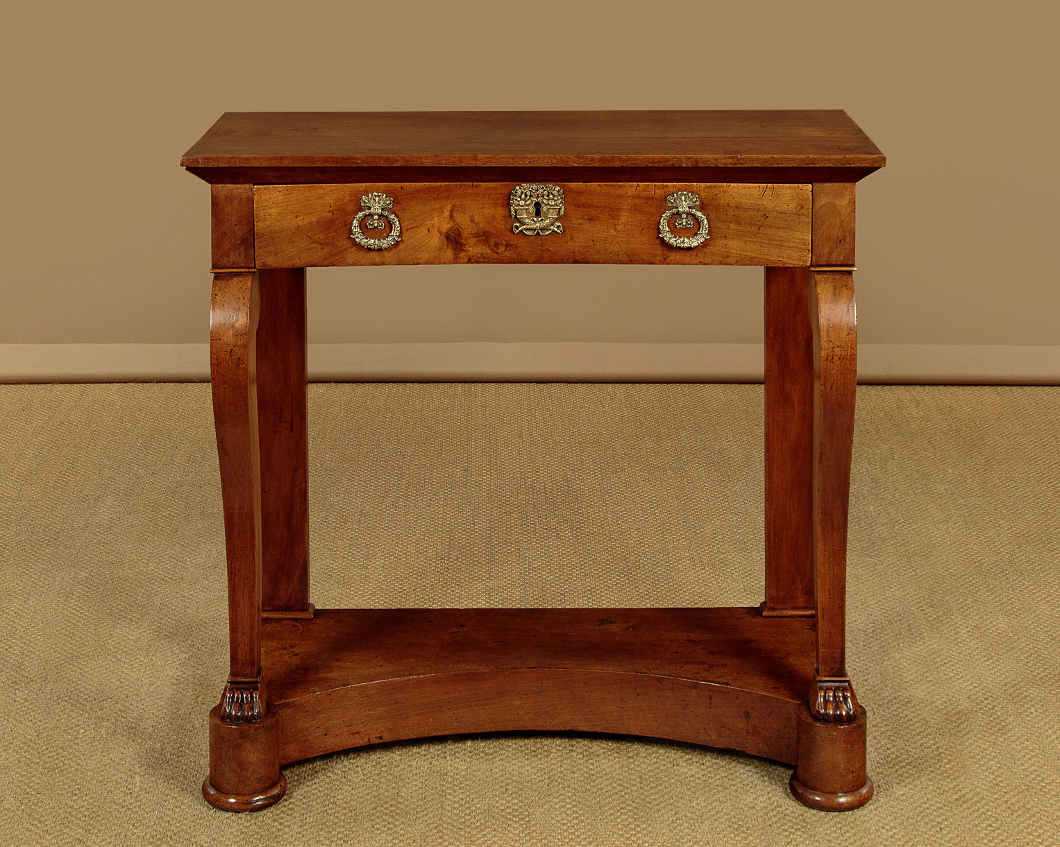 Small mid 19th.c. French console table in walnut c.1840. Useful small size, just 35” wide. Quite unusual solid walnut top (rather than marble) with a simple chamfered moulding below. Over a slim drawer with a solid walnut drawer front with splendid Empire style brass handles and escutcheon plate featuring crossed cornucopia. Curving front supports with neat little carved paw feet over a concave plinth raised on turned pads. Very good colour and condition, restored cleaned and waxed in our workshops.