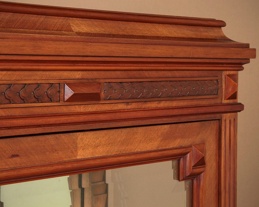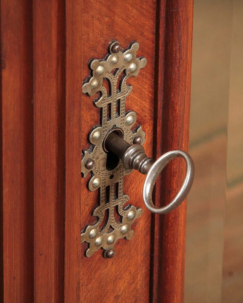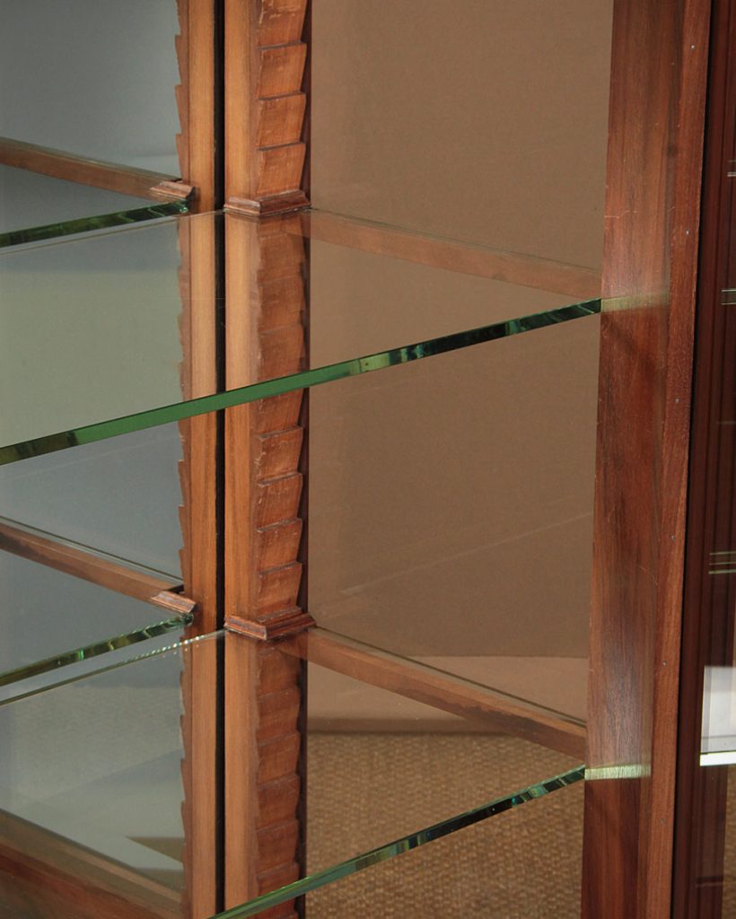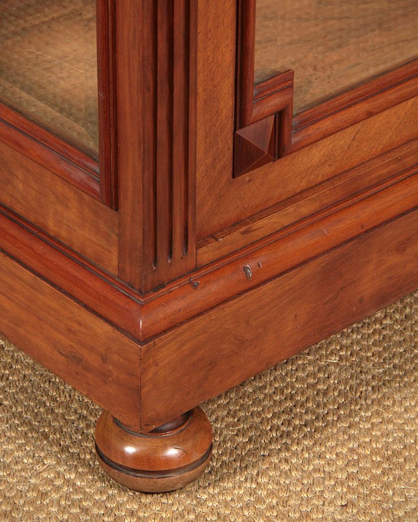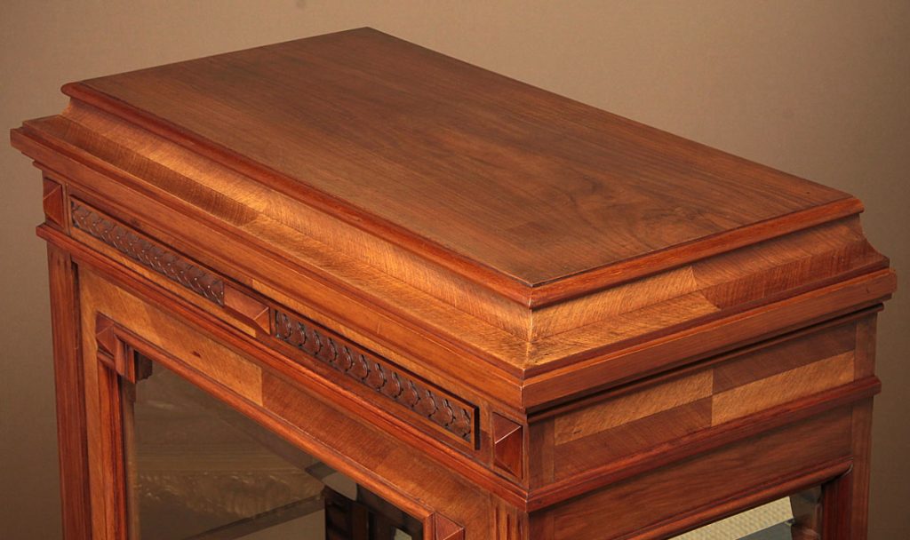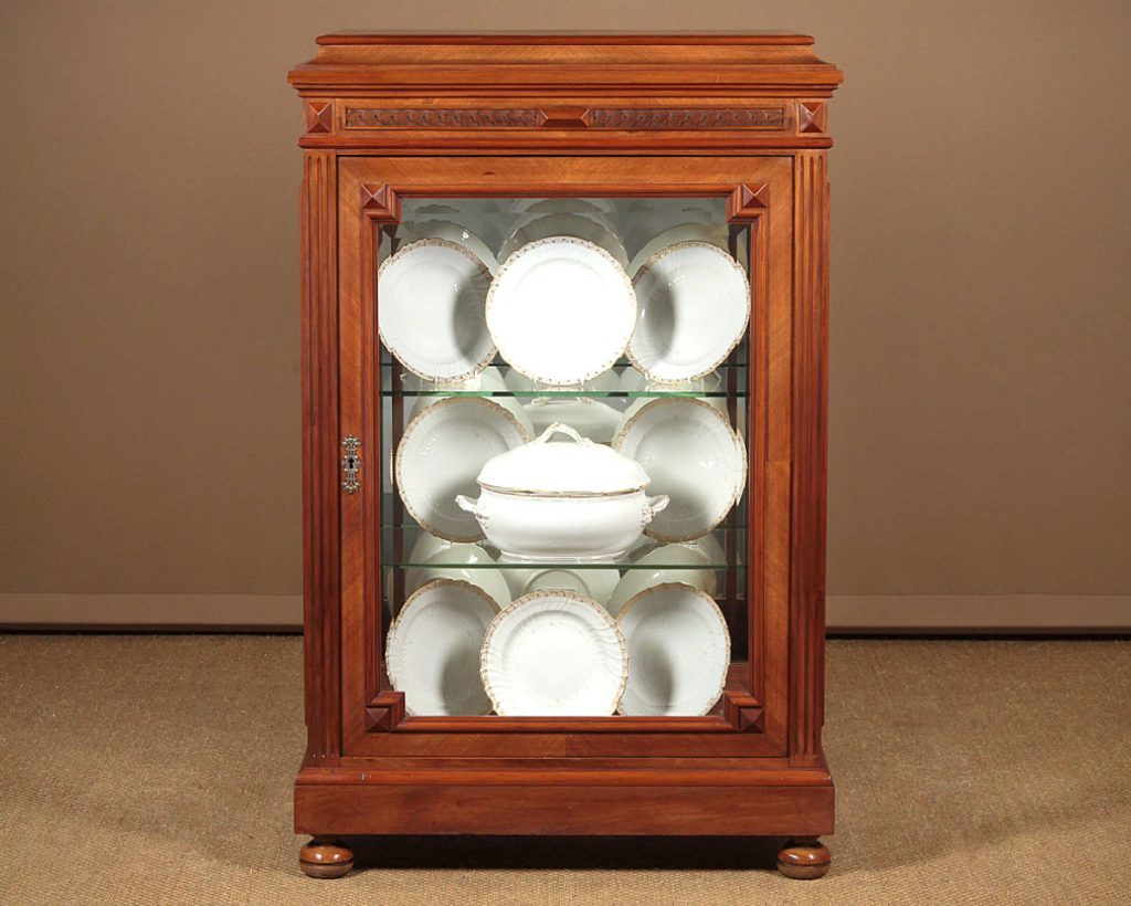 Superb quality little walnut vitrine or display cabinet c.1900. Useful small size, just 34″ wide. Single door fitted inside with two adjustable plate glass shelves (depth 12½”) and a mirrored back panel. Quarter veneered cornice and front on solid walnut groundwork. Giloche carved frieze and fluted uprights. Bevelled glass to the door and sides with raised mouldings and applied detail at the quarter points. Lovely original pierced escutcheon plate. Moulded plinth raised on turned bun feet. Excellent condition, cleaned and waxed in our workshops. Key supplied.