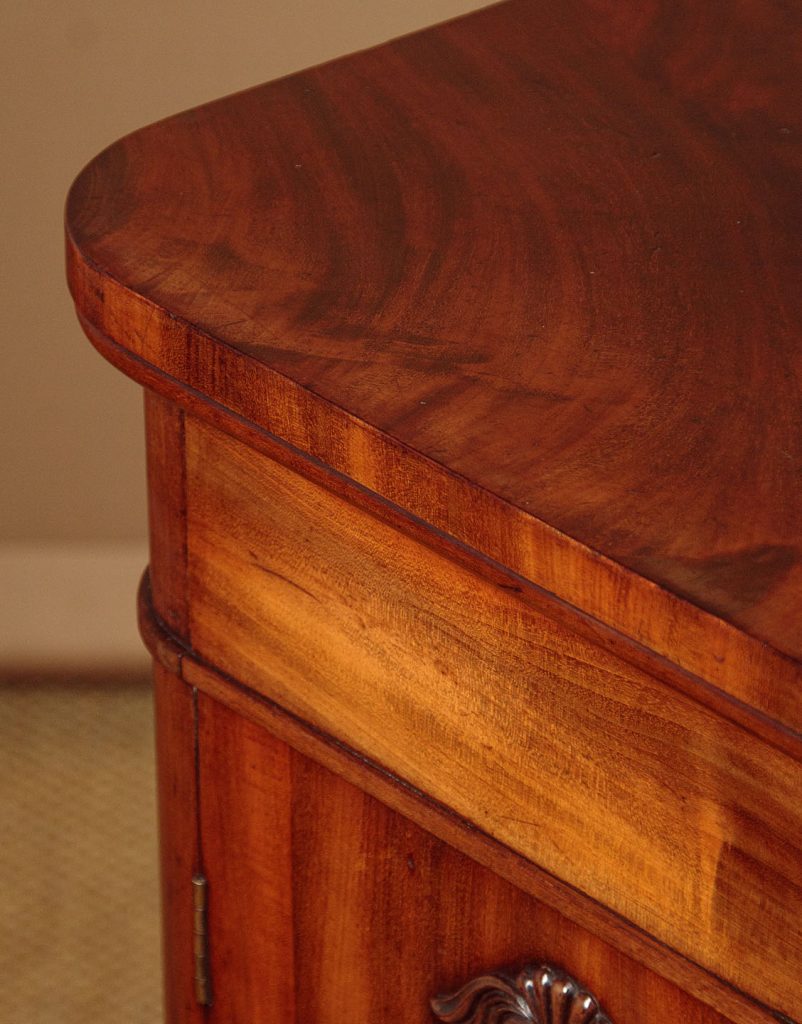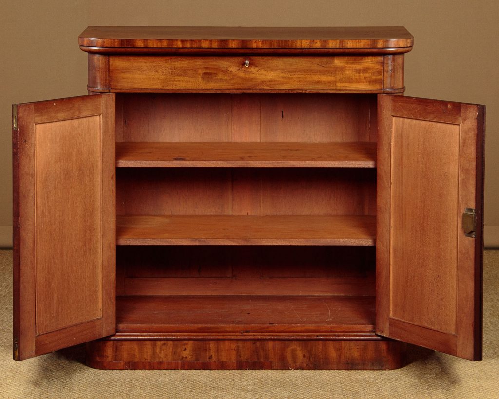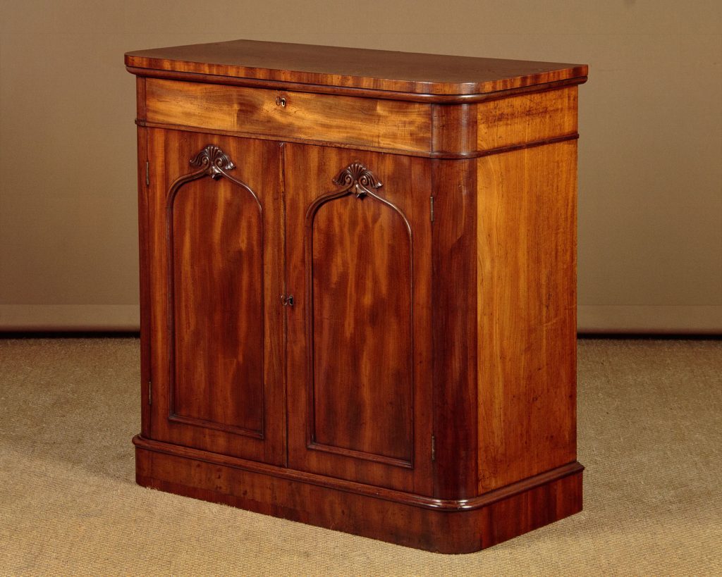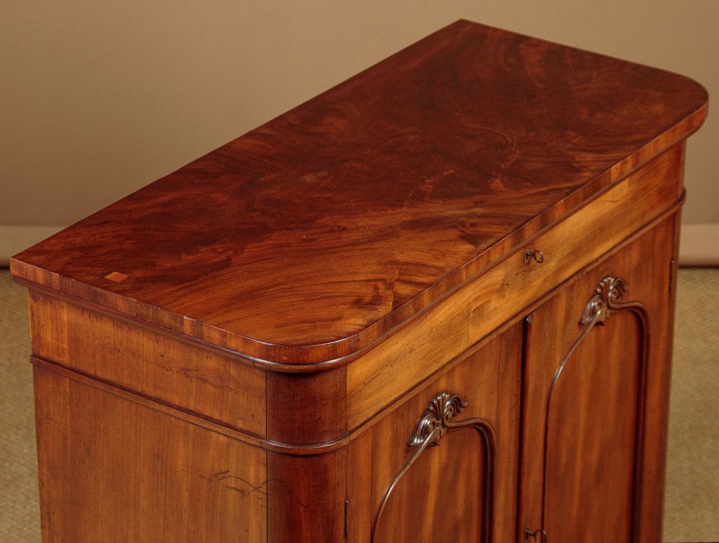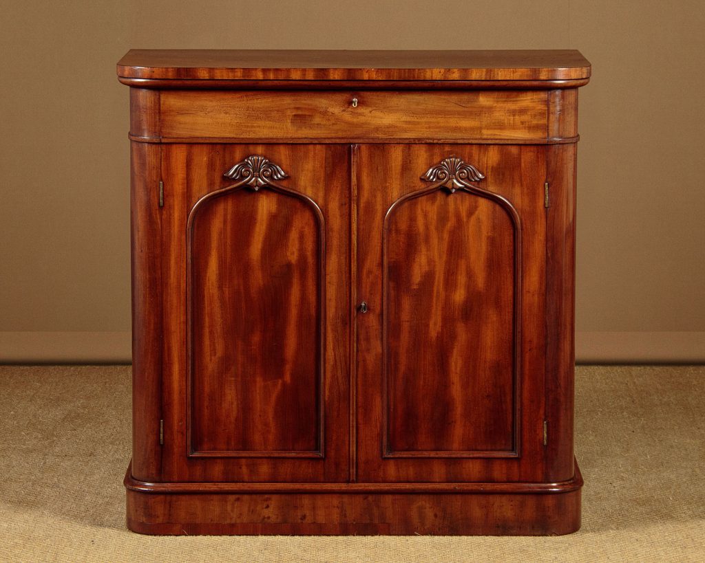 Neat little William IV mahogany chiffonier side cabinet c.1840. Just 36" wide. Particularly well figured flame mahogany veneered top with rounded corners and a crossbanded edge. Over a single slim drawer and a two door cupboard fitted with two shelves inside (internal depth 14"). Arched door panels within raised mouldings and topped with lovely carved detail. Raised on a moulded and crossbanded plinth. Solid mahogany sides and oak drawer linings. A couple of small patch repairs to the top and some replacement crossbanding on the plinth. Otherwise excellent colour and condition. Restored cleaned and waxed in our workshops. Original locks and keys to the drawer and cupboard.