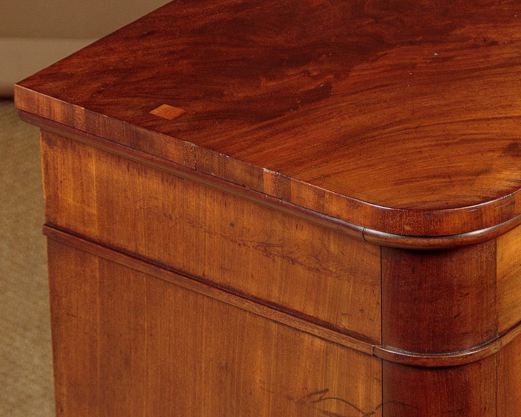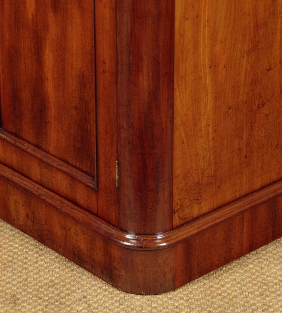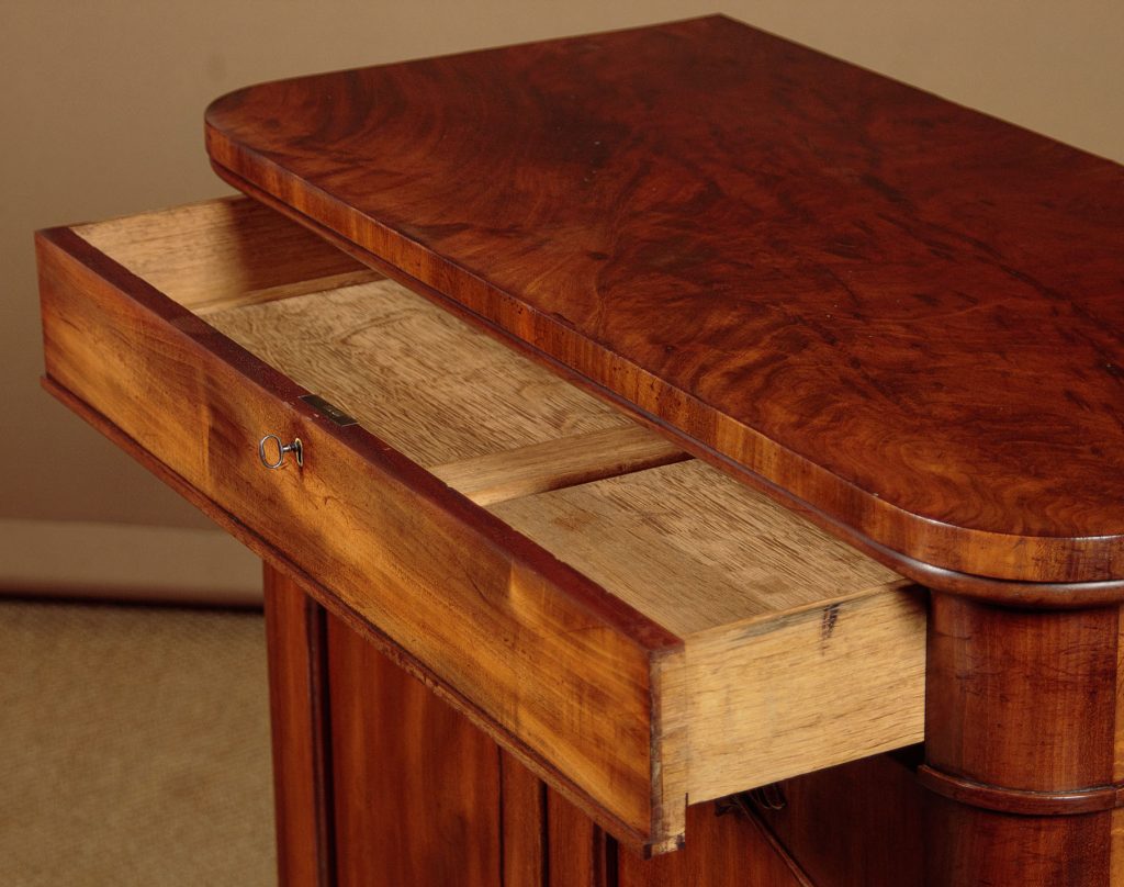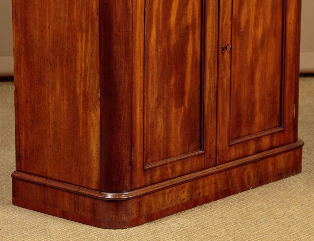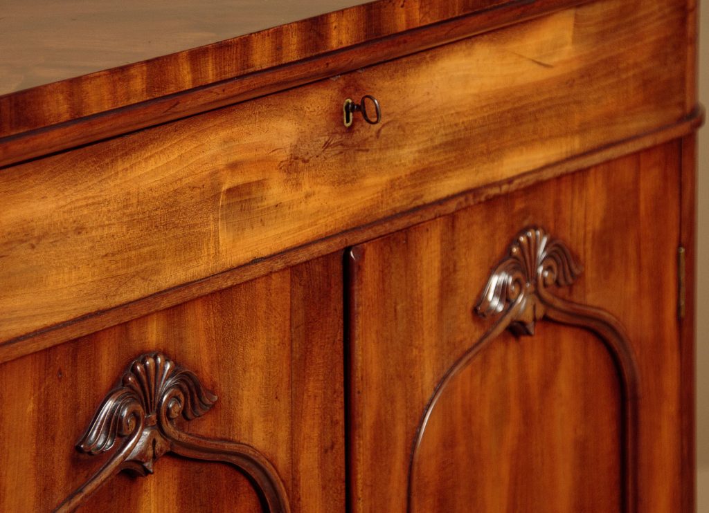 Neat little William IV mahogany chiffonier side cabinet c.1840. Just 36" wide. Particularly well figured flame mahogany veneered top with rounded corners and a crossbanded edge. Over a single slim drawer and a two door cupboard fitted with two shelves inside (internal depth 14"). Arched door panels within raised mouldings and topped with lovely carved detail. Raised on a moulded and crossbanded plinth. Solid mahogany sides and oak drawer linings. A couple of small patch repairs to the top and some replacement crossbanding on the plinth. Otherwise excellent colour and condition. Restored cleaned and waxed in our workshops. Original locks and keys to the drawer and cupboard.