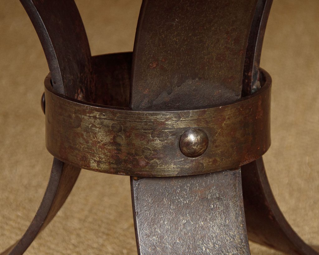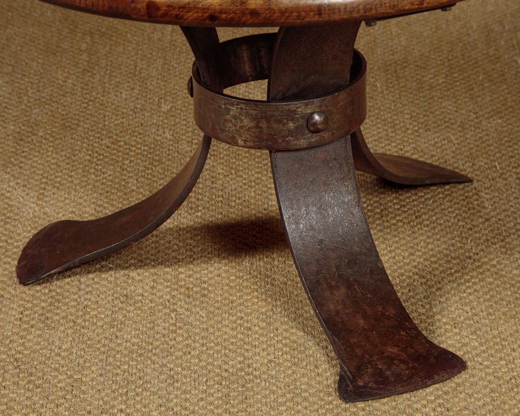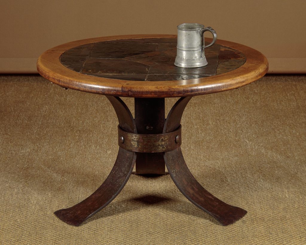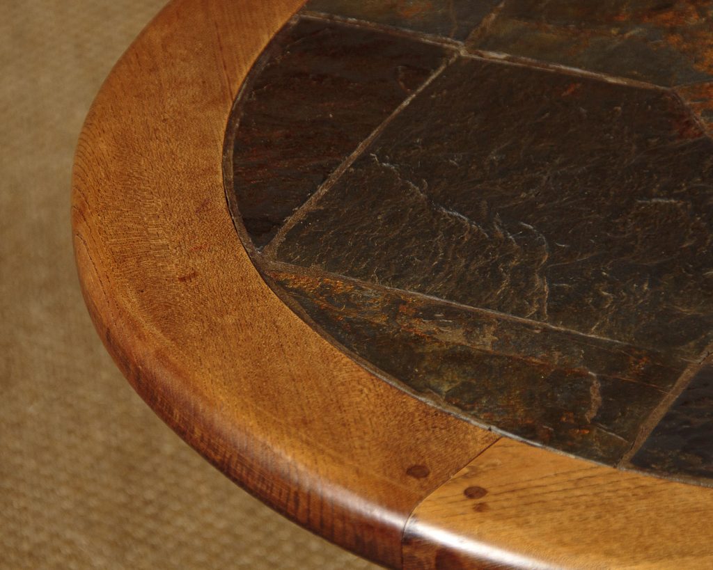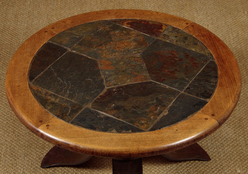 Very sturdy and hard wearing mid century coffee table c.1970. 29" diameter top with coloured and riven slate tiles arranged within an inch-thick oak frame. Raised on a tripod base with broad curving iron legs, flattened at the feet, joined with a deep hoop stretcher. Excellent condition, cleaned and waxed in our workshops.