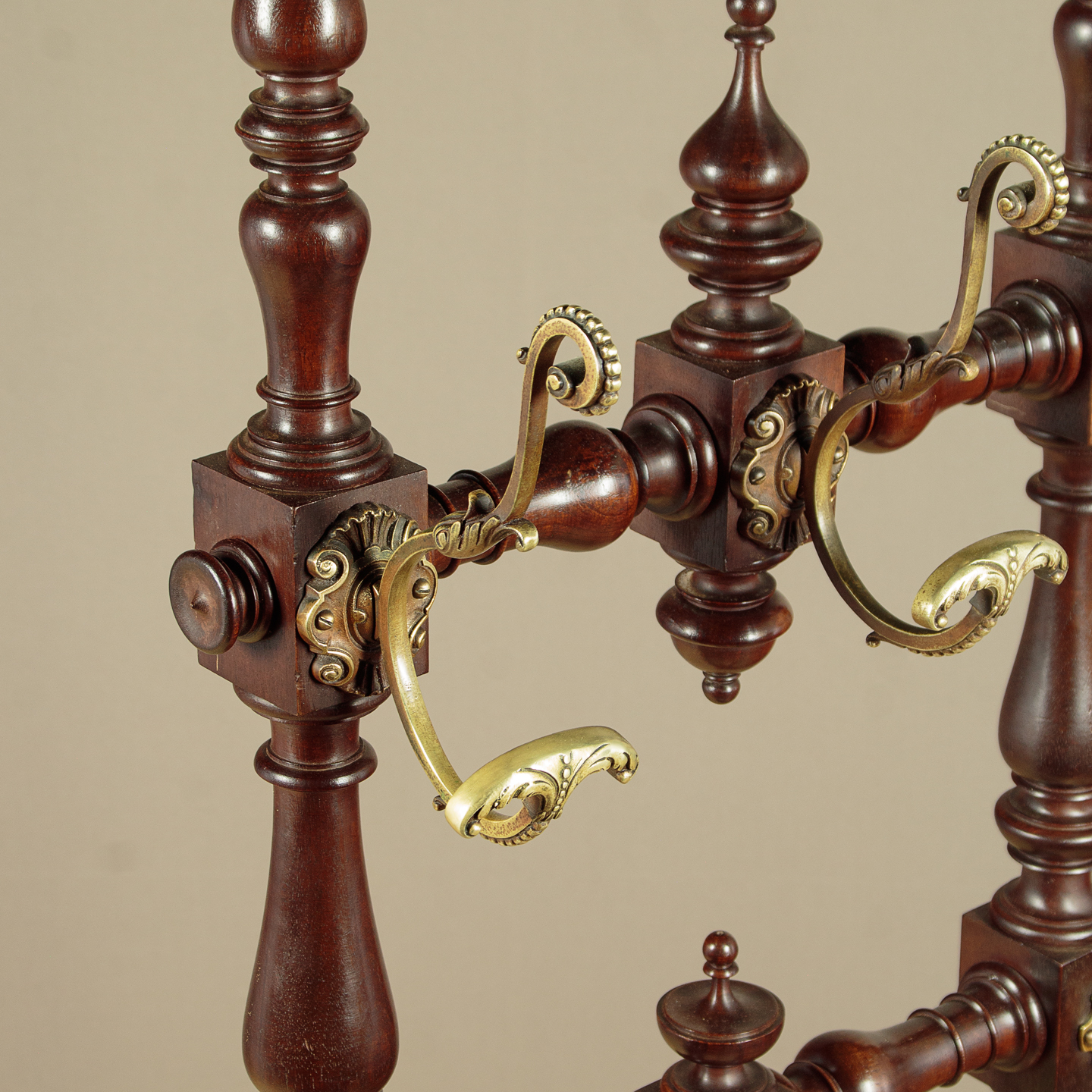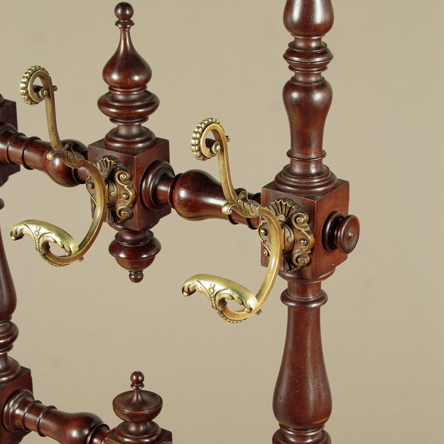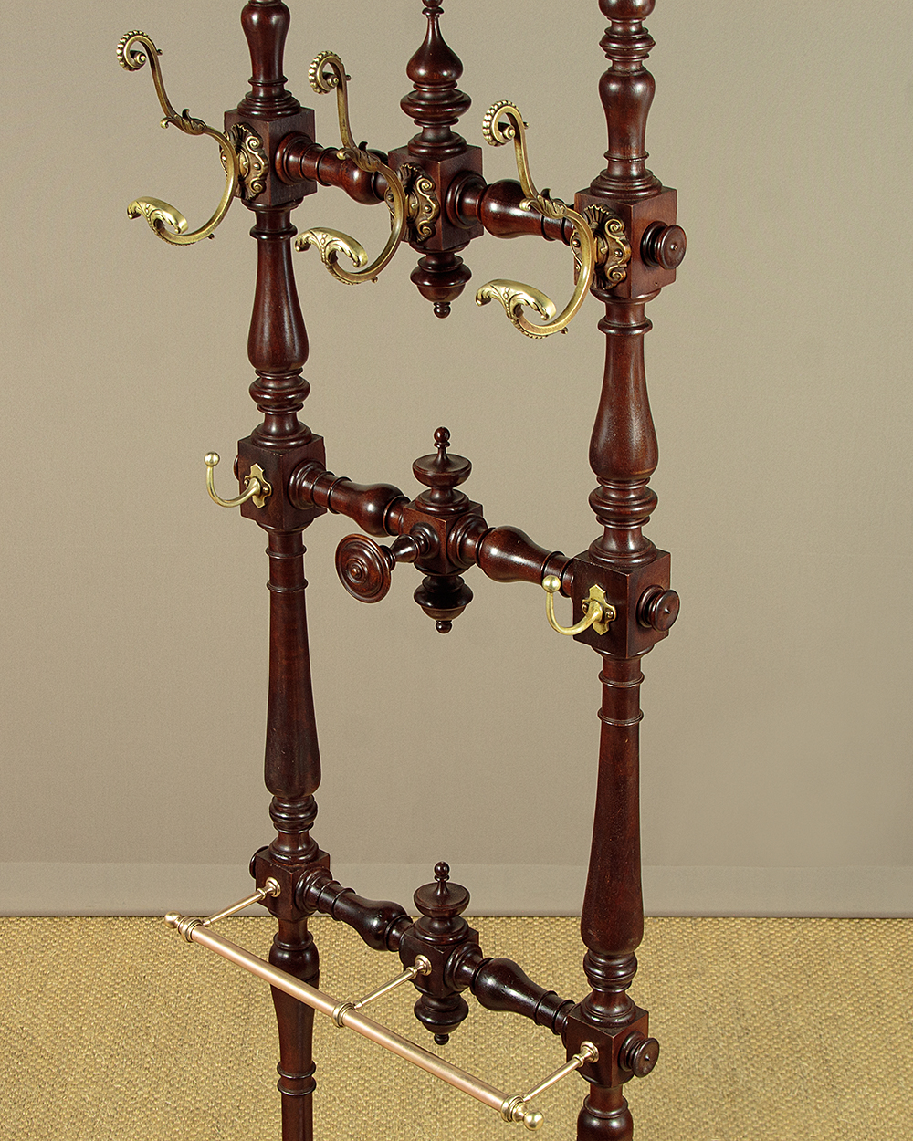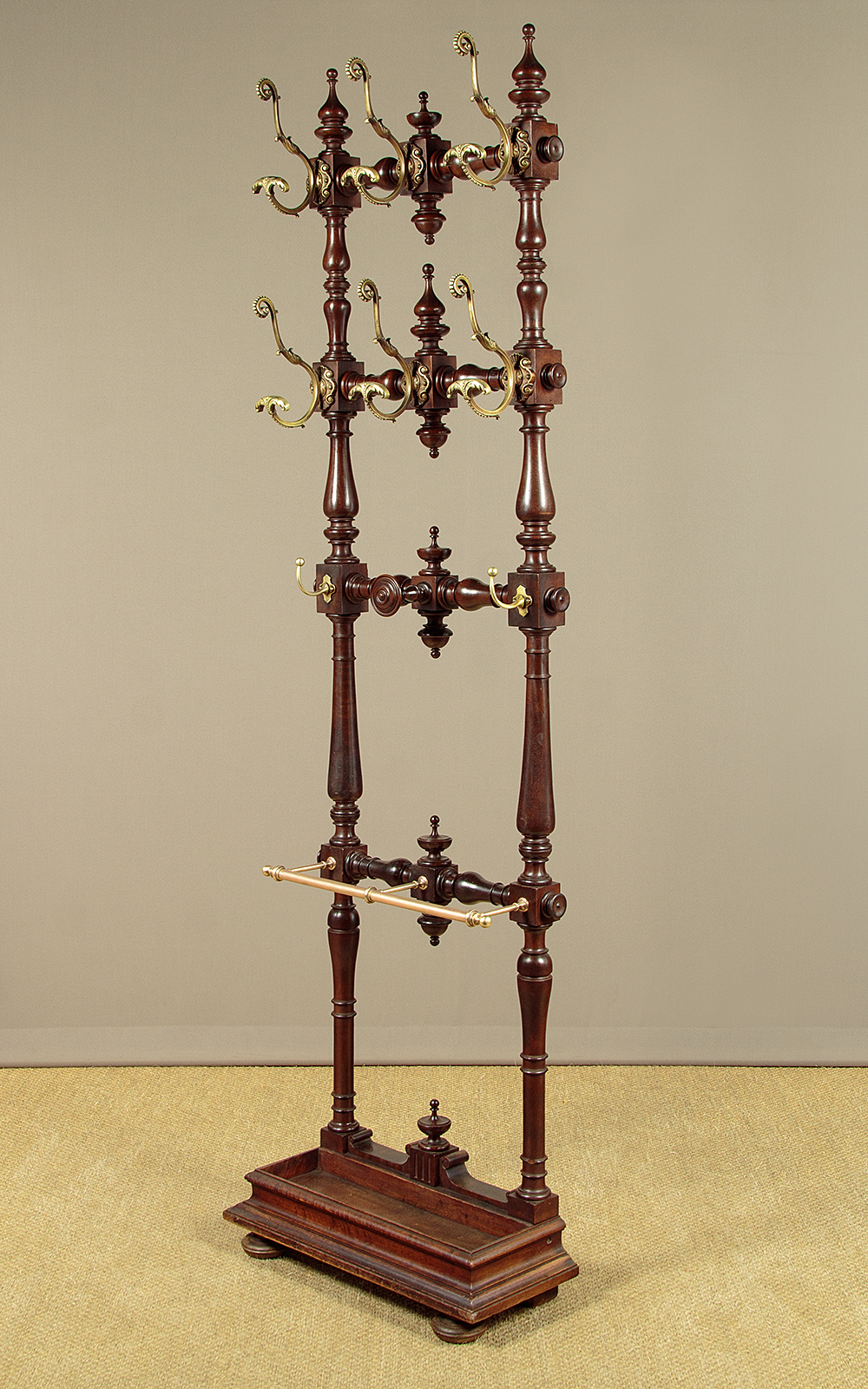 Tall walnut hallstand c.1880. Six large and elaborately cast brass double looks for hats and coats etc plus two smaller hooks and a brass stay for sticks and umbrellas etc. Arranged on a crisply turned walnut frame adorned with turned finials and droppers. Deep moulded base on turned front feet. Excellent colour and condition, cleaned and waxed in our workshops.