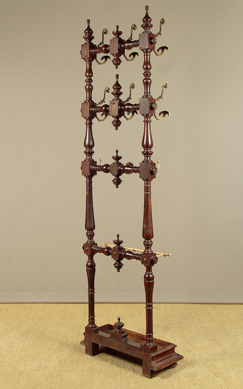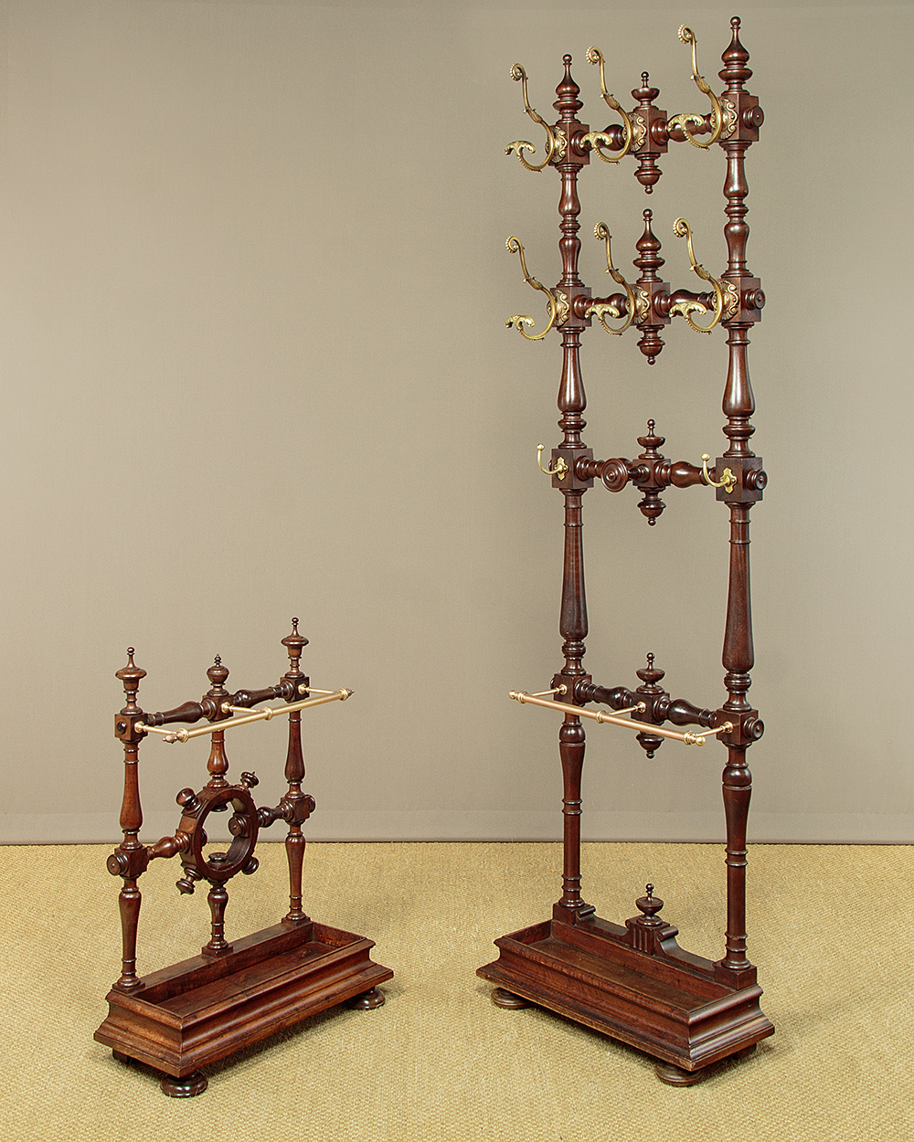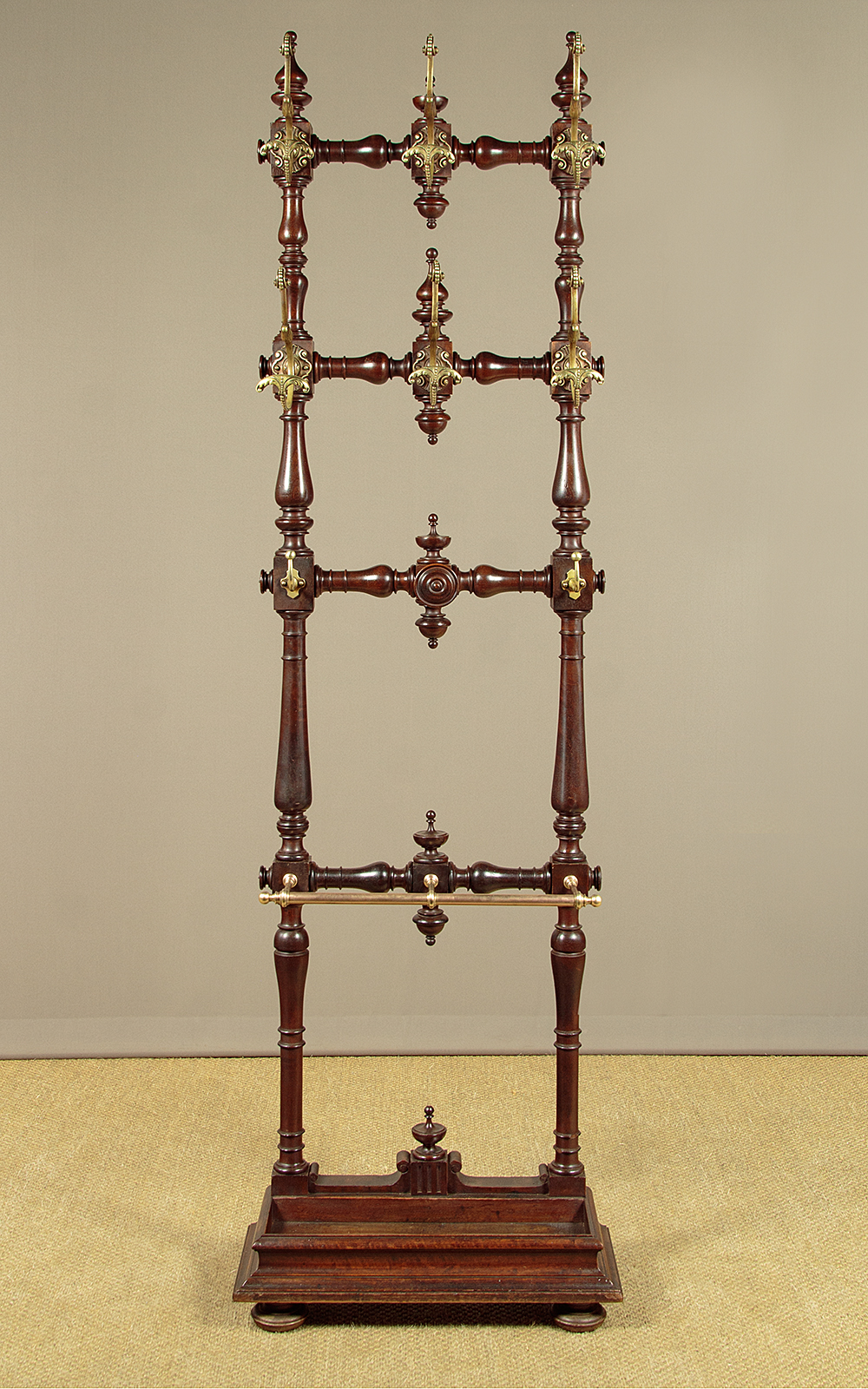 Tall walnut hallstand c.1880. Six large and elaborately cast brass double looks for hats and coats etc plus two smaller hooks and a brass stay for sticks and umbrellas etc. Arranged on a crisply turned walnut frame adorned with turned finials and droppers. Deep moulded base on turned front feet. Excellent colour and condition, cleaned and waxed in our workshops.