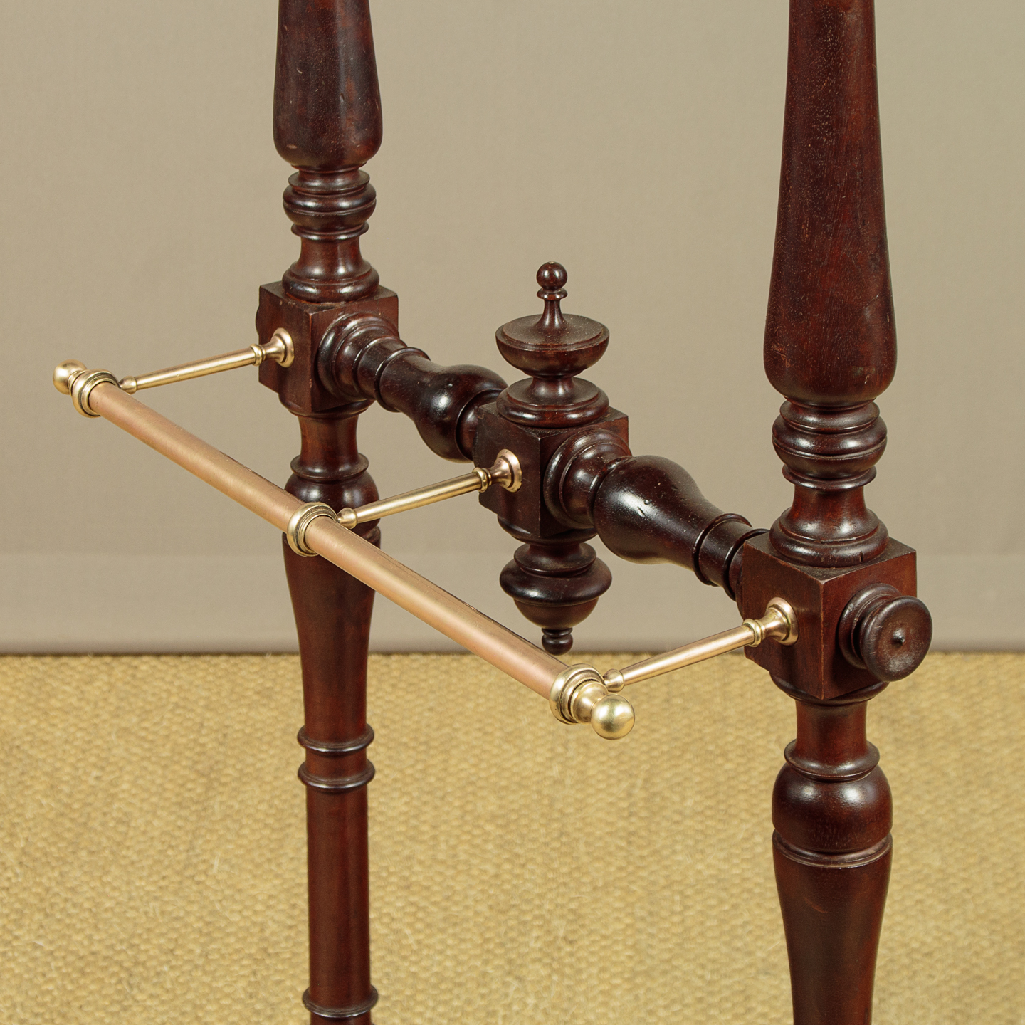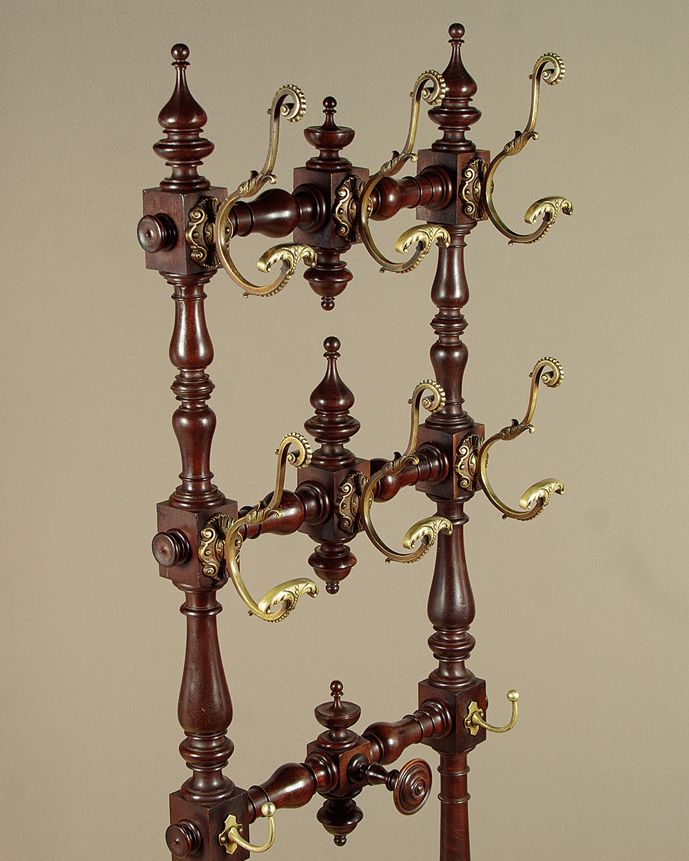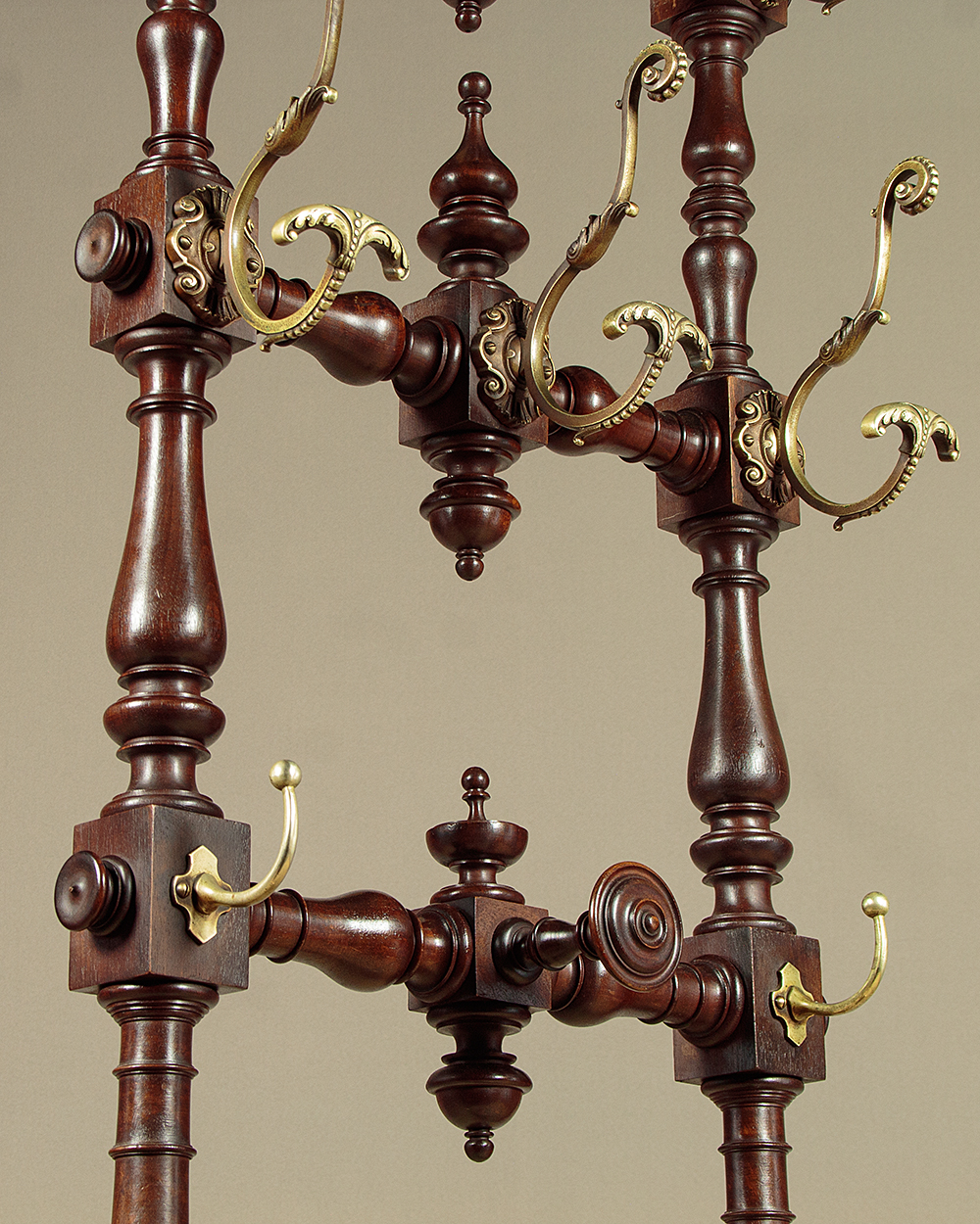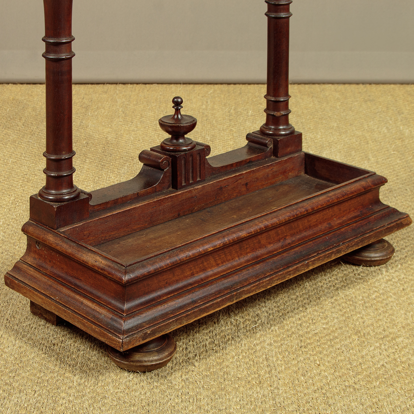Tall walnut hallstand c.1880. Six large and elaborately cast brass double looks for hats and coats etc plus two smaller hooks and a brass stay for sticks and umbrellas etc. Arranged on a crisply turned walnut frame adorned with turned finials and droppers. Deep moulded base on turned front feet. Excellent colour and condition, cleaned and waxed in our workshops.