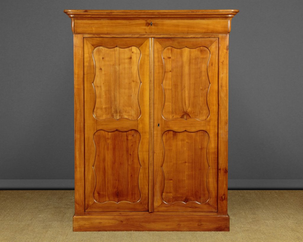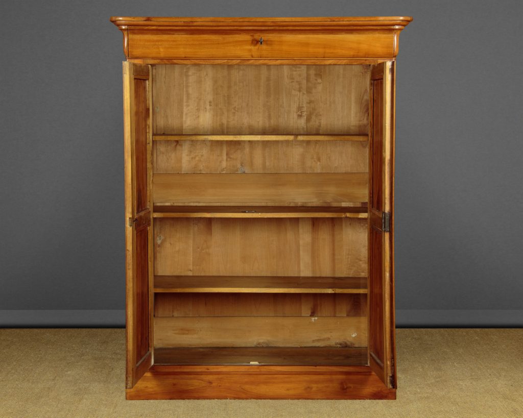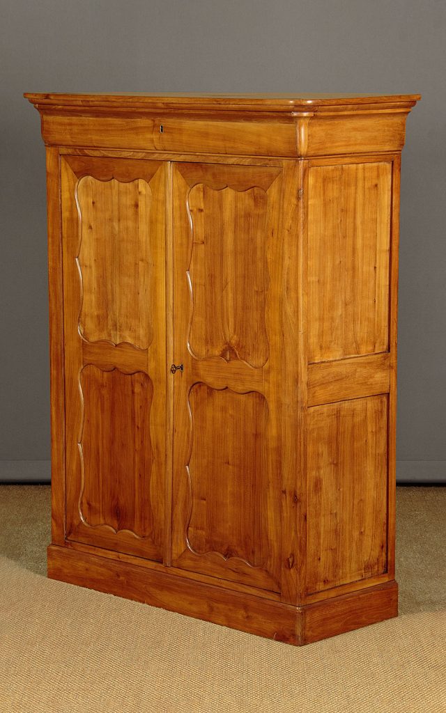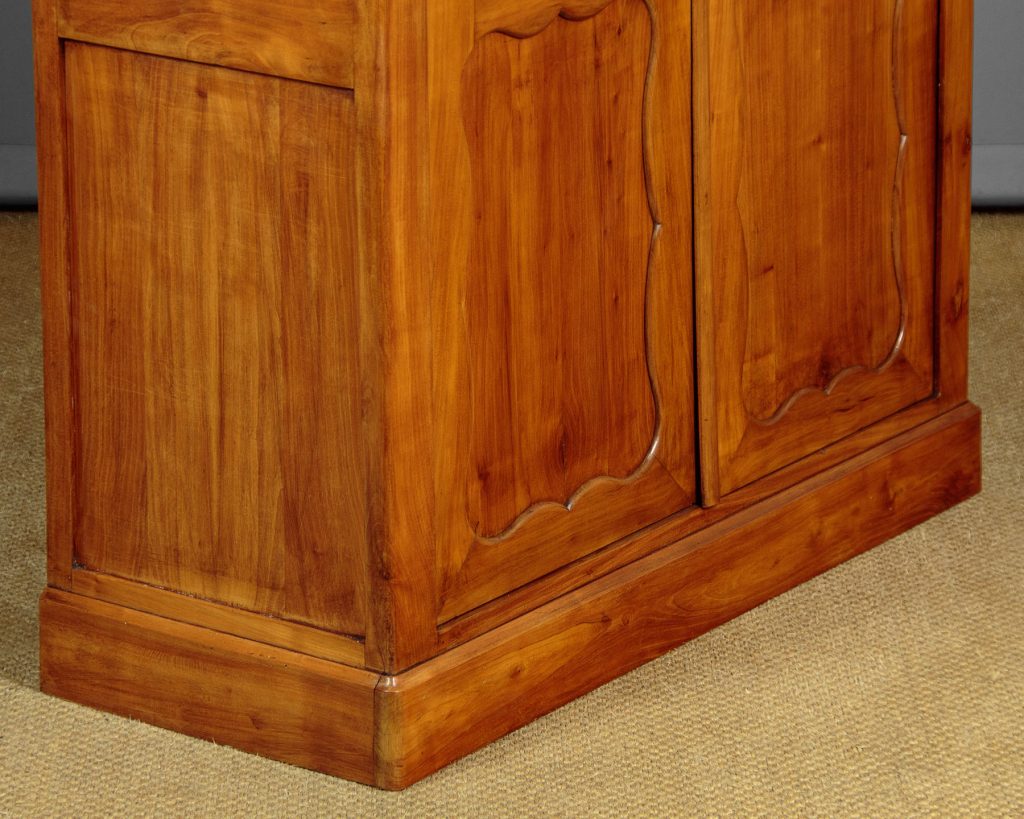 Useful French two door cupboard or kitchen cabinet c.1900. Polished top with a cleated and moulded edge over a single drawer. Two door cabinet fitted inside with three shelves (internal depth 13"). Lovely honey coloured cherrywood timbers. Moulded drawer front, continued on the sides of the cabinet and attractively shaped door panels. Square side panels and a moulded plinth. Excellent condition, cleaned and waxed in our workshops. Key supplied.