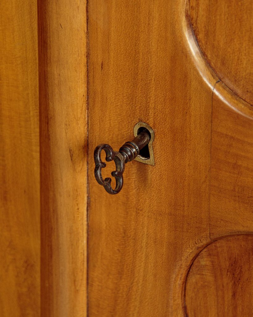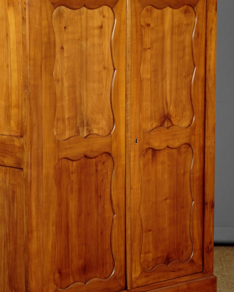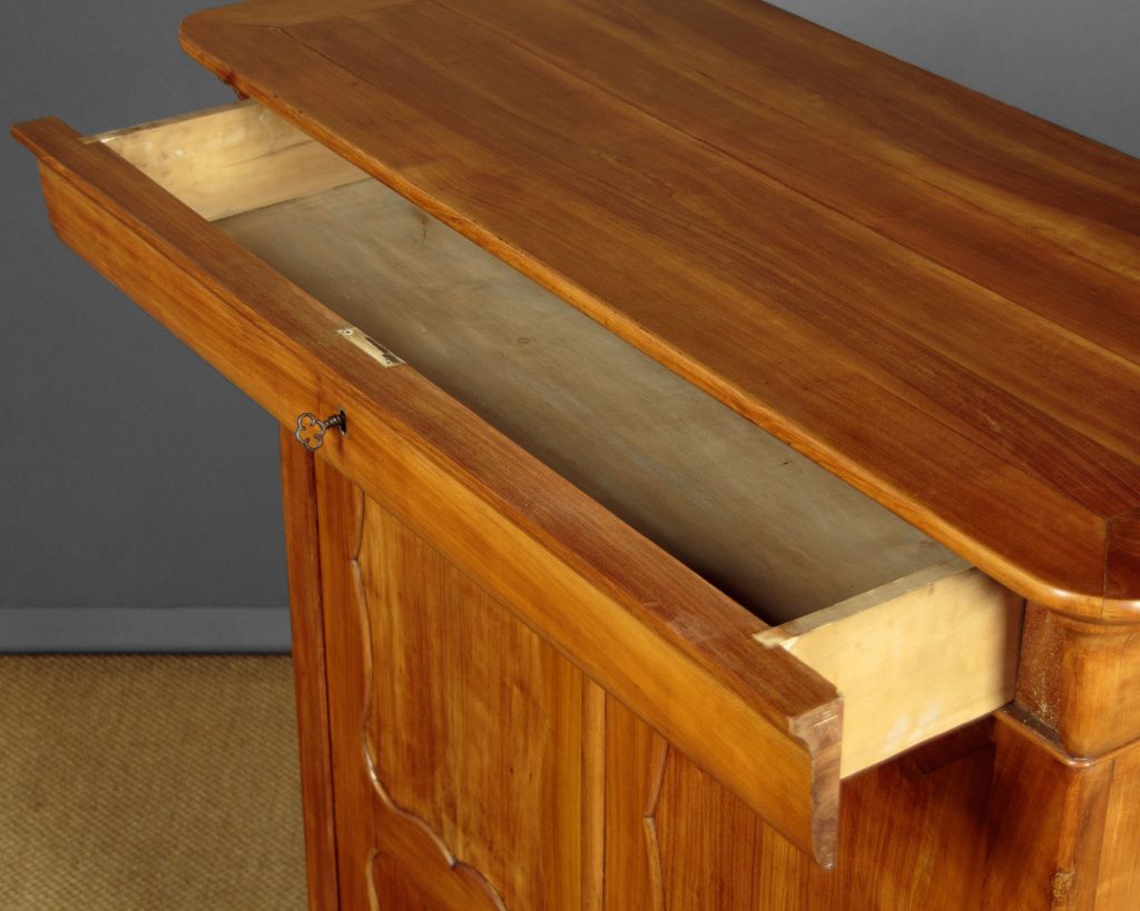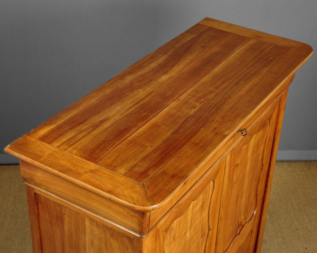 Useful French two door cupboard or kitchen cabinet c.1900. Polished top with a cleated and moulded edge over a single drawer. Two door cabinet fitted inside with three shelves (internal depth 13"). Lovely honey coloured cherrywood timbers. Moulded drawer front, continued on the sides of the cabinet and attractively shaped door panels. Square side panels and a moulded plinth. Excellent condition, cleaned and waxed in our workshops. Key supplied.