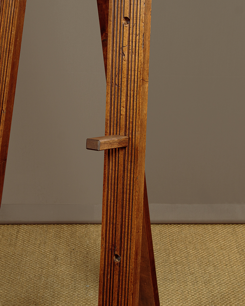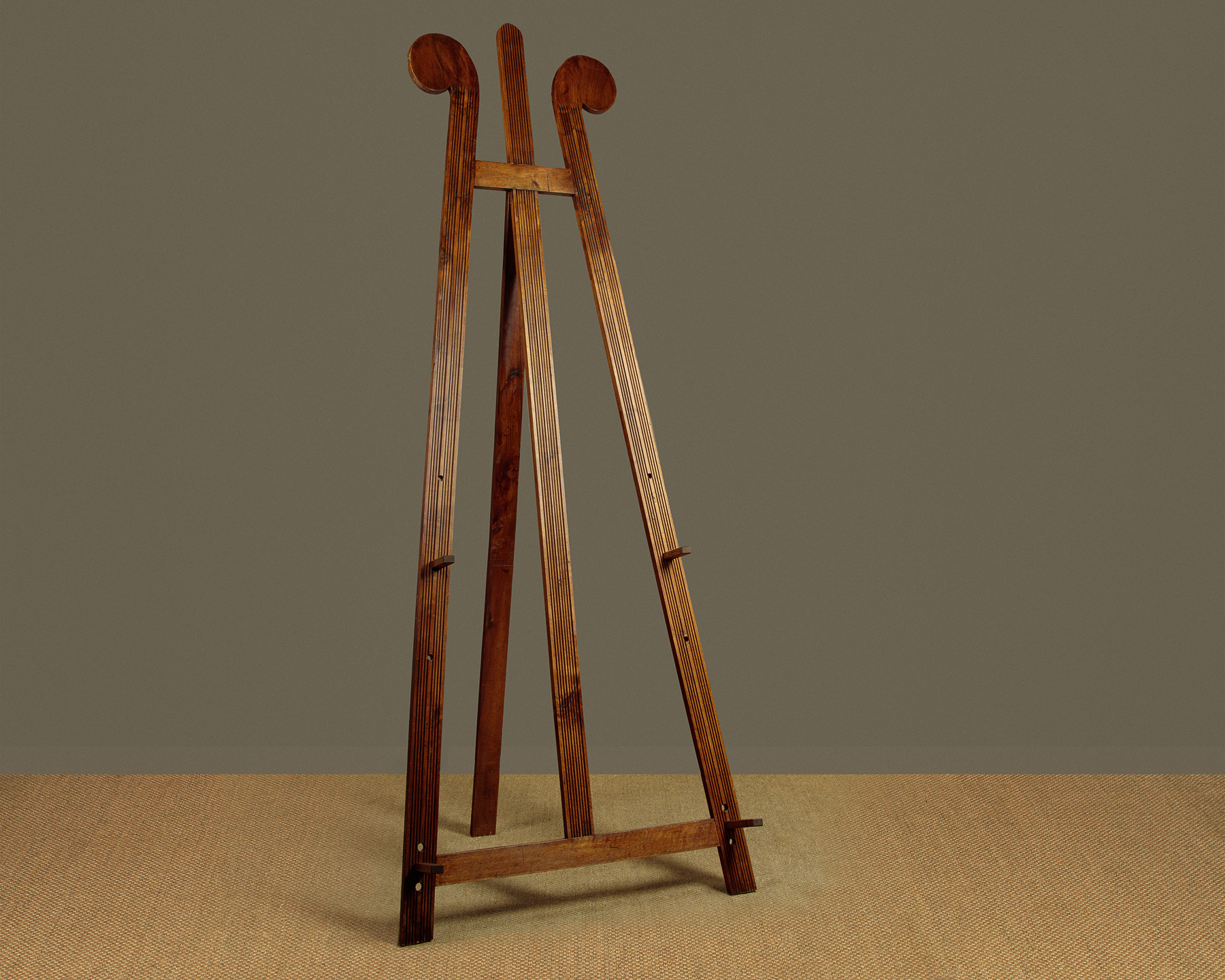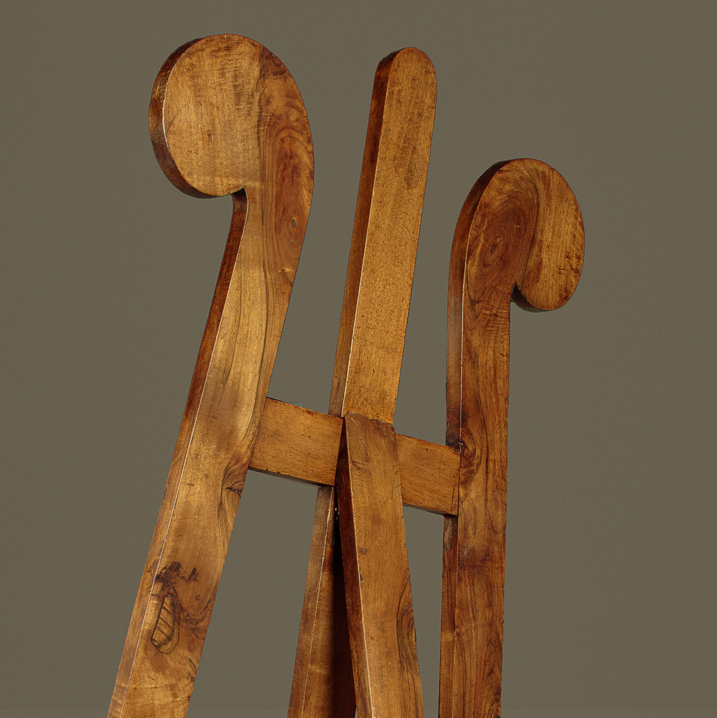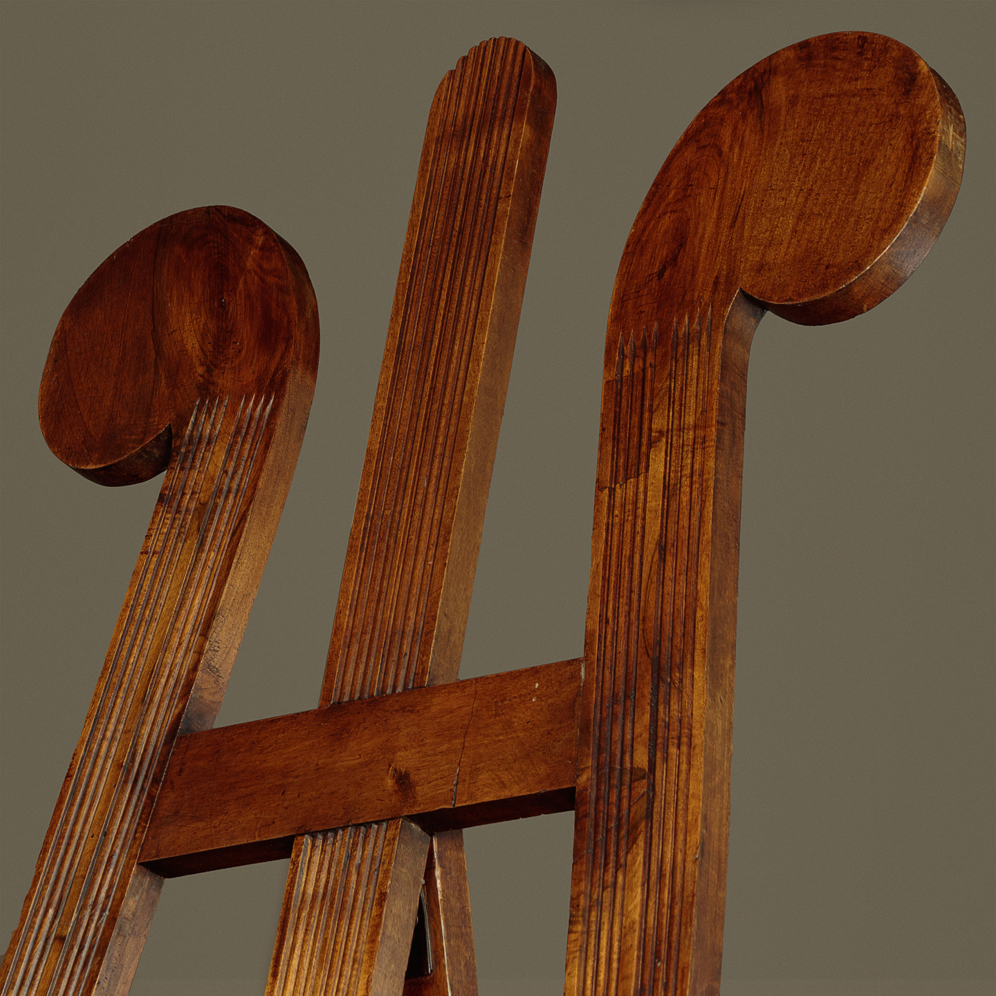 Unusually large walnut display easel c.1910. Standing 8 feet tall. Walnut A frame with hinged rear leg and two sets of wooden pegs to hold a very large canvas or a large dressing mirror perhaps. Lyre shaped tops and reeded detail. Excellent colour and condition, cleaned and waxed in our workshops.