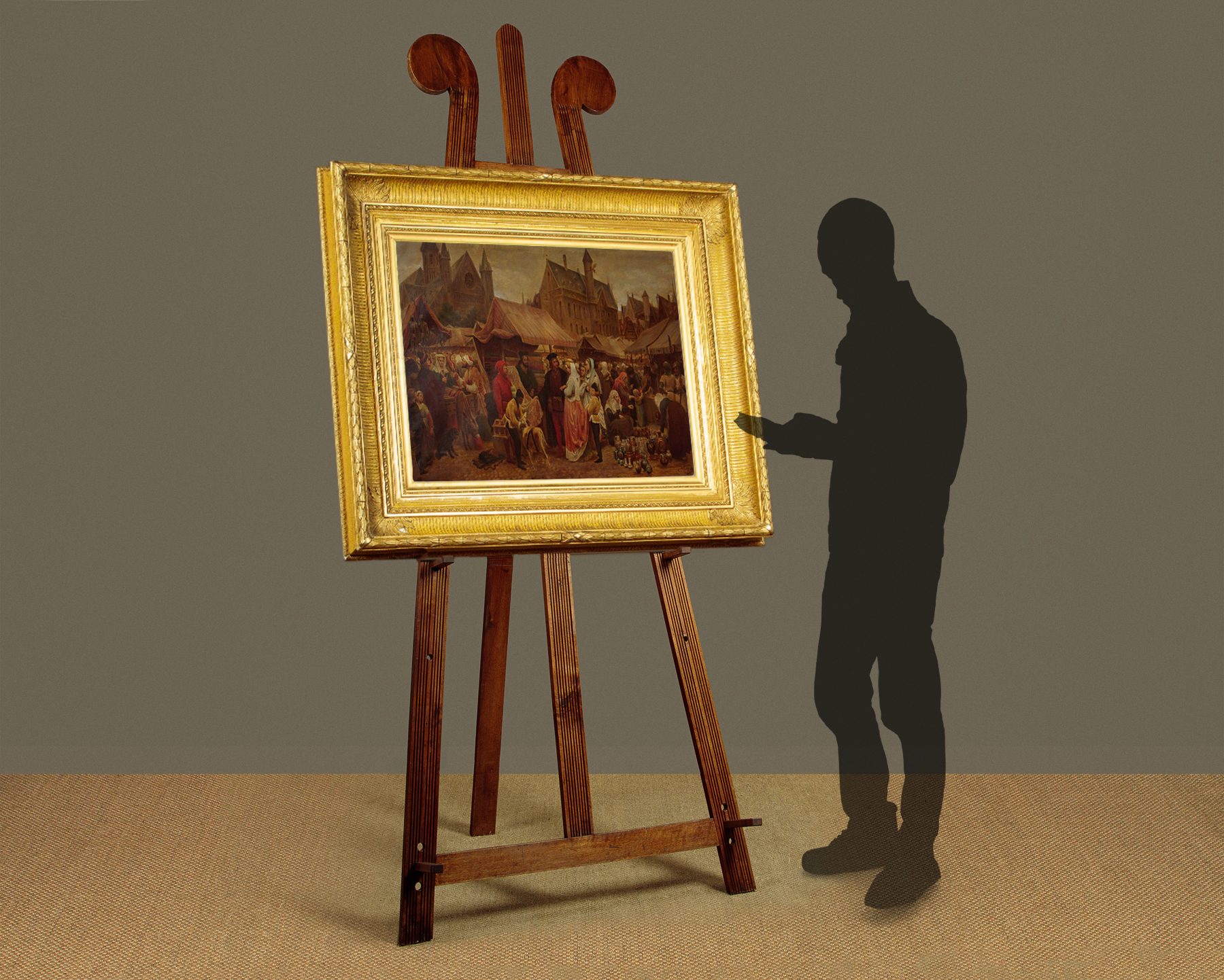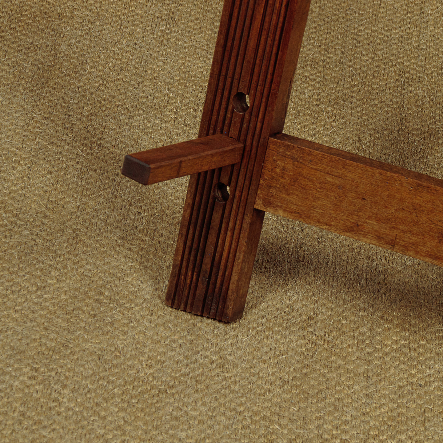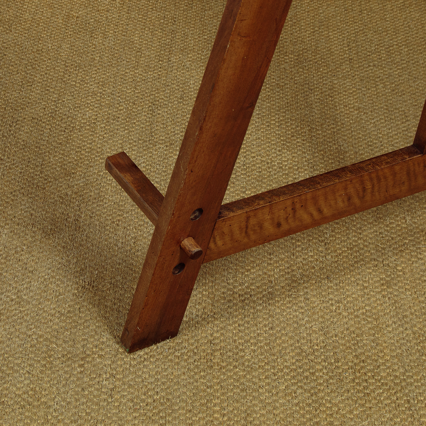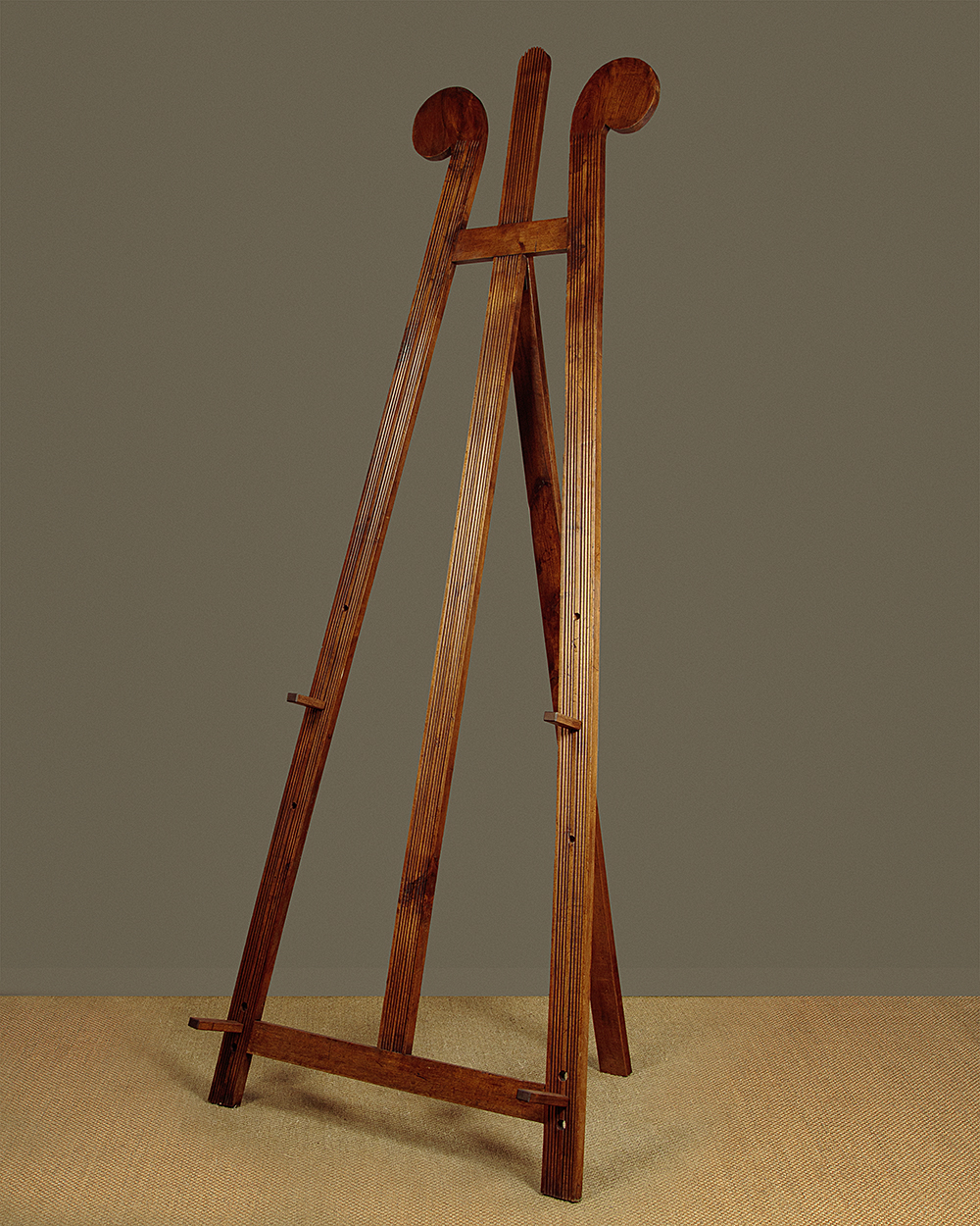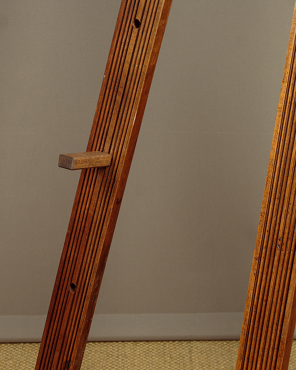 Unusually large walnut display easel c.1910. Standing 8 feet tall. Walnut A frame with hinged rear leg and two sets of wooden pegs to hold a very large canvas or a large dressing mirror perhaps. Lyre shaped tops and reeded detail. Excellent colour and condition, cleaned and waxed in our workshops.