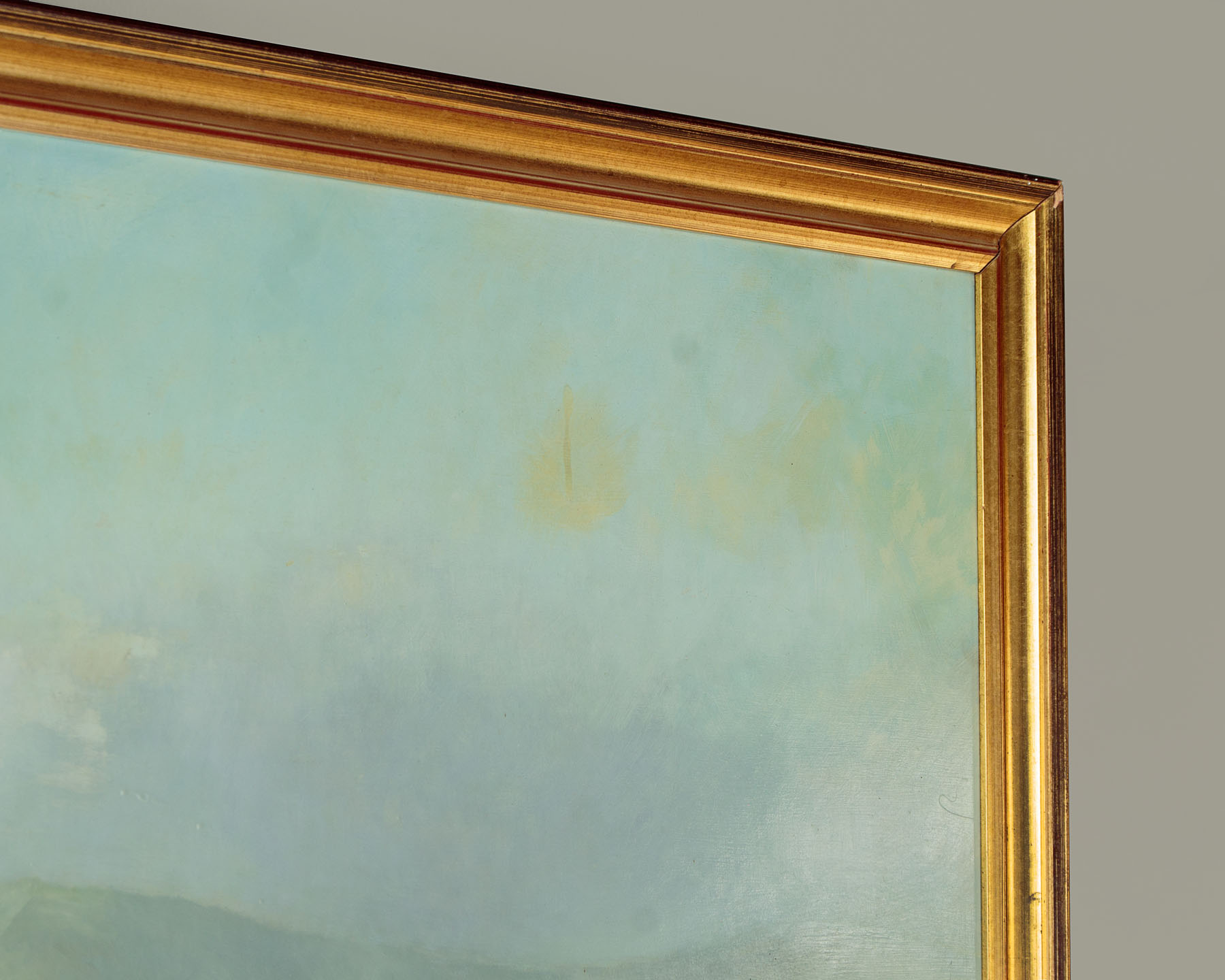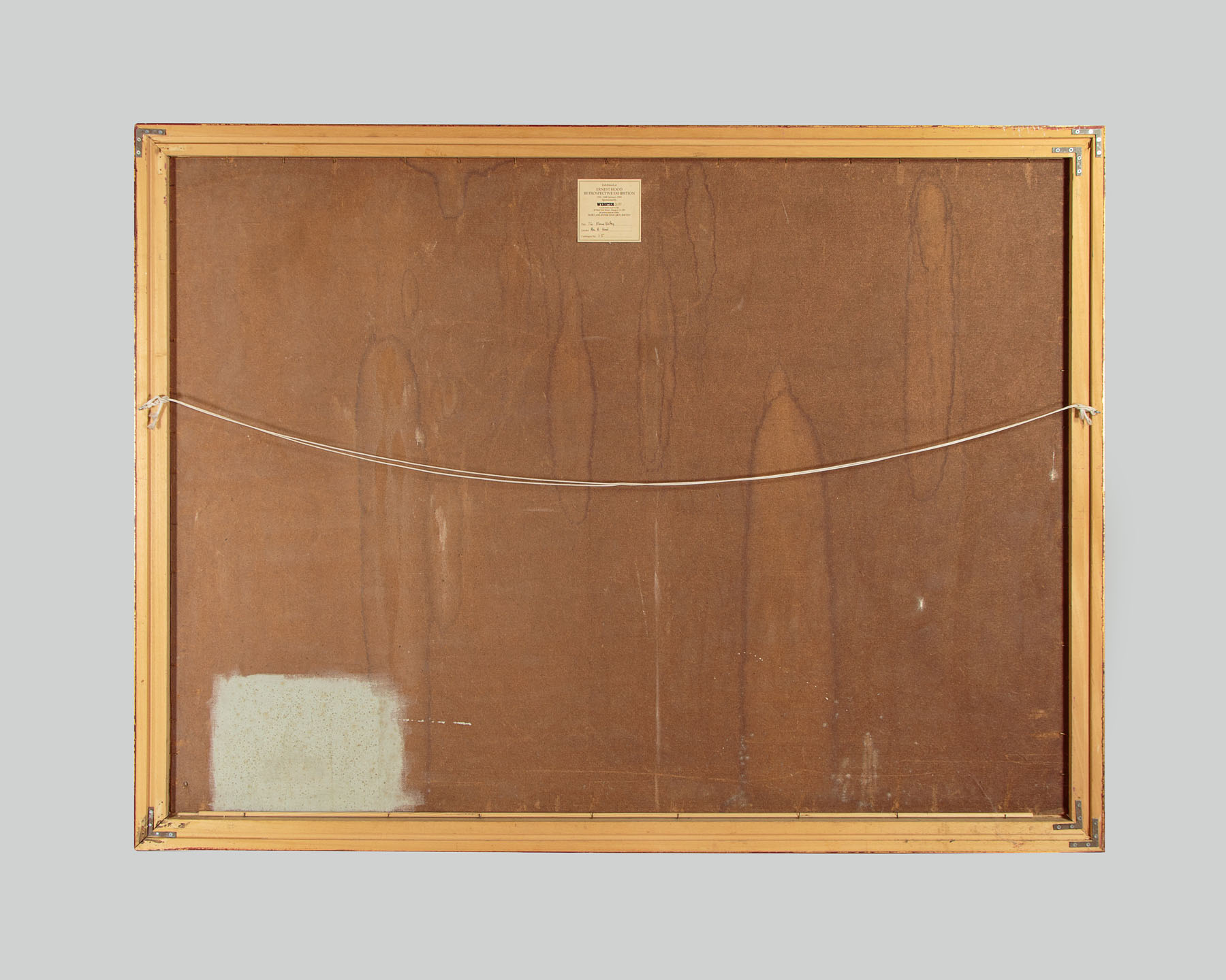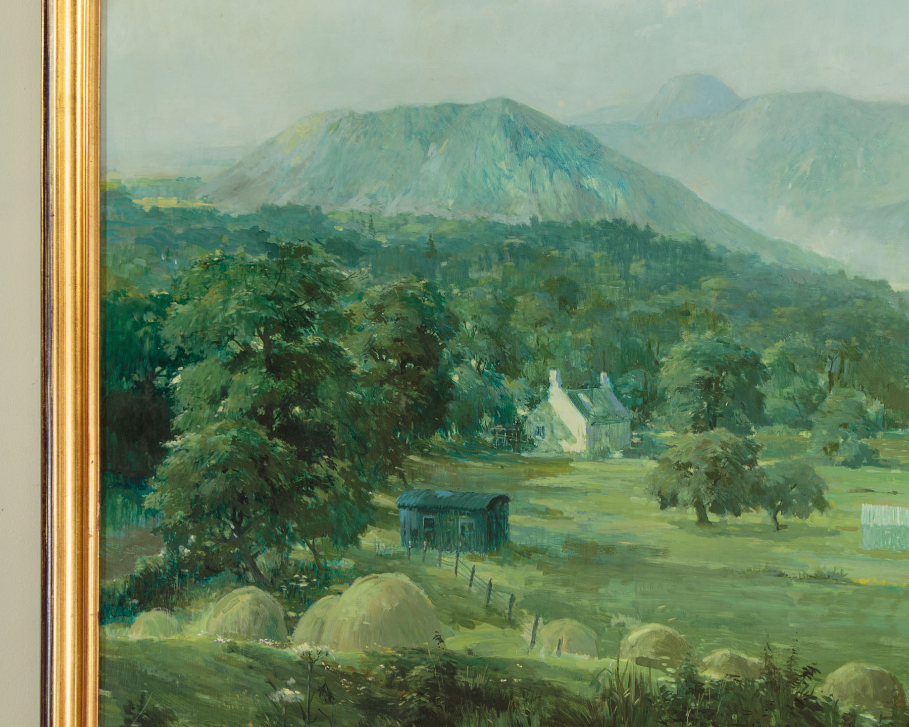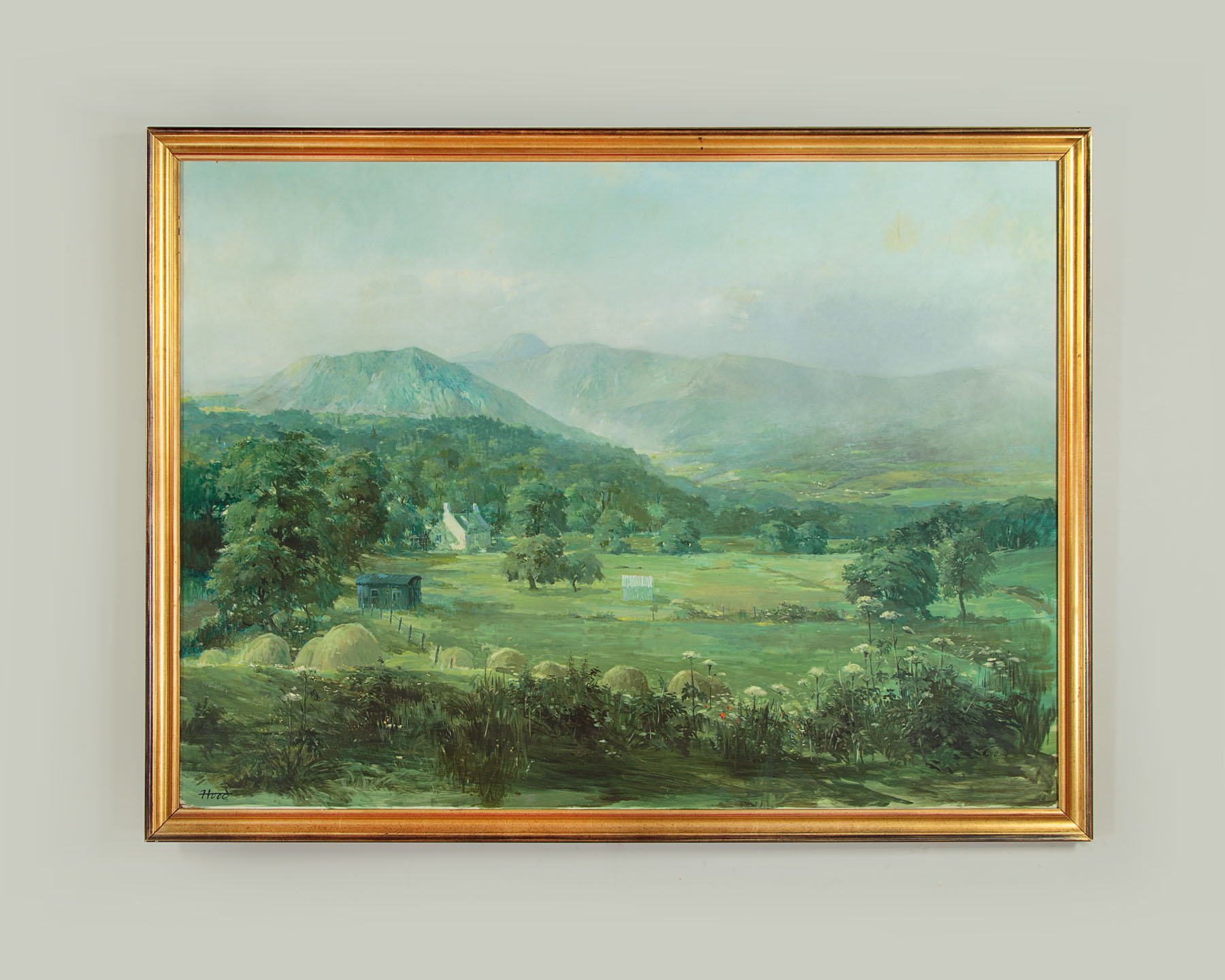 Impressively proportioned landscape painting in oil on board by the acclaimed Scottish artist Ernest Burnett Hood (1932 -1988). Measuring 62" x 45½" without the frame. A view of farmland in the Blane valley in Stirlingshire North of Glasgow, with the Campsie fells in the background and the distinctive shape of Dumgoyne Hill on the horizon. A mid summer scene below hazy blue sky with the trees in full leaf, cow parsley and poppies flowering and the hay cut and stacked into domed hayricks in the field. Clearly signed in the lower left hand corner. Exhibition label at the rear for The Ernest Hood Retrospective Exhibition (in association with the famous Glasgow gallery of Barclay Lennie), 12th-24th January 1990, Catalogue number 65. Pale mark in the sky toward the upper right hand corner of the painting and a little piece of damage to the board at the extreme lower left hand corner. Otherwise very good condition. Presented as found, ready to hang, in a moulded and gilded wooden frame.