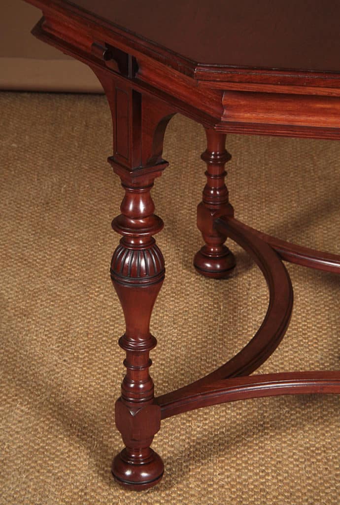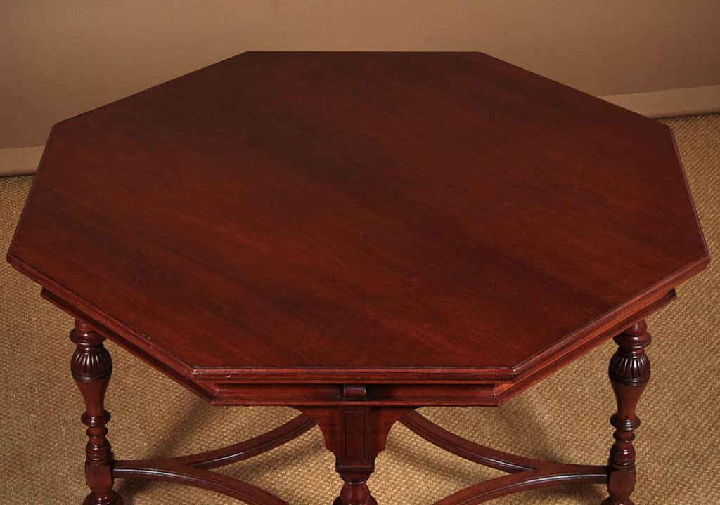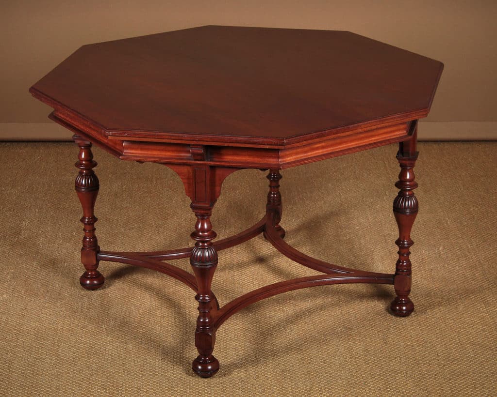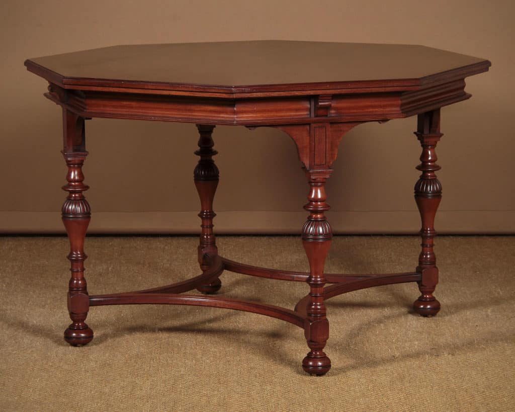 Exceptional quality 19th.c. walnut centre table, c.1890. Large 44½” octagonal top with molded edge above a shaped frieze, raised on a set of four turned baluster legs with curved lower stretchers and bun feet housing the original brass castors. Stamped to the underside with ‘Gillow & Co.’ and the registration number 15553. Excellent condition, cleaned and waxed in our workshops.