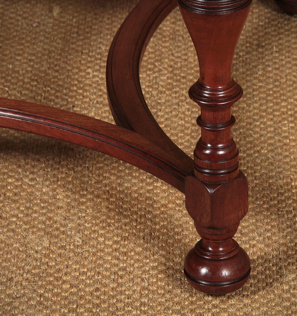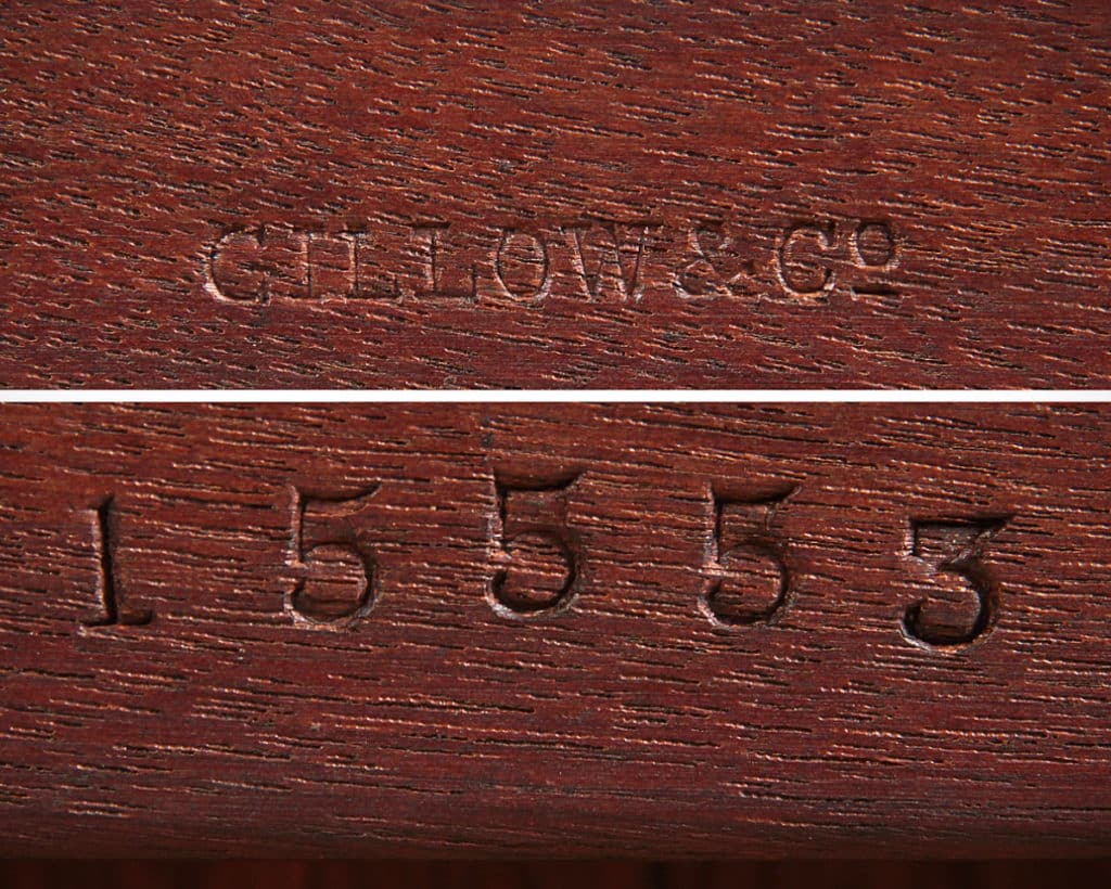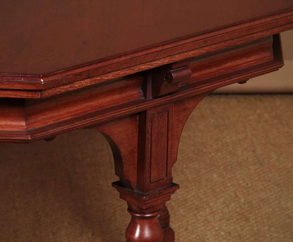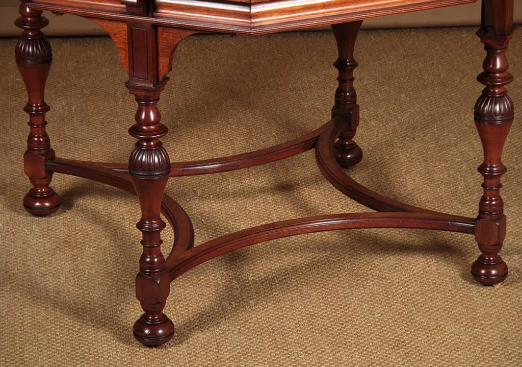 Exceptional quality 19th.c. walnut centre table, c.1890. Large 44½” octagonal top with molded edge above a shaped frieze, raised on a set of four turned baluster legs with curved lower stretchers and bun feet housing the original brass castors. Stamped to the underside with ‘Gillow & Co.’ and the registration number 15553. Excellent condition, cleaned and waxed in our workshops.