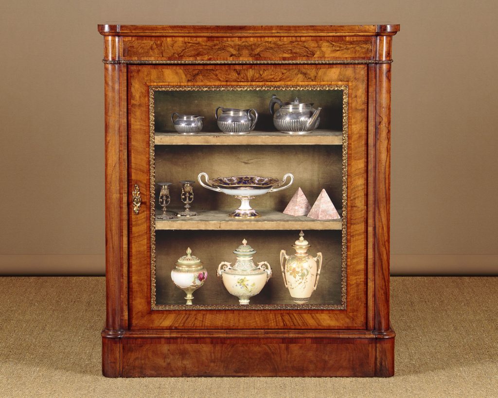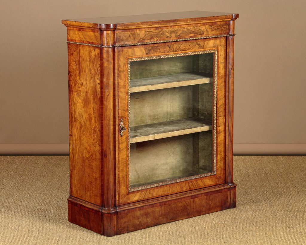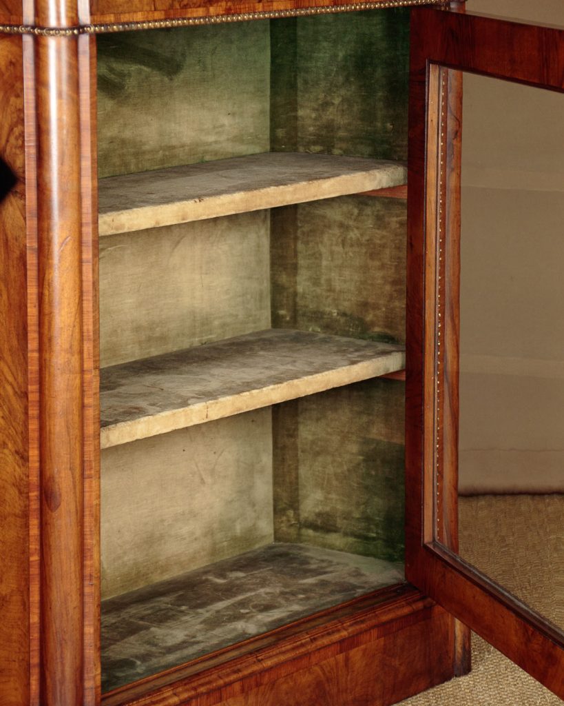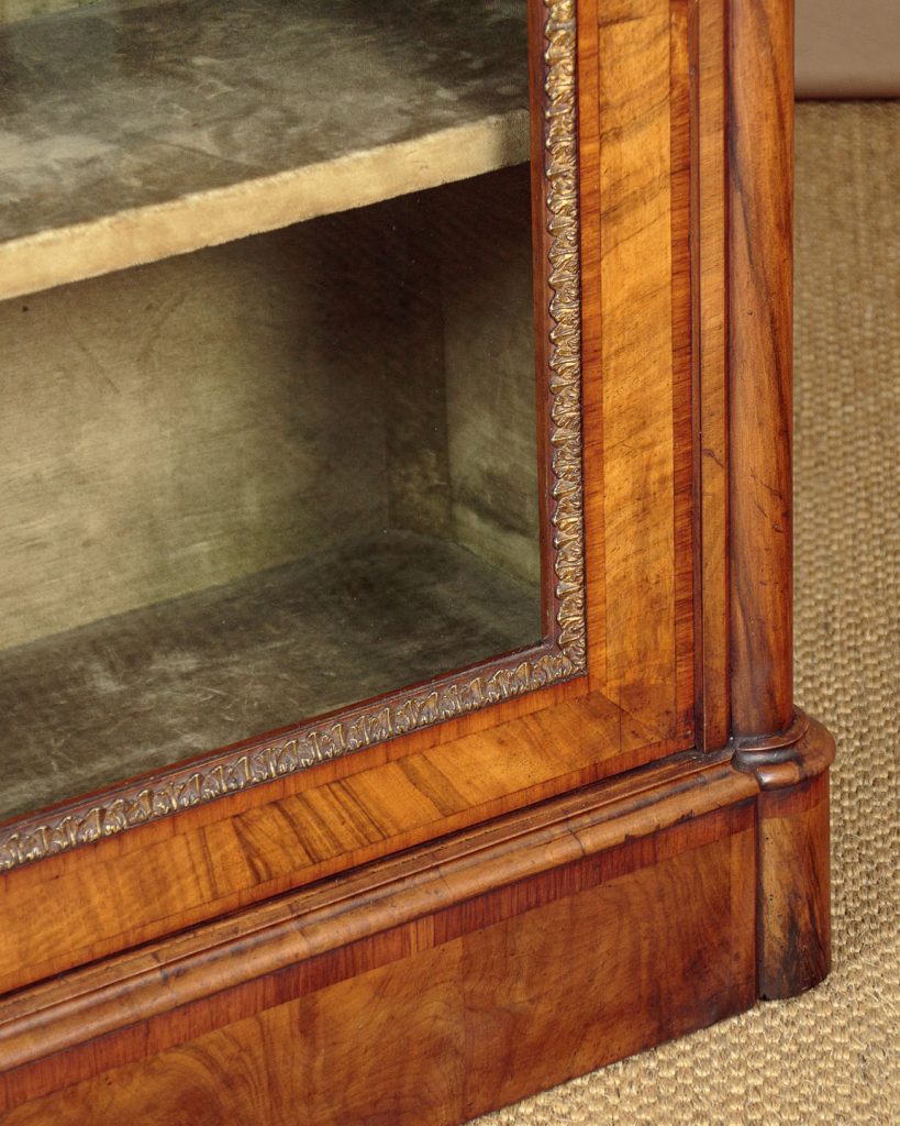 Fine quality late 19th.c. English burr walnut pier cabinet c.1880. Just 36" wide, single glazed door cabinet fitted inside with two shelves (internal depth 10") and lined in green velvet. Particularly well figured burr walnut veneers with satinwood crossbanded borders to the top, front and sides. Faux column pilasters to the front corners, gilt ormolu mouldings above the door and around the glazed panel. Raised on a moulded plinth. Excellent colour and condition, cleaned and waxed in our workshops. Key supplied.