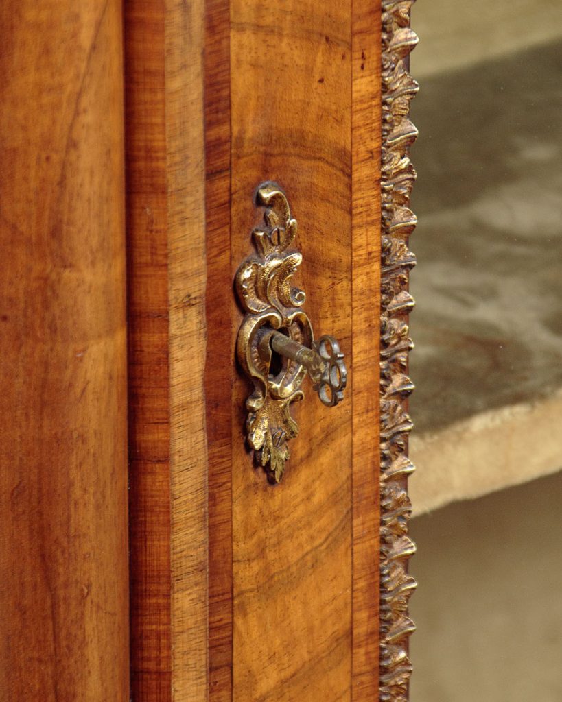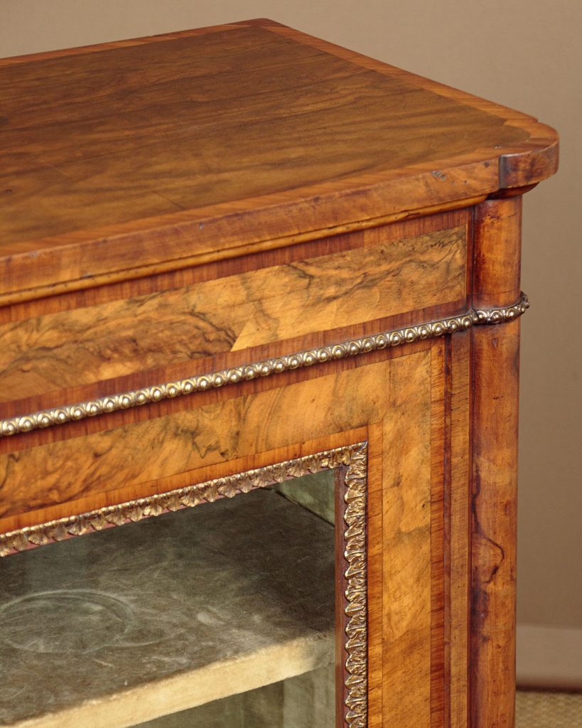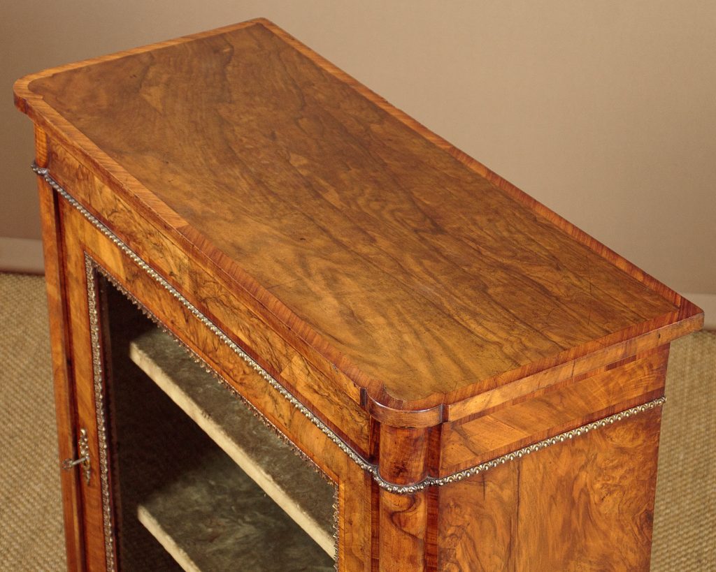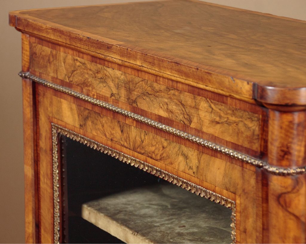 Fine quality late 19th.c. English burr walnut pier cabinet c.1880. Just 36" wide, single glazed door cabinet fitted inside with two shelves (internal depth 10") and lined in green velvet. Particularly well figured burr walnut veneers with satinwood crossbanded borders to the top, front and sides. Faux column pilasters to the front corners, gilt ormolu mouldings above the door and around the glazed panel. Raised on a moulded plinth. Excellent colour and condition, cleaned and waxed in our workshops. Key supplied.