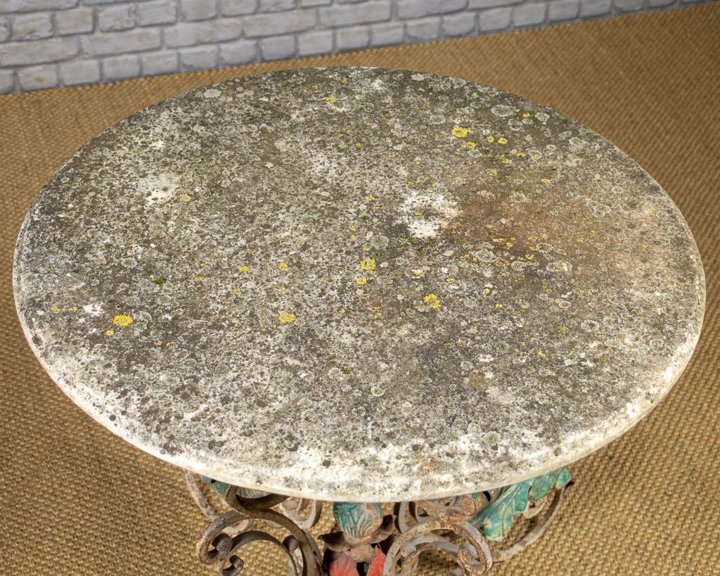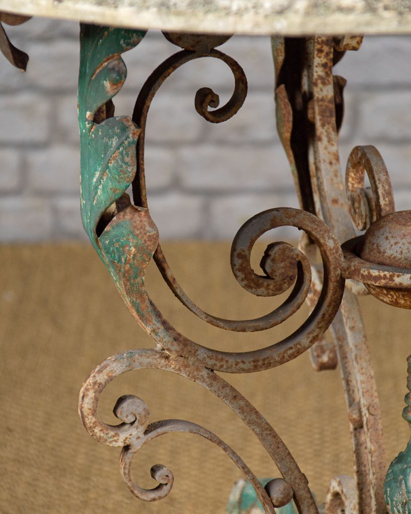 Unusual wrought iron and marble top garden or conservatory table c.1930. 31" white marble top with a moulded edge on a remarkable shapely base in scrolling wrought iron with applied acanthus leaf decoration to the legs and a red flower head and pointed finial at the centre. Presented as found, the top weathered and overgrown with lichen and obvious wear to the base.