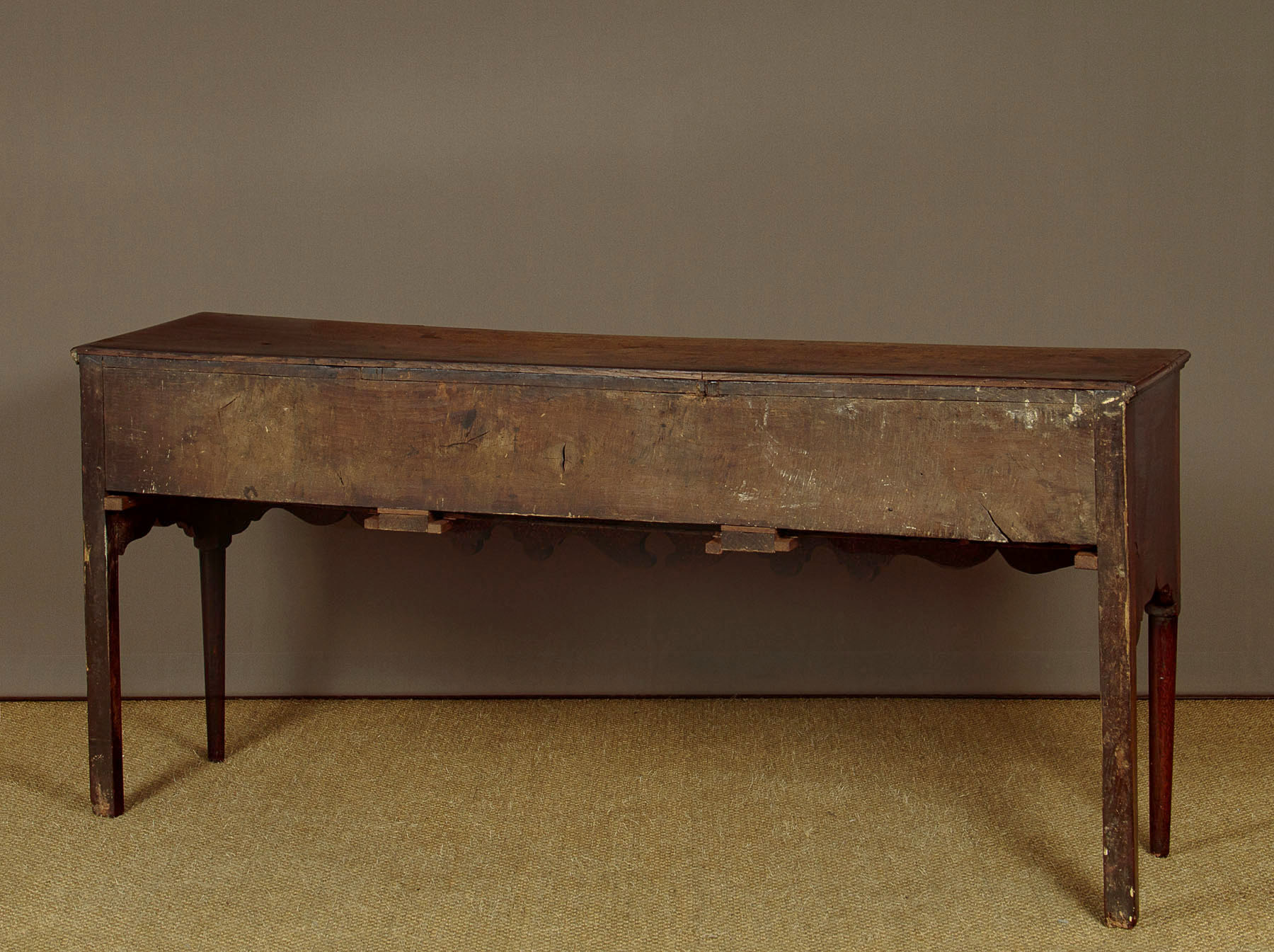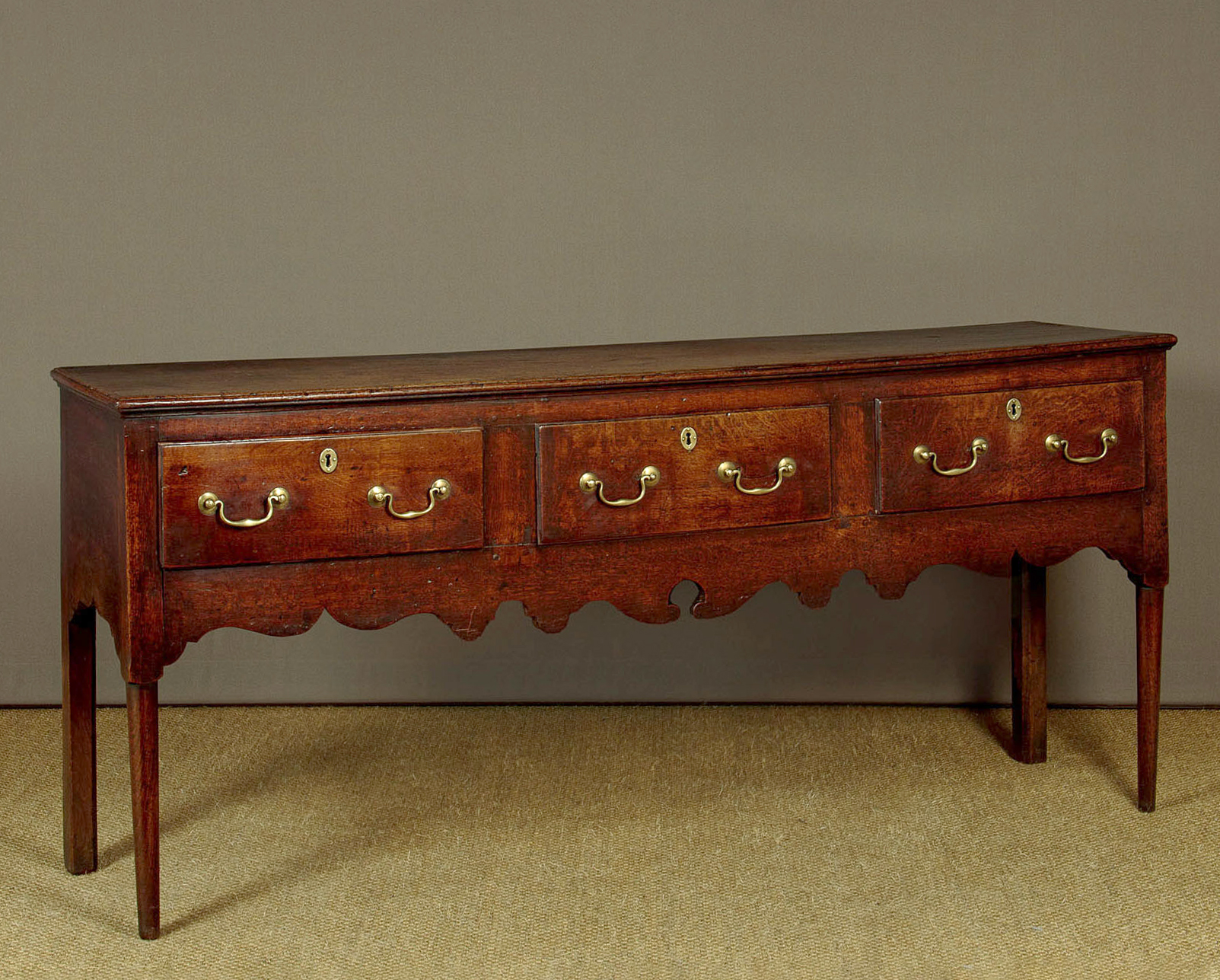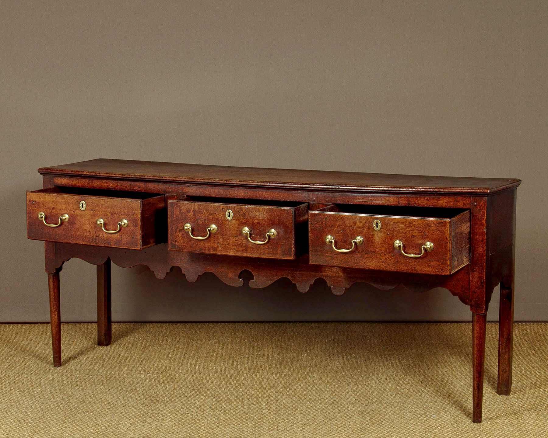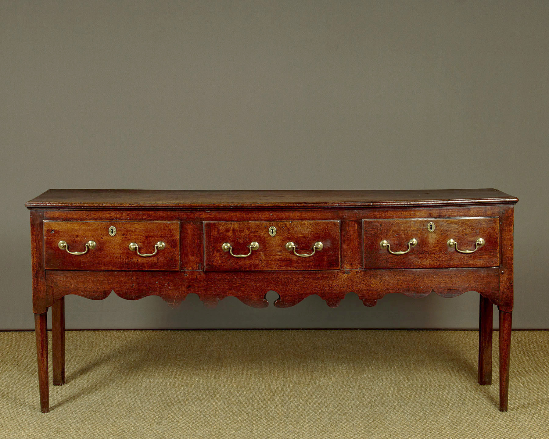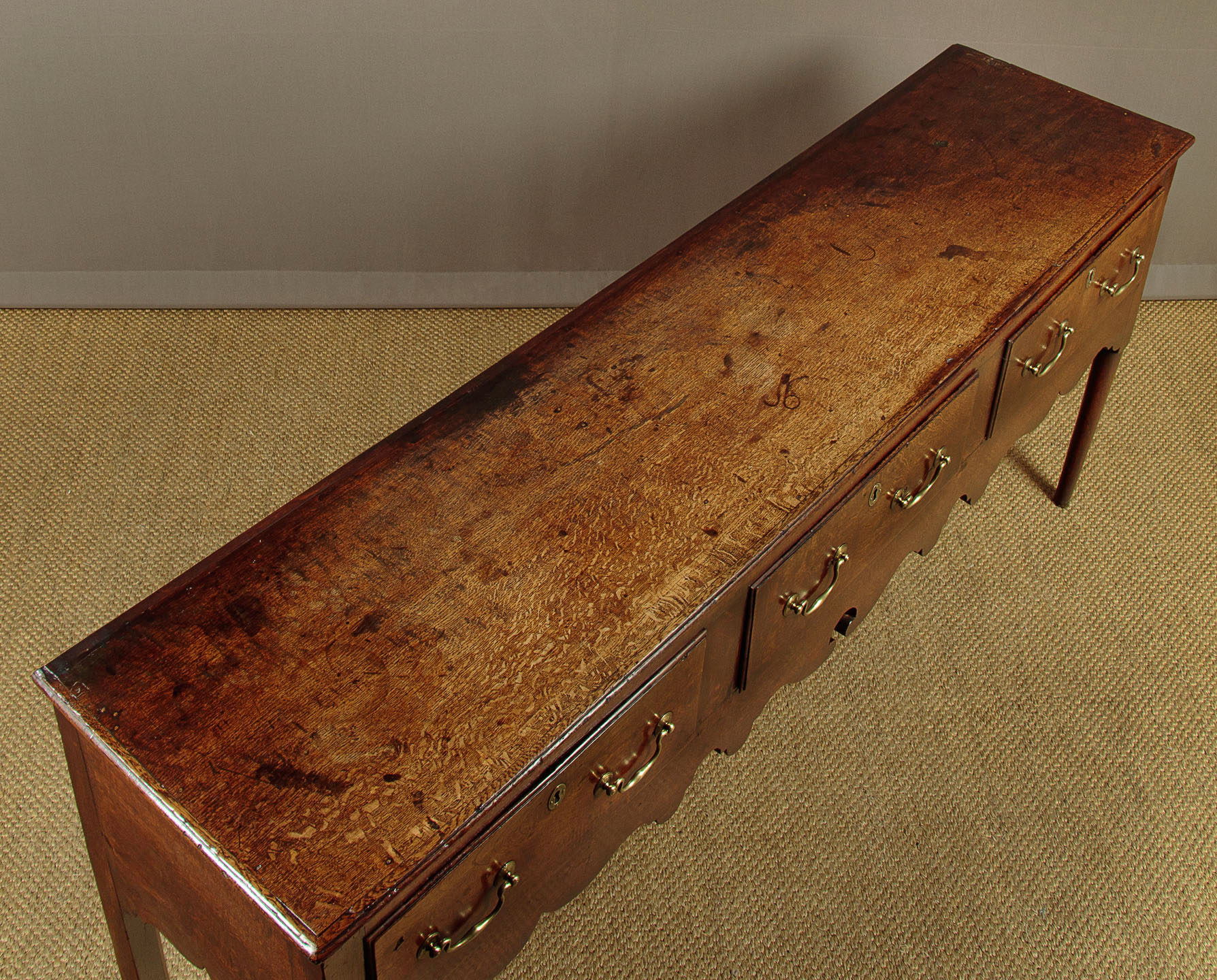 Late 18th.c. oak Welsh dresser base from the Southern Welsh borders c.1780. Single piece top with an applied moulded edge. Over three oak lined drawers with brass swan neck handles and a moulded edge to the drawer fronts. Particularly attractive shaped apron below the drawers and also continued on the sides. Raised on turned and tapering front legs, the straight rear stiles with a chamfered inner edge typical of the period. Oak sides and backboard. Some old marks to the top and two small repairs to the moulding at the front edge. Generally excellent colour and condition, cleaned and waxed in our workshops.