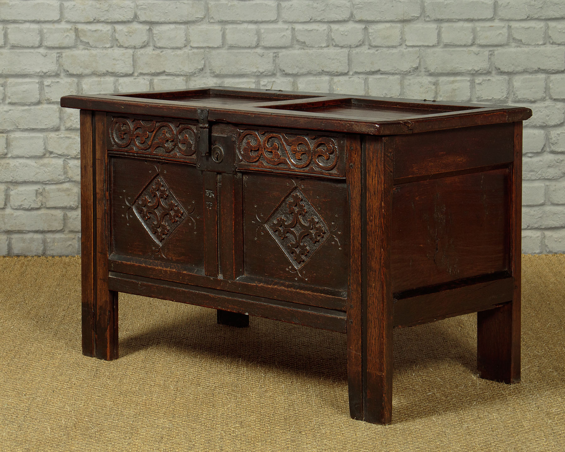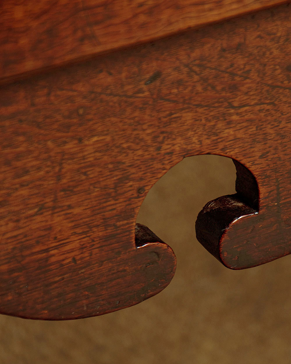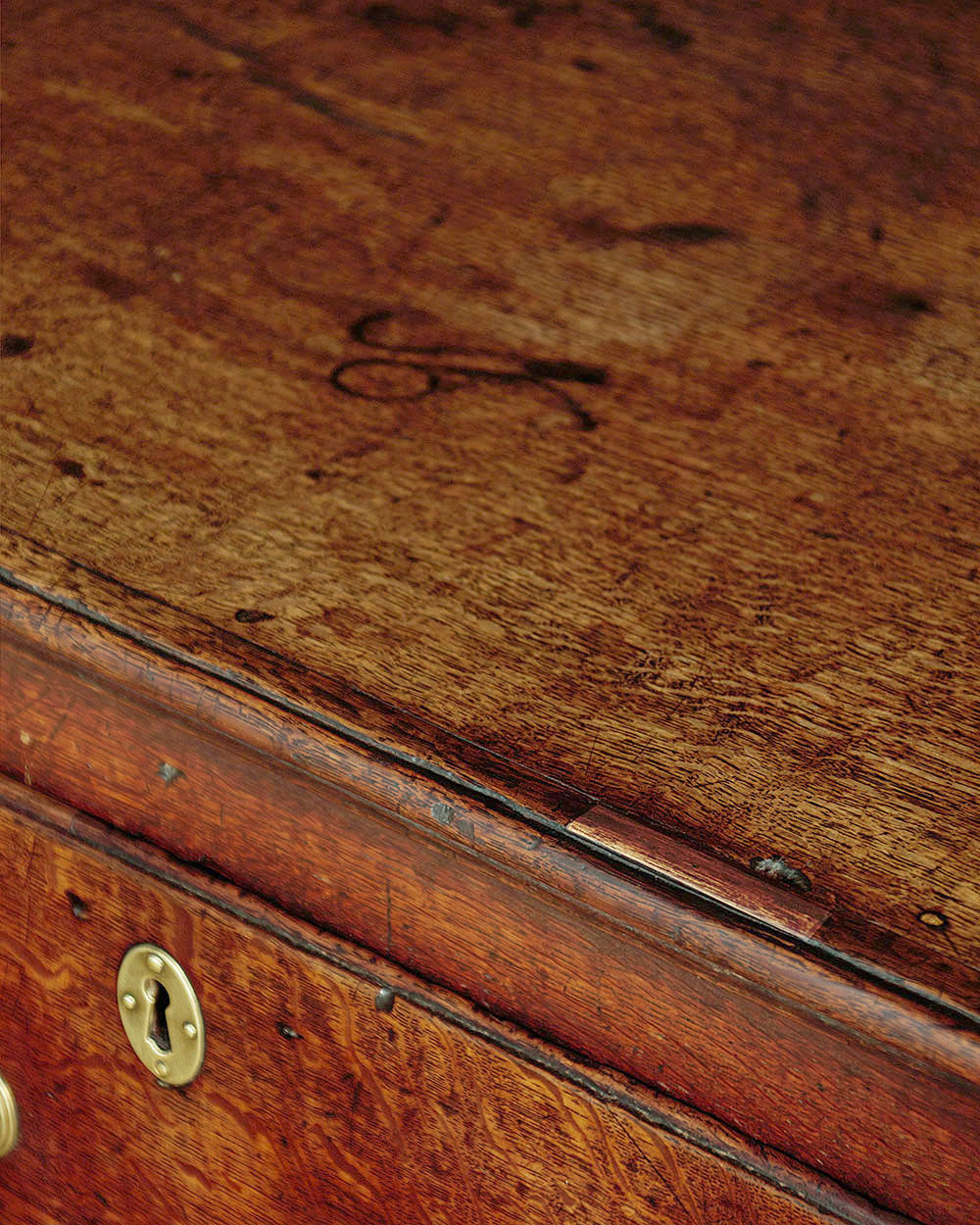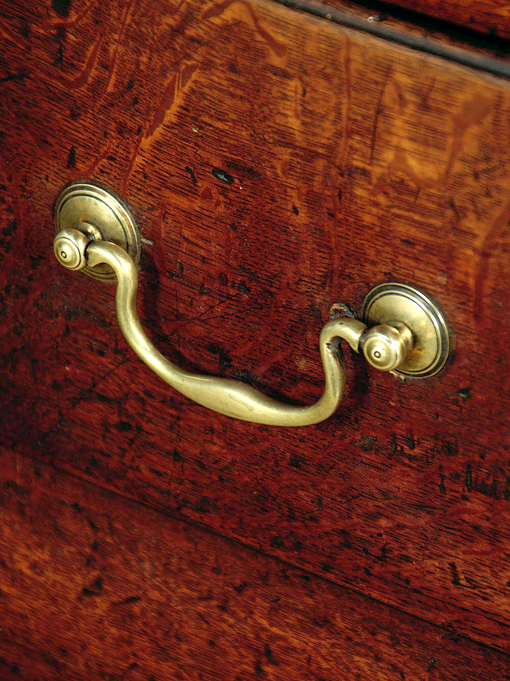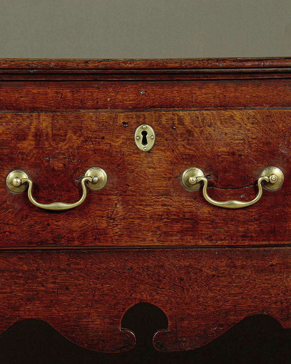 Late 18th.c. oak Welsh dresser base from the Southern Welsh borders c.1780. Single piece top with an applied moulded edge. Over three oak lined drawers with brass swan neck handles and a moulded edge to the drawer fronts. Particularly attractive shaped apron below the drawers and also continued on the sides. Raised on turned and tapering front legs, the straight rear stiles with a chamfered inner edge typical of the period. Oak sides and backboard. Some old marks to the top and two small repairs to the moulding at the front edge. Generally excellent colour and condition, cleaned and waxed in our workshops.