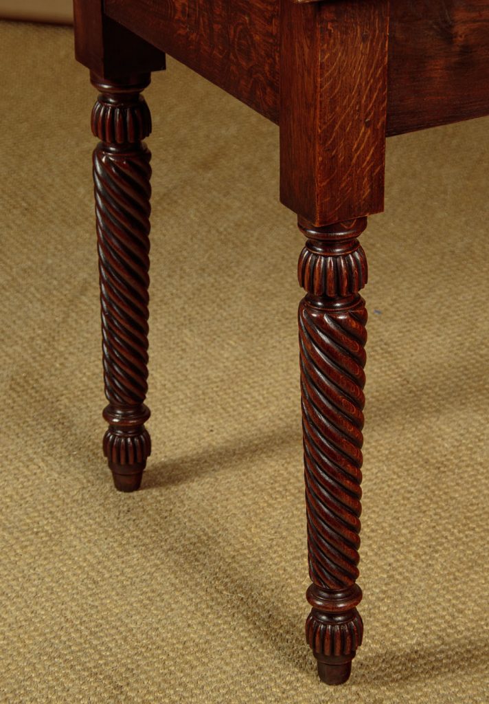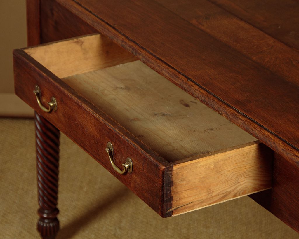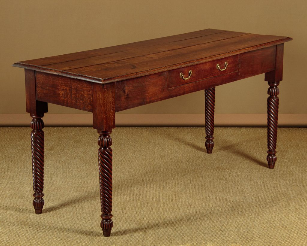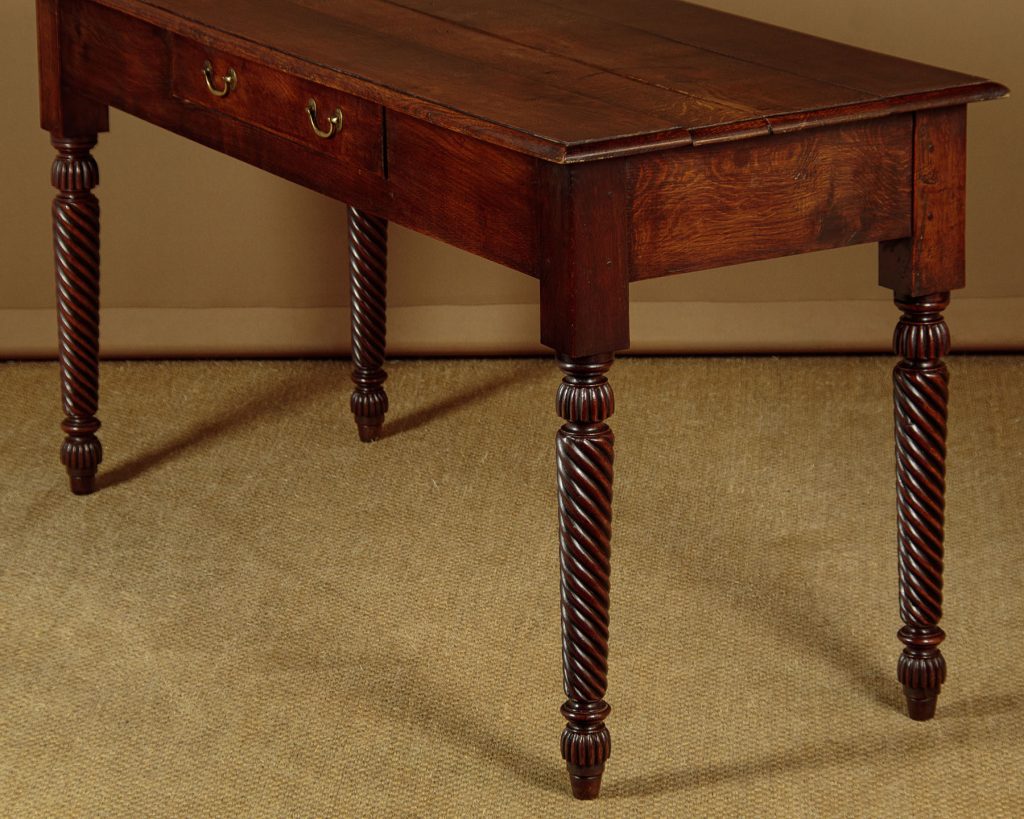 Mid 19th.c. Welsh oak serving side table, South Wales c.1870. Solid oak four plank top with moulded edge over a single central drawer with original brass handles. Raised on lovely tapering and twist carved legs with turned and reeded tops repeated in the feet. Excellent condition, cleaned and waxed in our workshops.