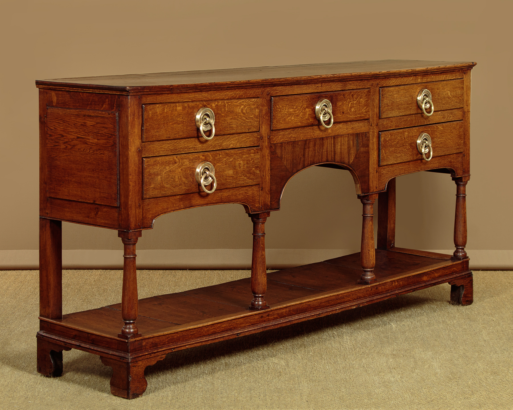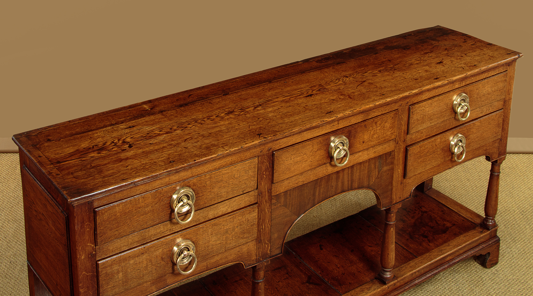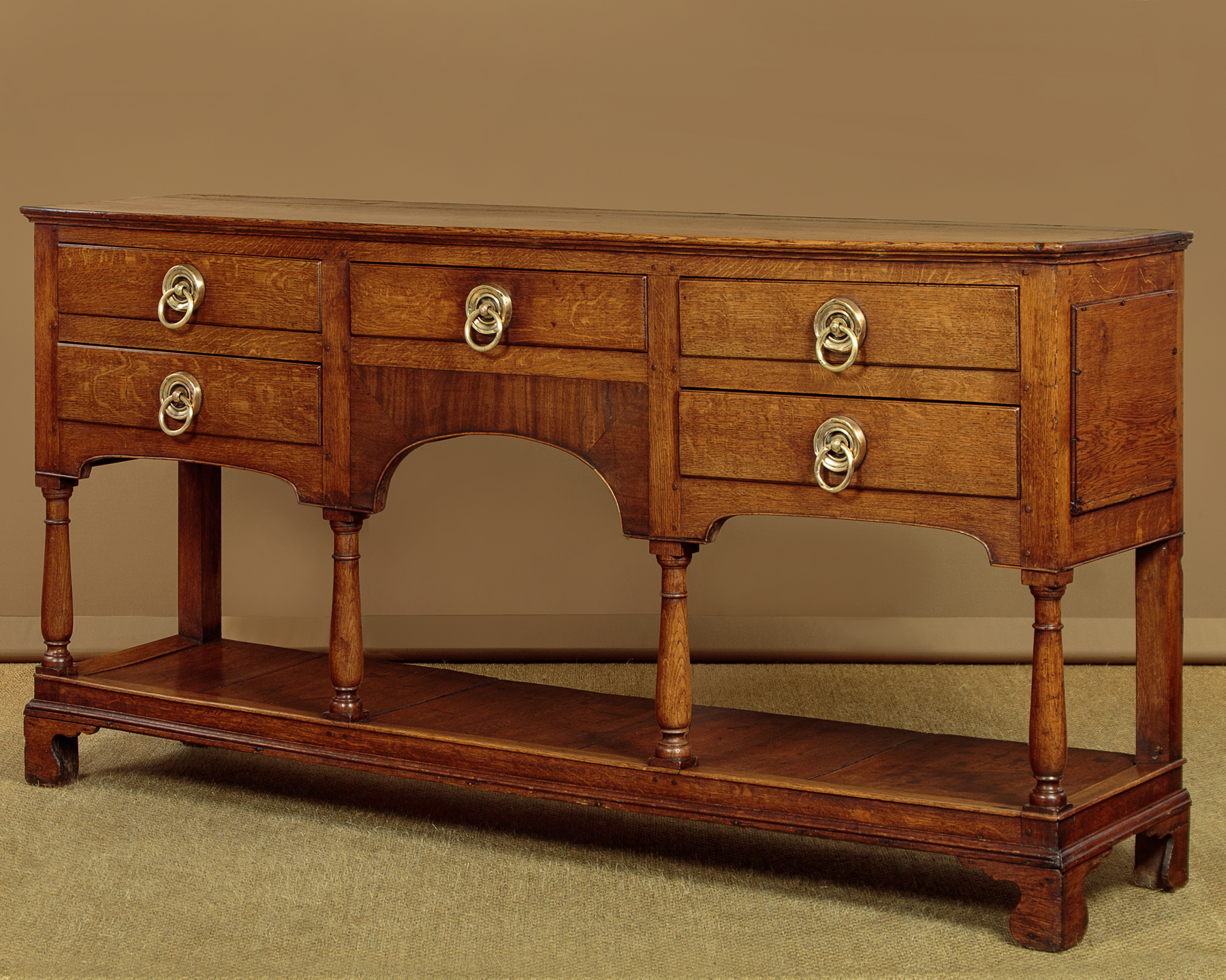 Early 19th.c. oak Welsh dresser base, South Wales c.1810. Solid oak top (note the 15" deep front board) with an applied moulding to the underside of the edge. Over five drawers with a simple moulded detail to the drawer fronts and splendid original oversized brass hoop handles and backplates. Triple arch apron, the taller centre arch having a mahogany crossbanded surround, with a cockbeaded bottom edge. Raised on four nicely turned column front legs over an open potboard display shelf with oak boards. Applied moulding around the base and shaped bracket feet to the front and sides. Oak panelled sides, with the moulded edge repeated from the drawer fronts. Very good colour and condition, cleaned and waxed in our workshops.