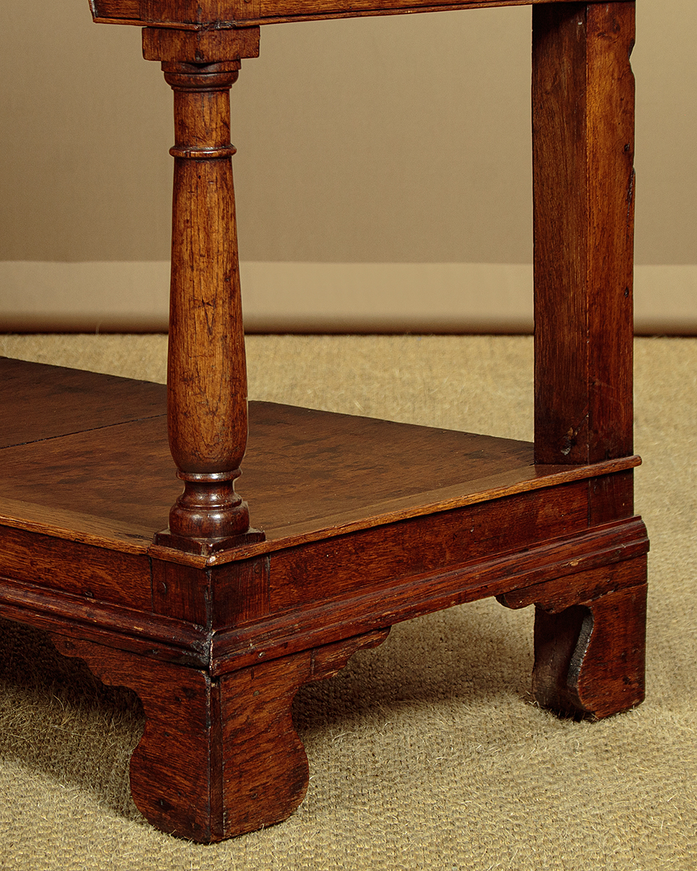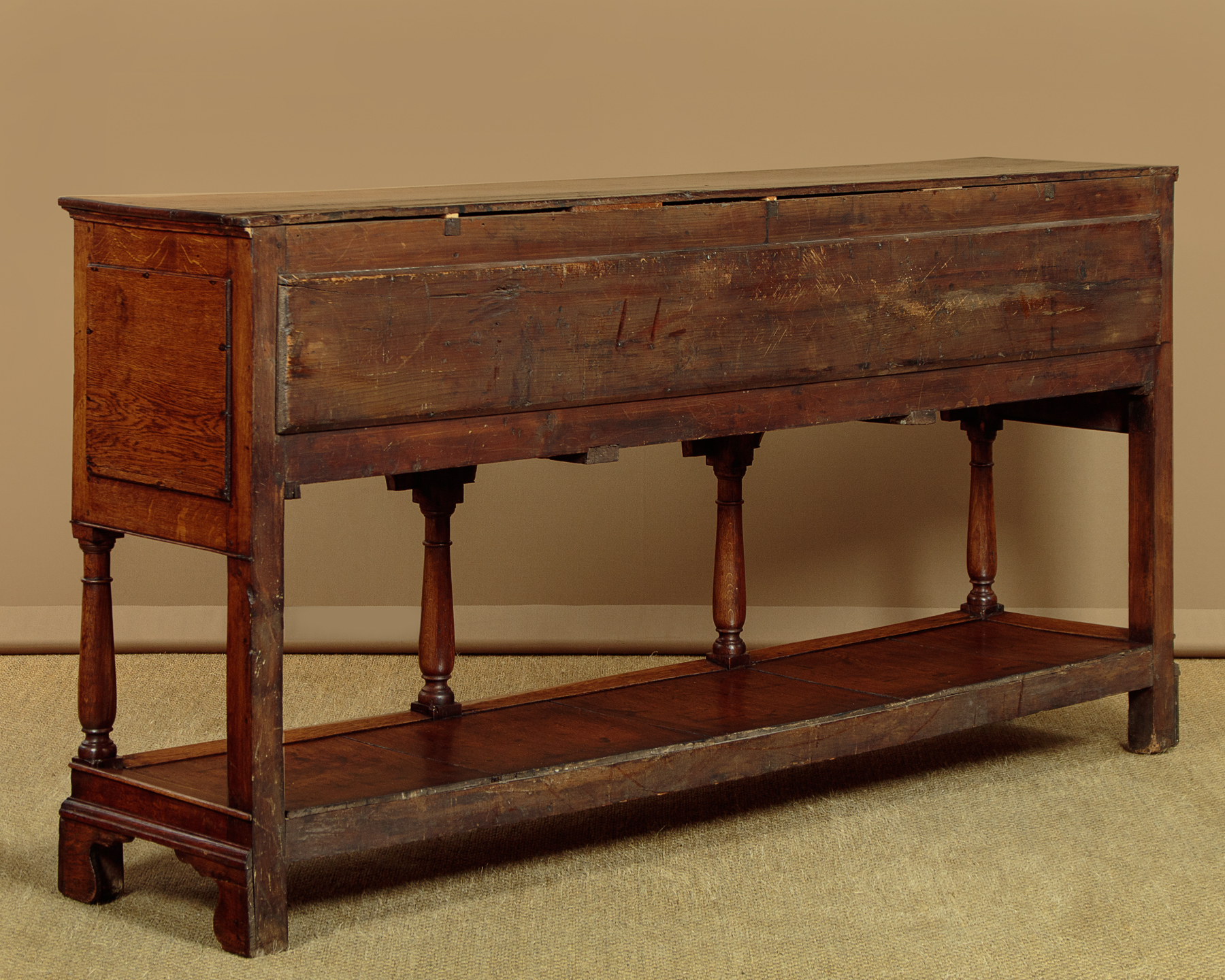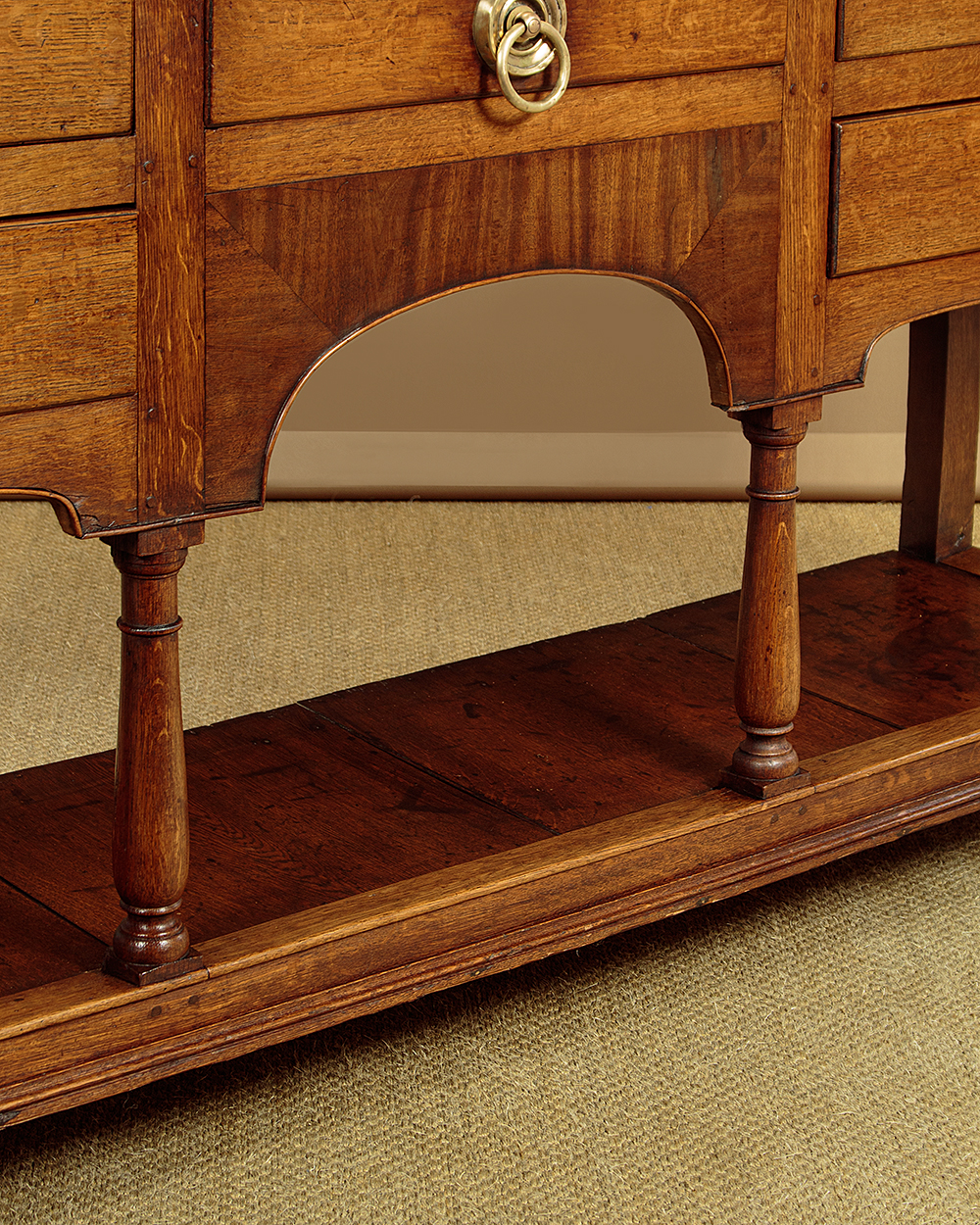 Early 19th.c. oak Welsh dresser base, South Wales c.1810. Solid oak top (note the 15" deep front board) with an applied moulding to the underside of the edge. Over five drawers with a simple moulded detail to the drawer fronts and splendid original oversized brass hoop handles and backplates. Triple arch apron, the taller centre arch having a mahogany crossbanded surround, with a cockbeaded bottom edge. Raised on four nicely turned column front legs over an open potboard display shelf with oak boards. Applied moulding around the base and shaped bracket feet to the front and sides. Oak panelled sides, with the moulded edge repeated from the drawer fronts. Very good colour and condition, cleaned and waxed in our workshops.